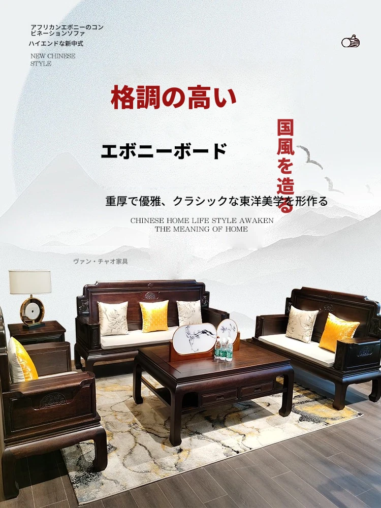新中式古典紅木ソファセット|冬夏兼用の高品質アフリカ黒檀木製ソファ|優雅な客厅の演出に最適!