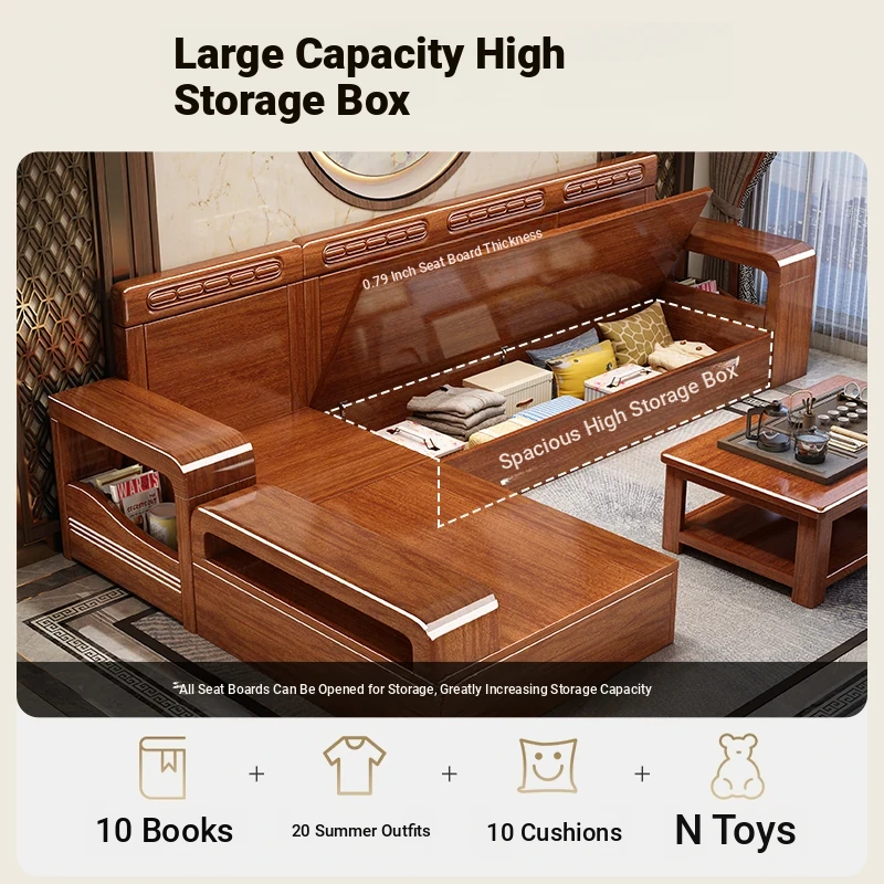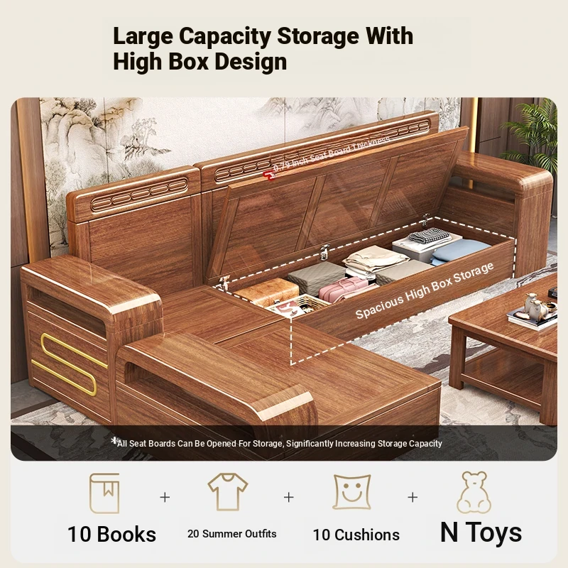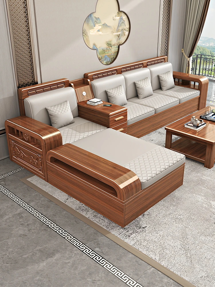 New Chinese Style Solid Walnut Sofa Set - Versatile Chaise Lounge with Storage for Year-Round Comfort - Pure Wood Living Room Furniture