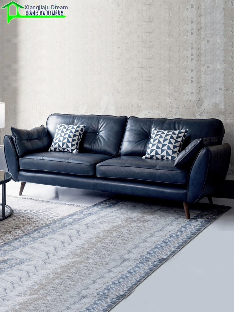 Nordic Japanese Genuine Leather Sofa for Small Spaces - Minimalist Italian Style Black Three-Seater Couch for Rent, Perfect for Cozy Living Rooms and Shops