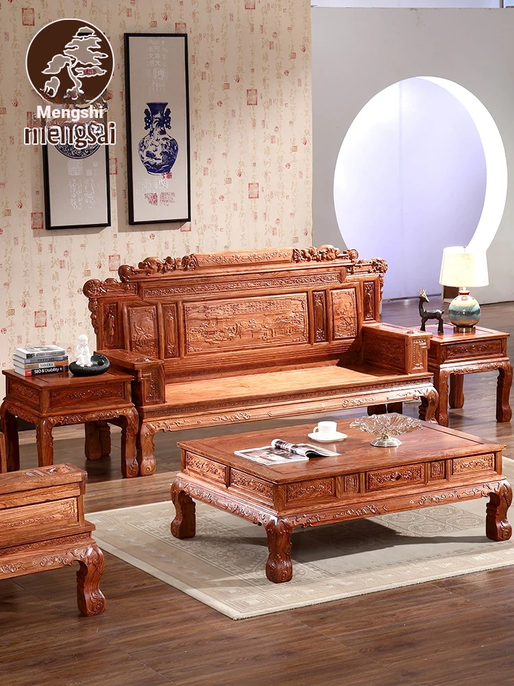Mengshi Rosewood Furniture - Classical Chinese Solid Wood Sofa with Curved Legs, Featuring Stunning Floral and Landscape Motifs, Perfect for Your Living Room