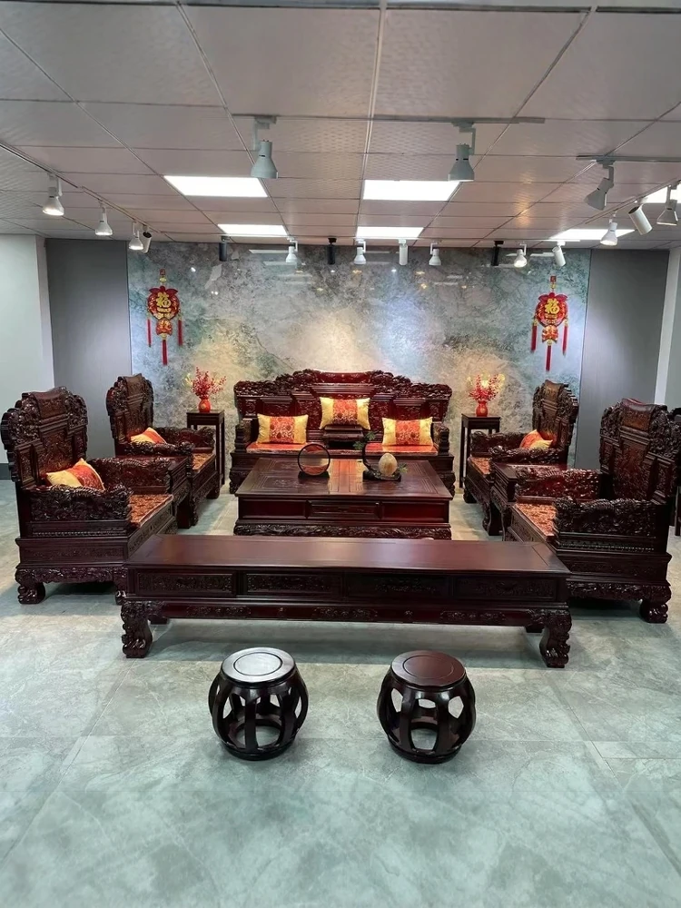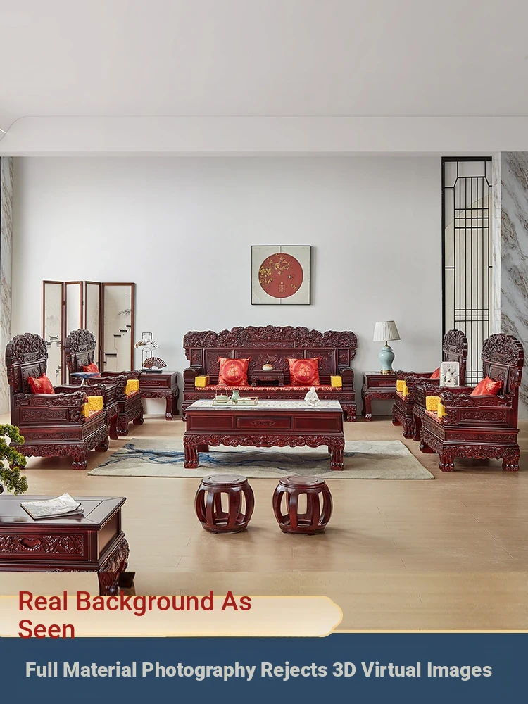 Classic Chinese Solid Wood Sofa Set - Complete Antique Style Ming and Qing Rosewood Furniture for Living Room, Hand-Carved Floral Design, Perfect for Year-Round Comfort