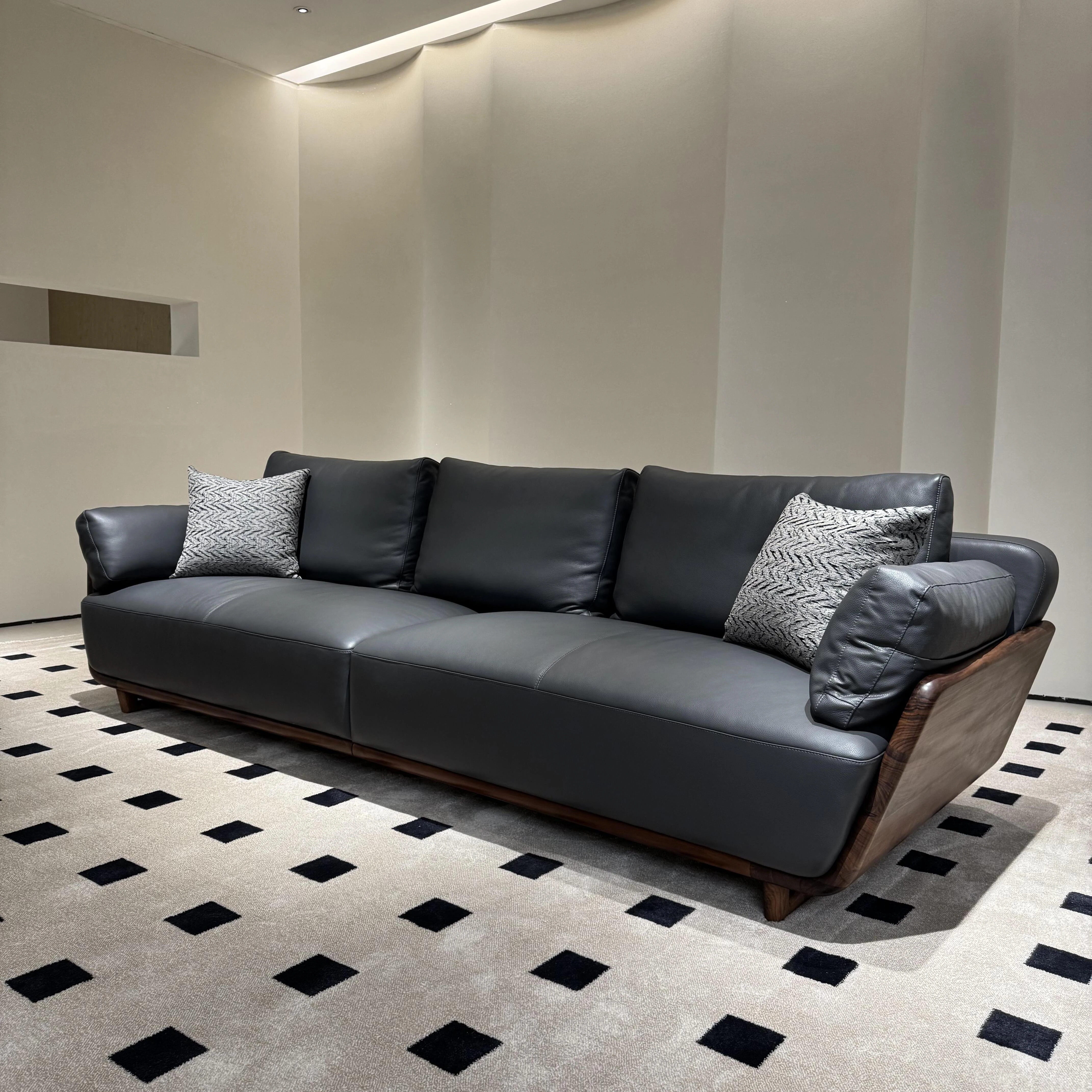 Italian Minimalist Black Walnut Sofa - Solid Wood & Genuine Leather for 3-4 People, Perfect for Any Living Room Size, Elevate Your Space with Luxury and Style