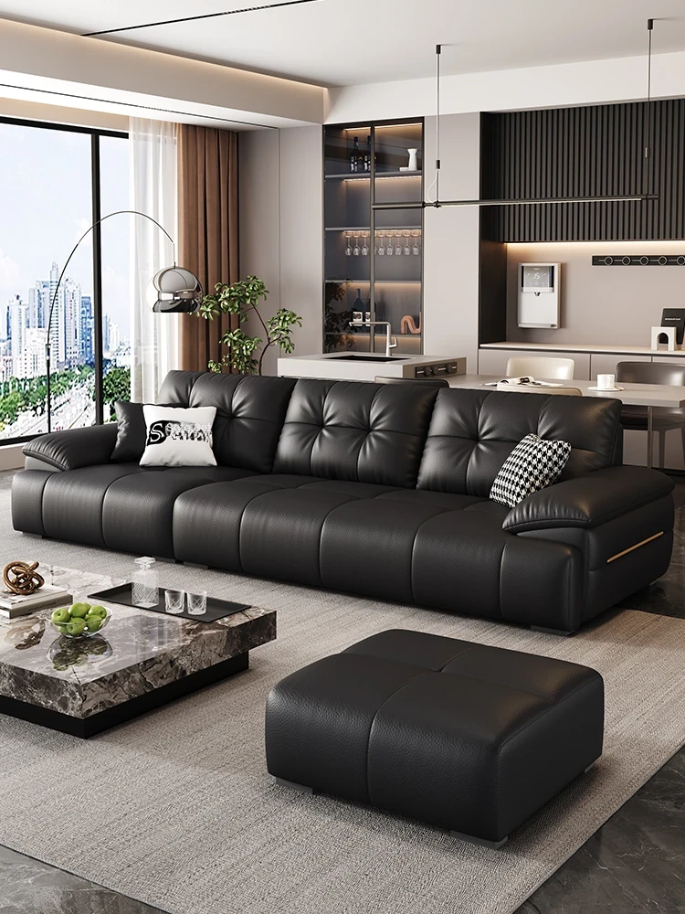 Italian Minimalist Genuine Leather Sofa - Luxurious Top-Grain Cowhide Living Room Furniture, Stylish 2025 New Model, Elegant Black Horizontal Design for Modern Spaces