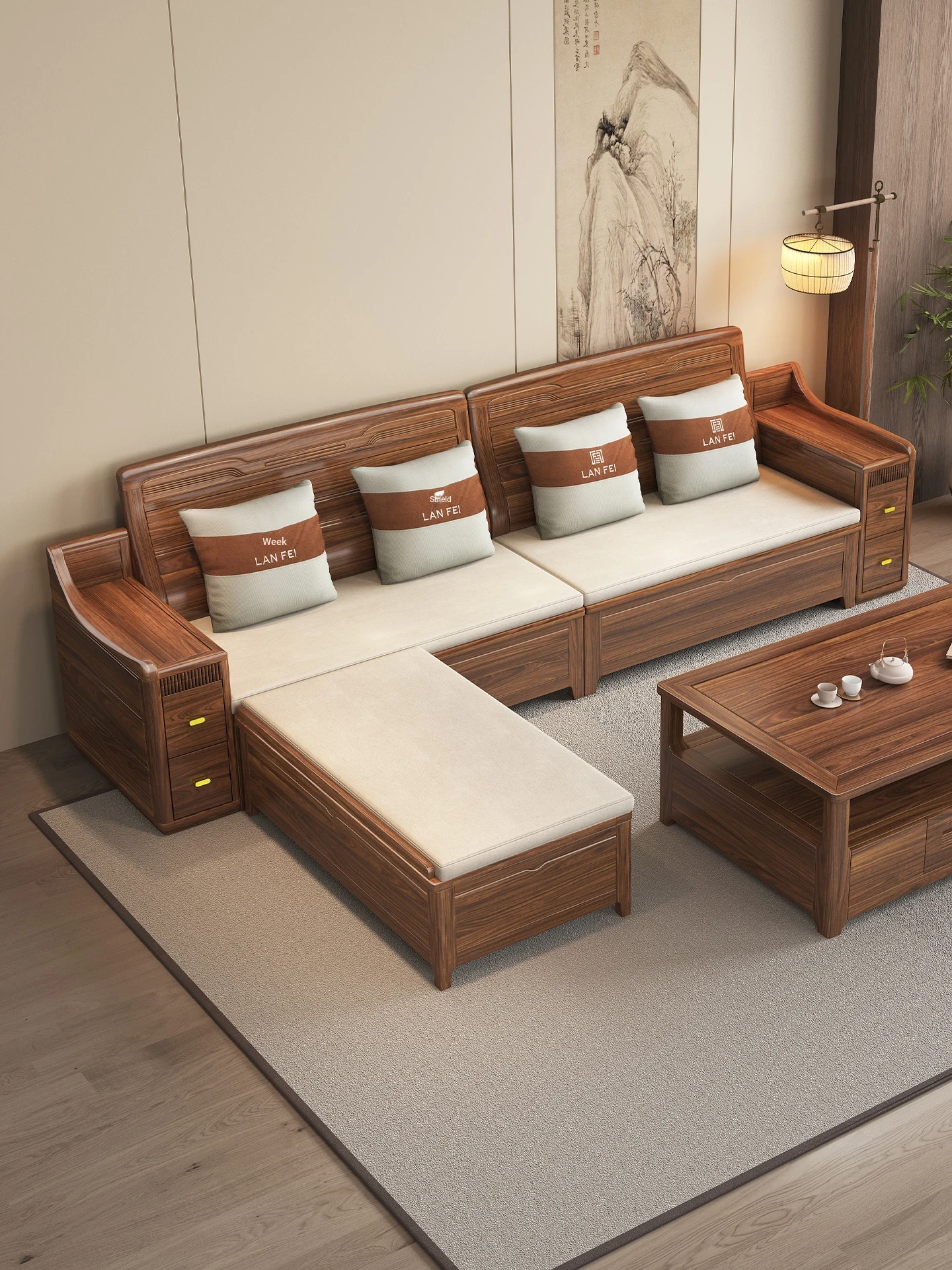 Elegant Black Walnut Solid Wood Sofa Set - New Chinese Style L-Shaped Chaise Lounge, Versatile for All Seasons, Perfect for Home Living Room with Storage Solutions