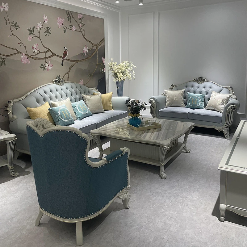 Luxurious French Genuine Leather Sofa with Hand-Carved Solid Wood in Tiffany Blue Finish - Elegant Three-Seat Living Room Furniture for Villas