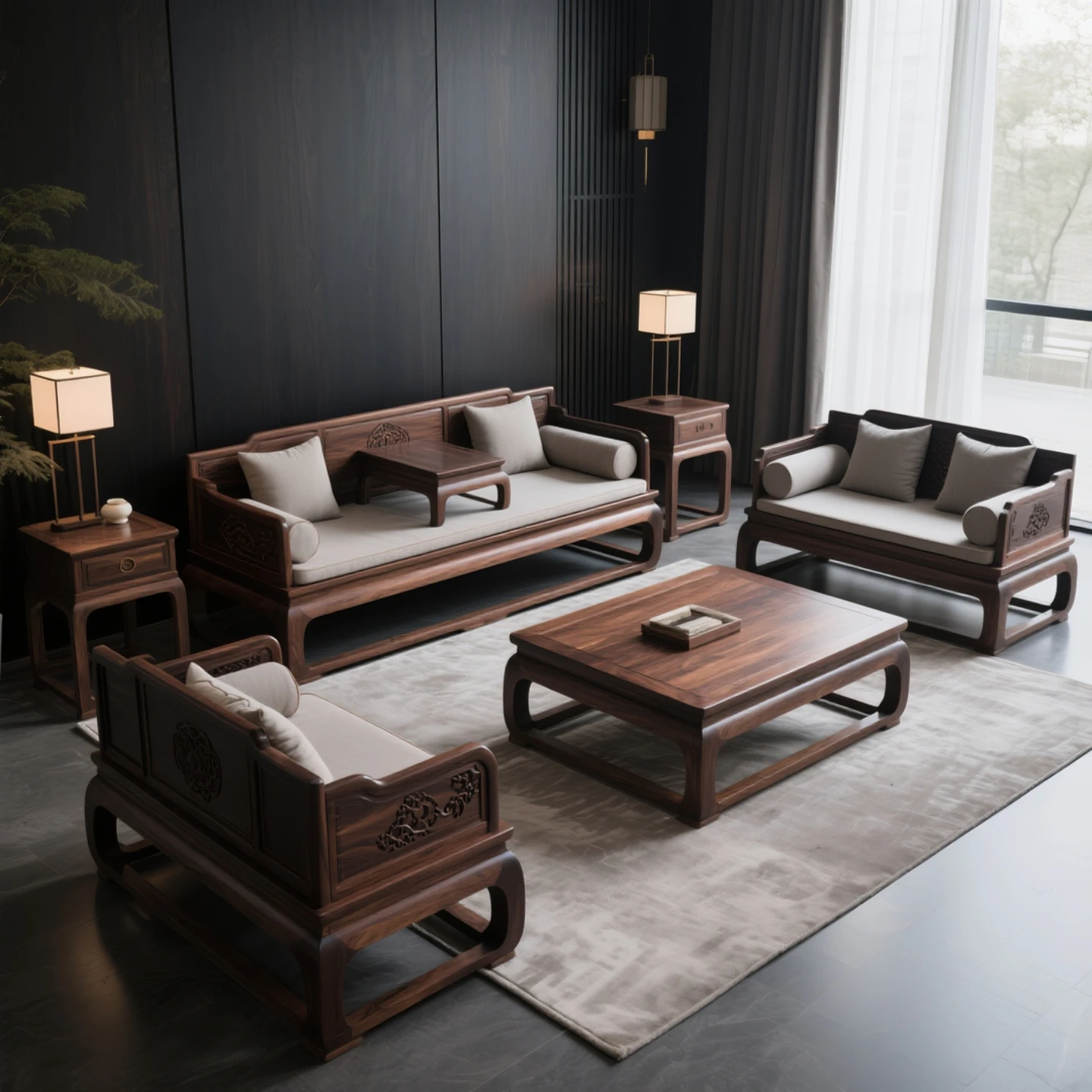 Modern Minimalist New Chinese Style Solid Black Walnut Sofa Set for Spacious Villas – Zen-Inspired Living Room Furniture