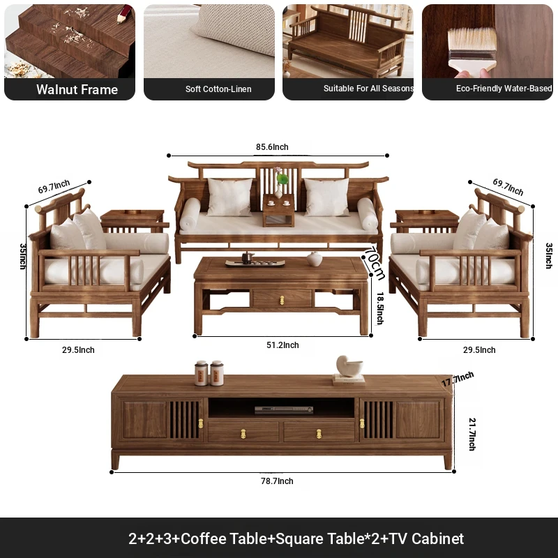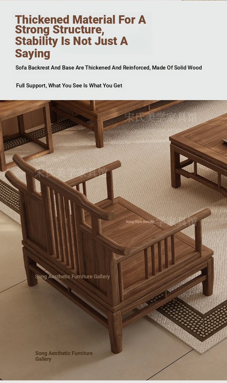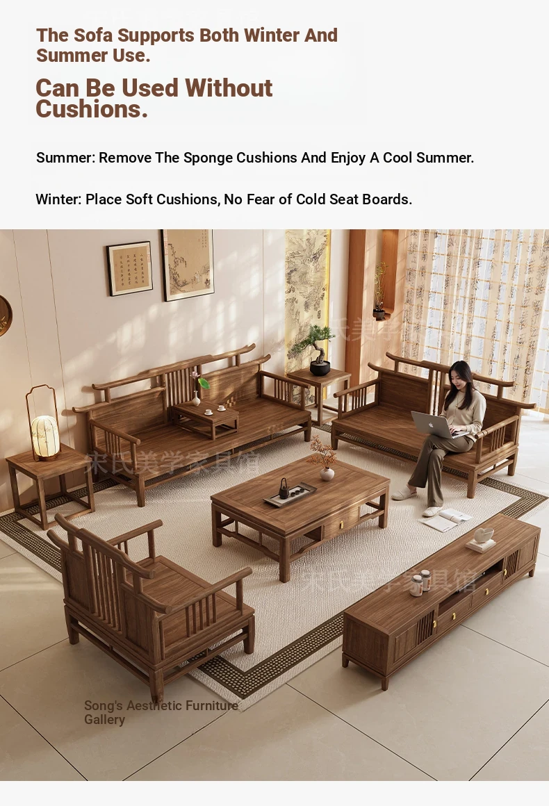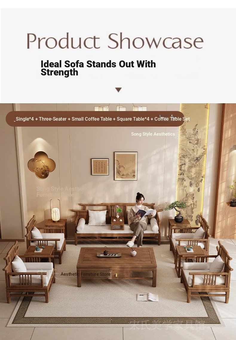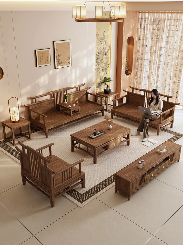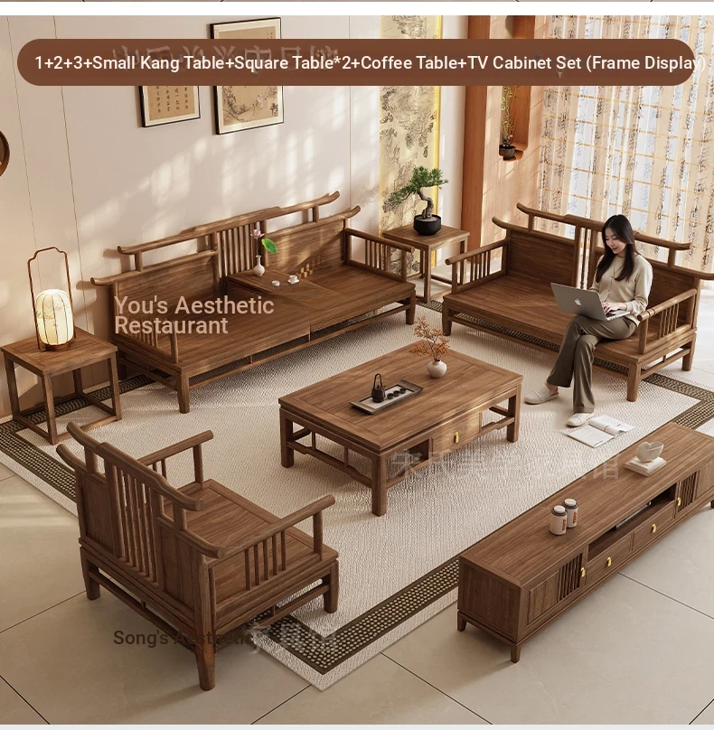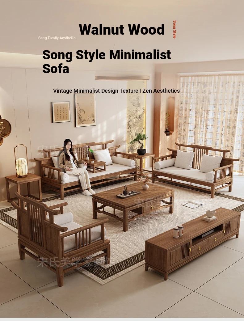 2025 New Walnut Solid Wood Sofa Set - Elegant New Chinese Style U-Shaped Living Room Furniture Inspired by Song Dynasty Aesthetics, Fully Assembled for Your Comfort