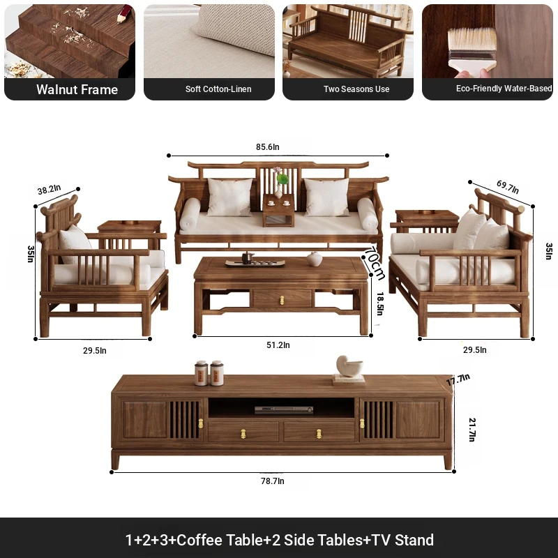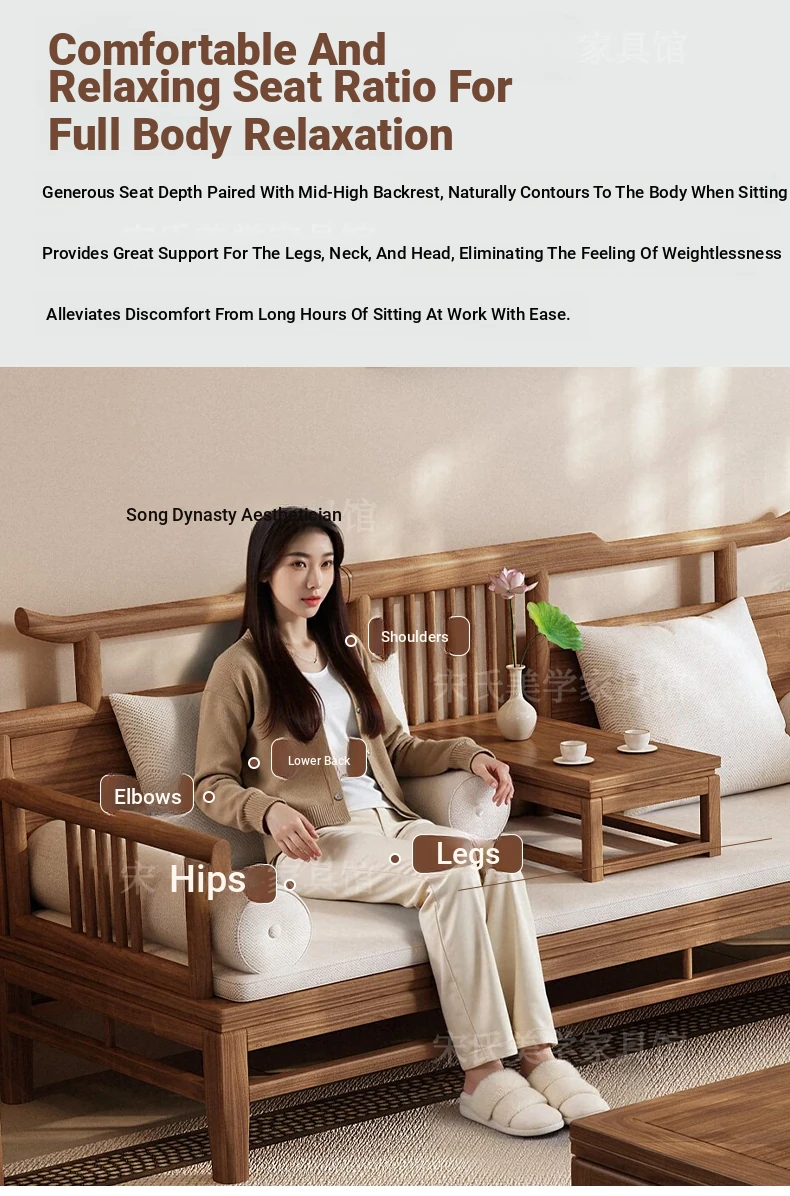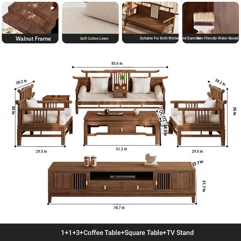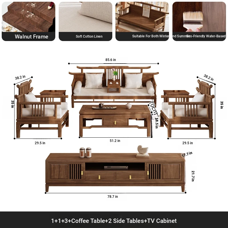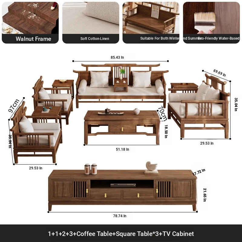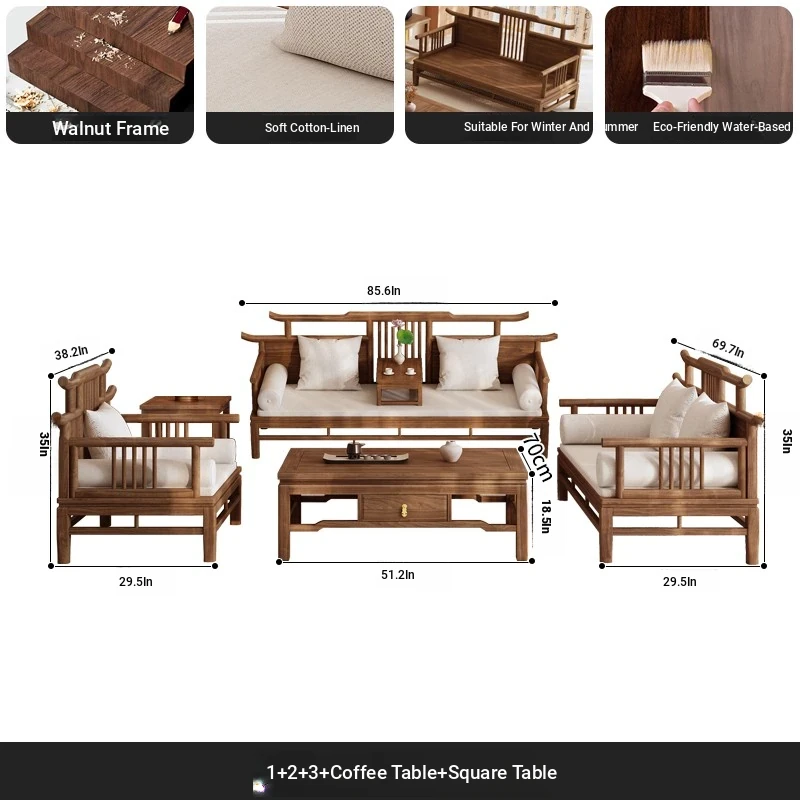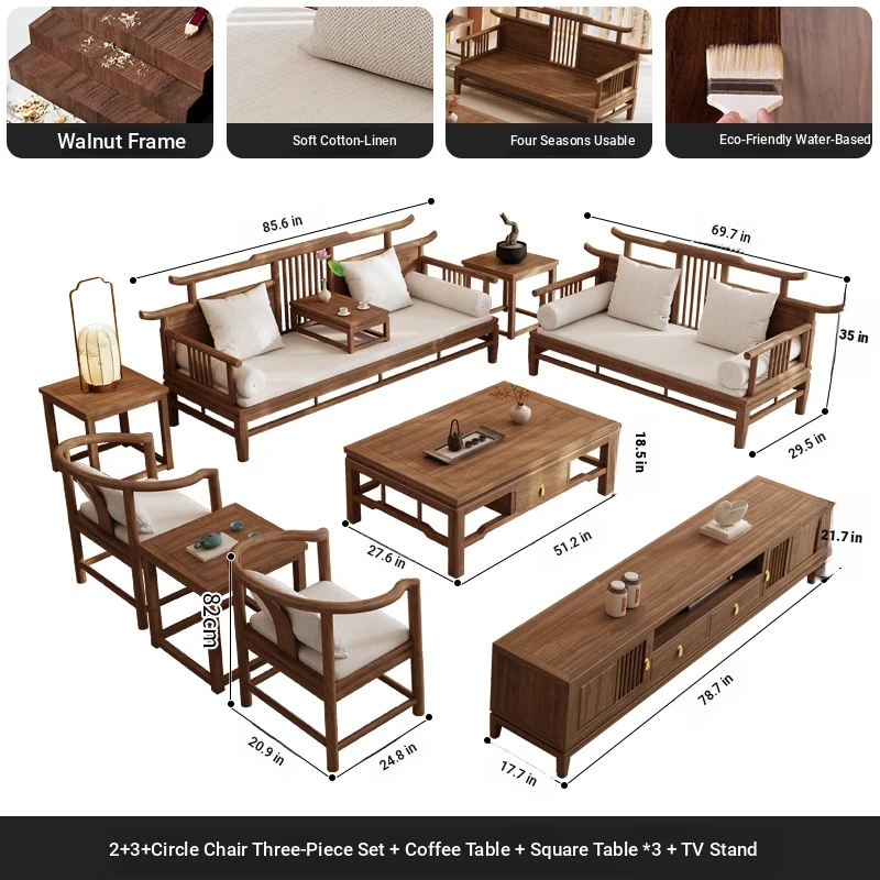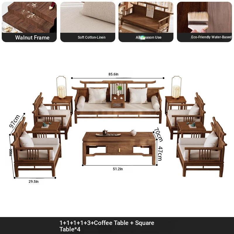 2025 New Walnut Solid Wood Sofa Set - Elegant New Chinese Style U-Shaped Living Room Furniture Inspired by Song Dynasty Aesthetics, Fully Assembled for Your Comfort