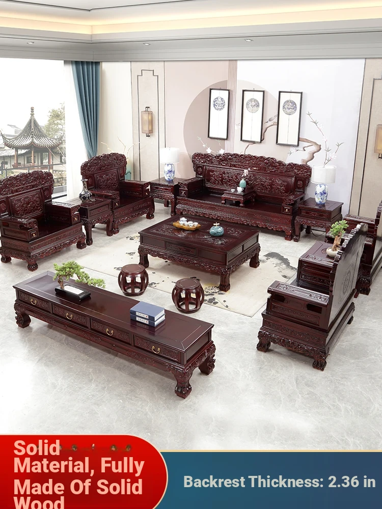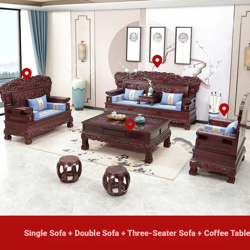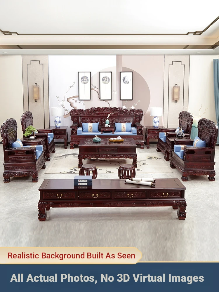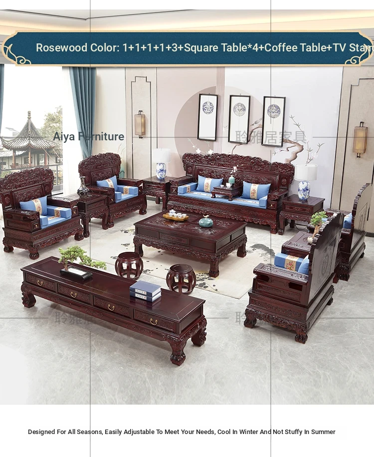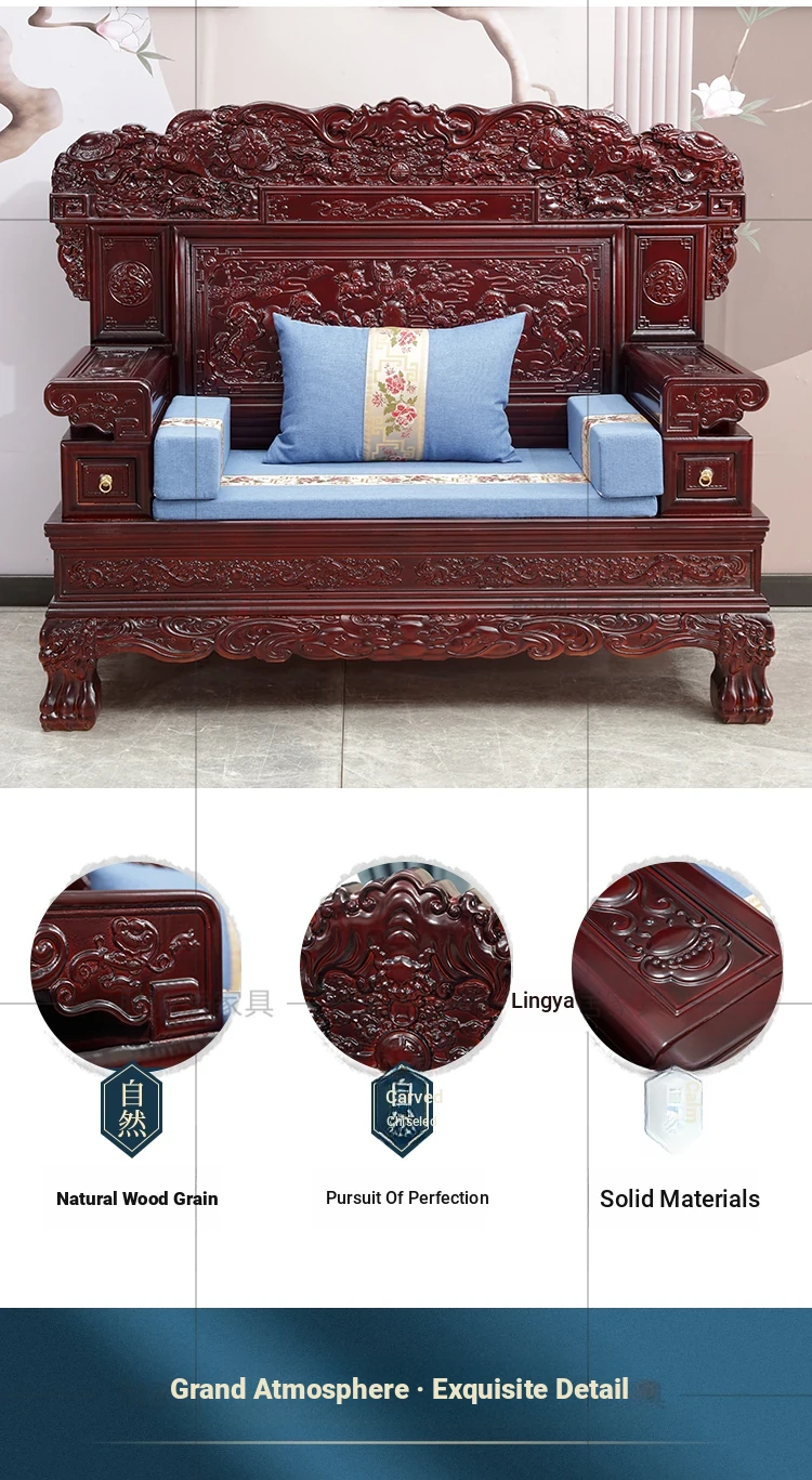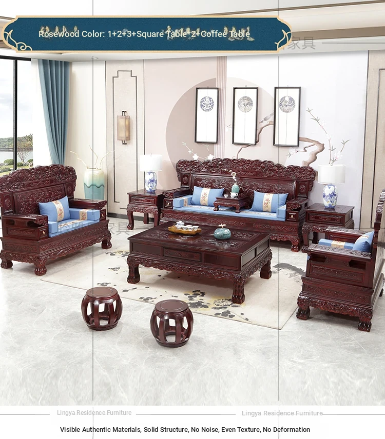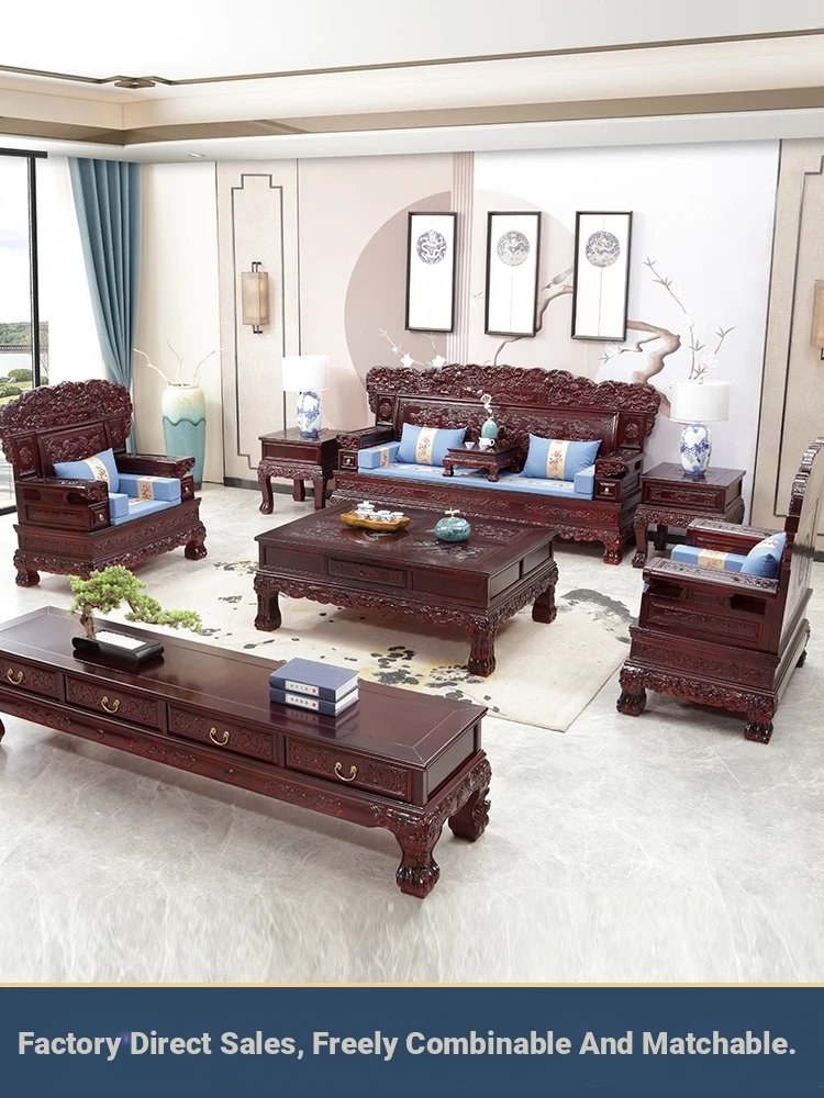 Classic Chinese Solid Wood Sofa Set - Complete Antique Style Ming and Qing Rosewood Furniture for Living Room, Hand-Carved Floral Design, Perfect for Year-Round Comfort