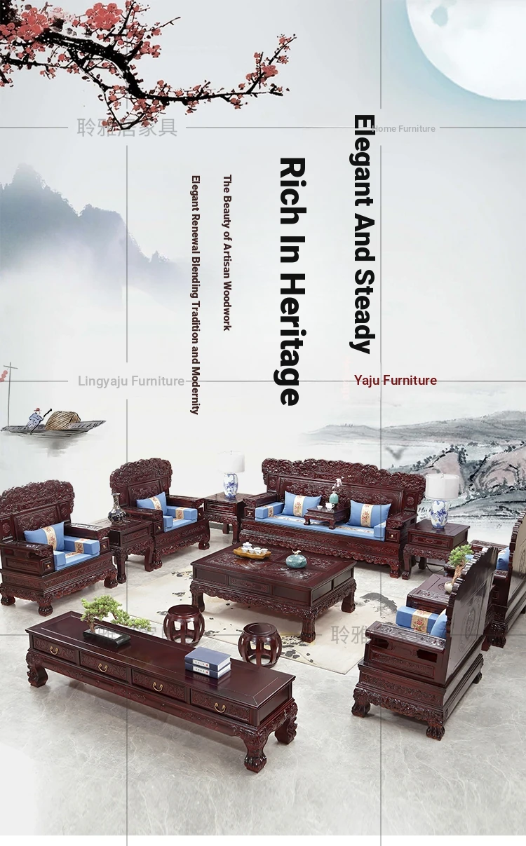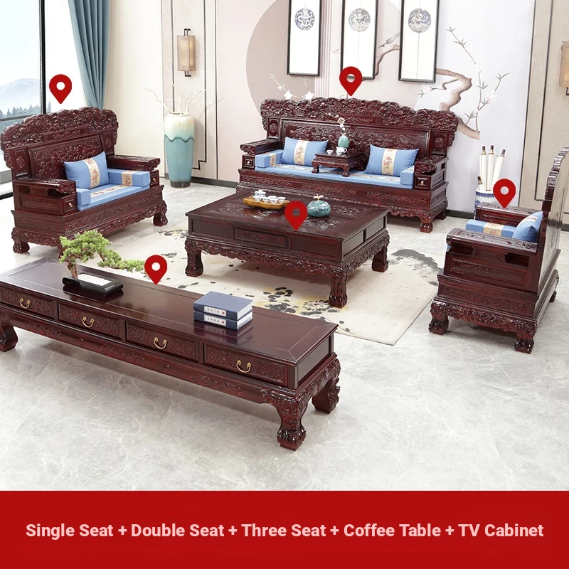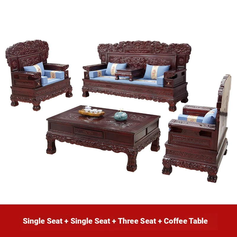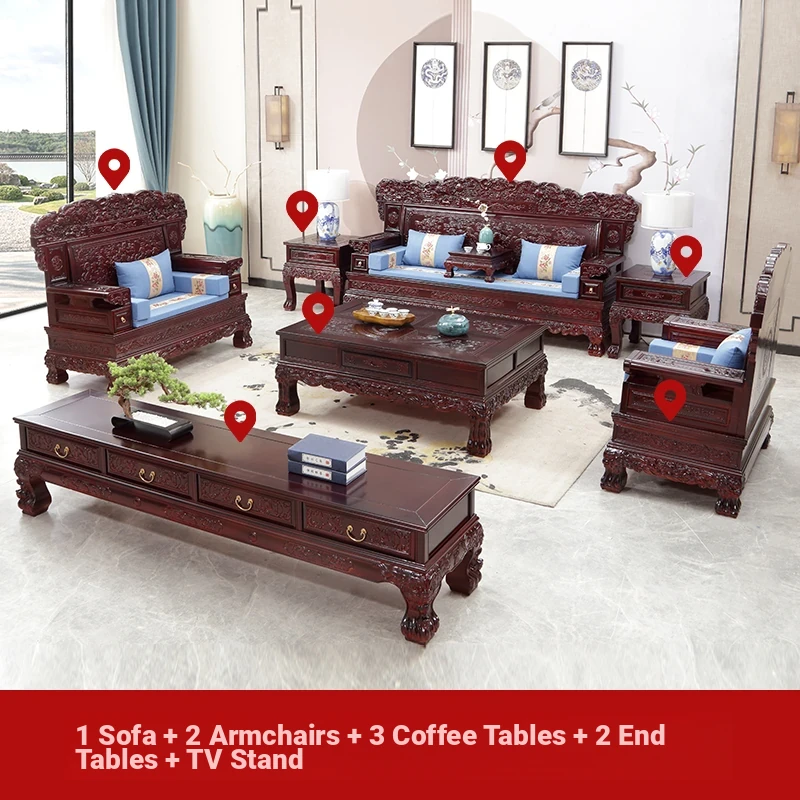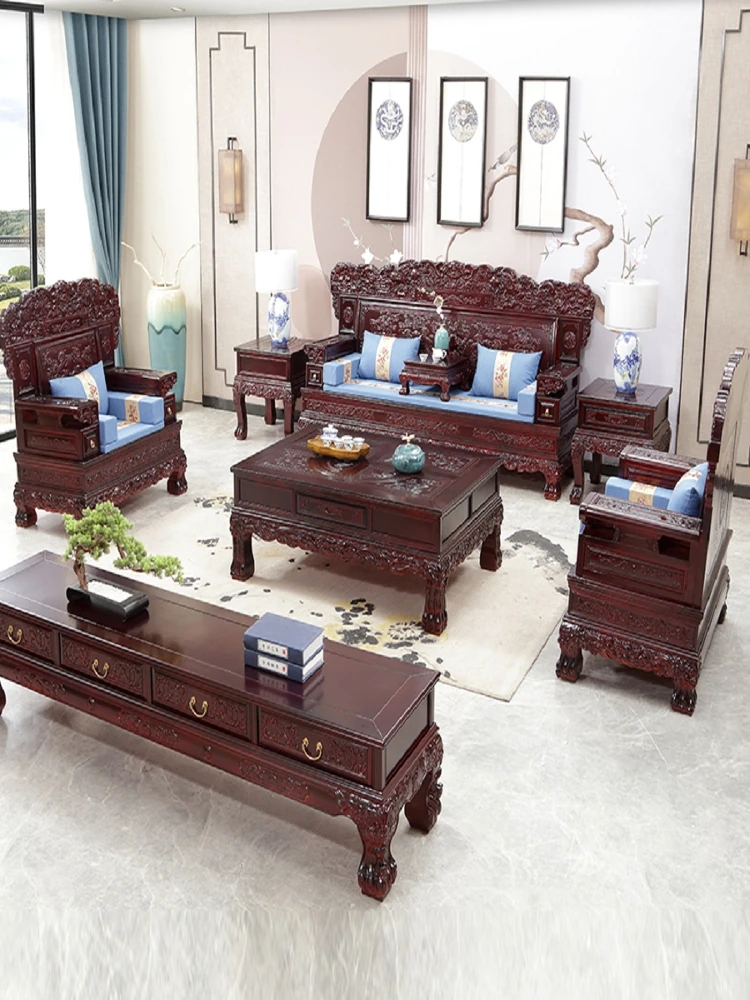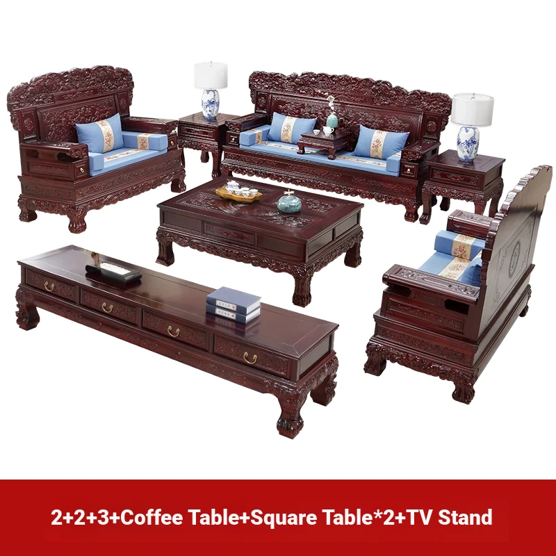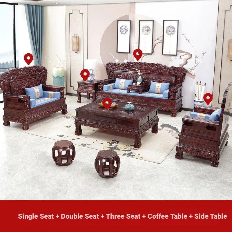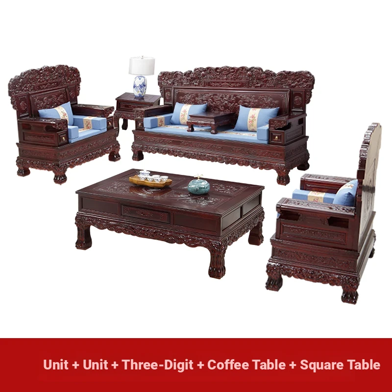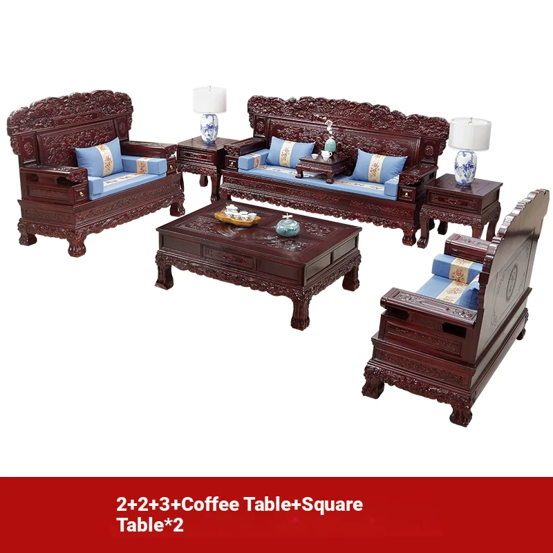 Classic Chinese Solid Wood Sofa Set - Complete Antique Style Ming and Qing Rosewood Furniture for Living Room, Hand-Carved Floral Design, Perfect for Year-Round Comfort