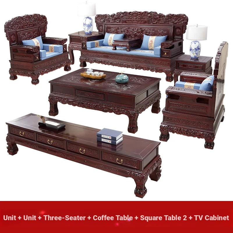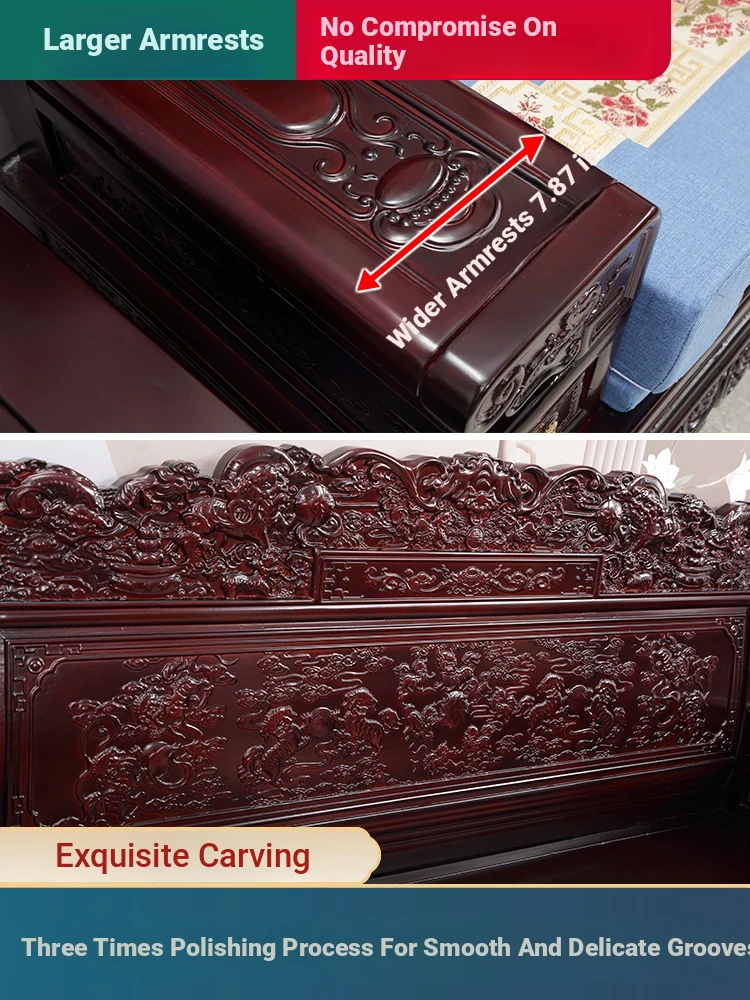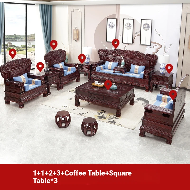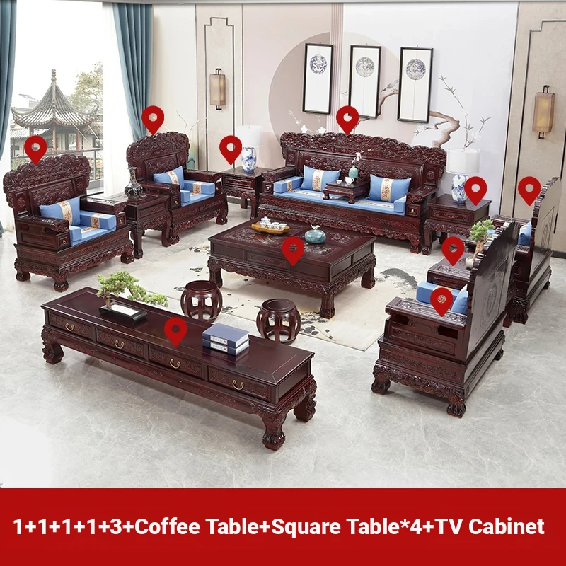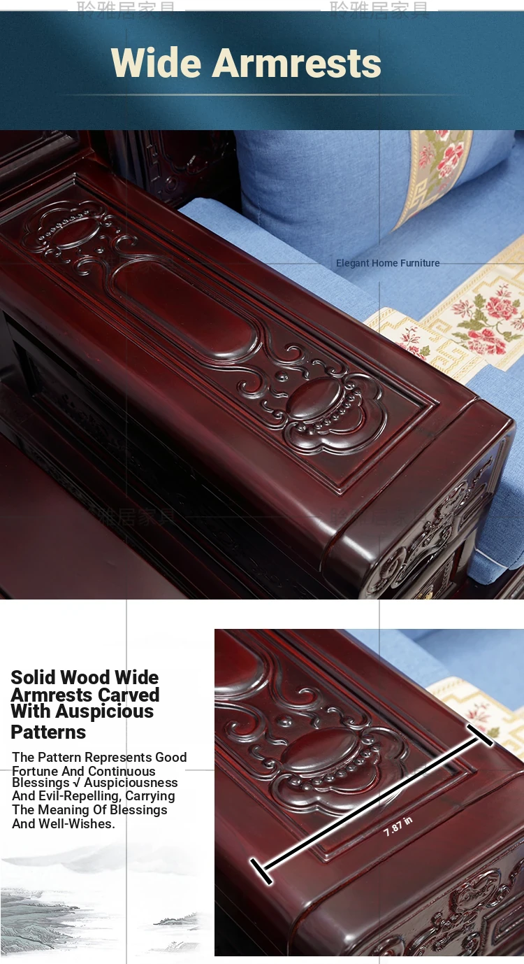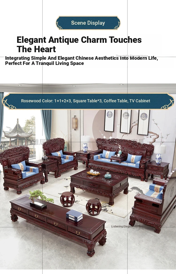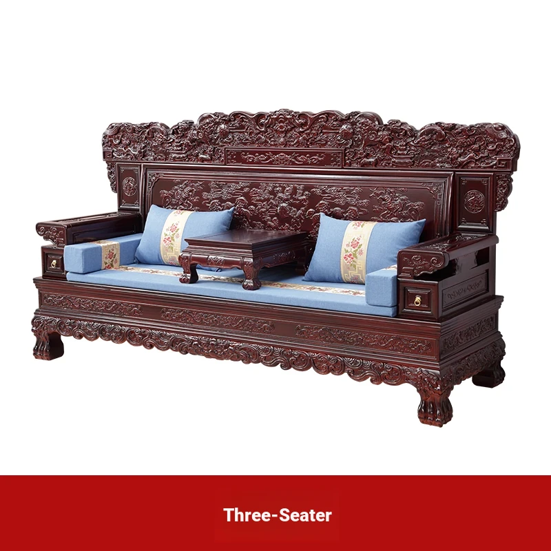 Classic Chinese Solid Wood Sofa Set - Complete Antique Style Ming and Qing Rosewood Furniture for Living Room, Hand-Carved Floral Design, Perfect for Year-Round Comfort