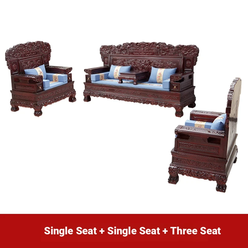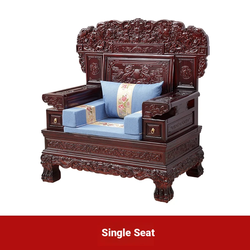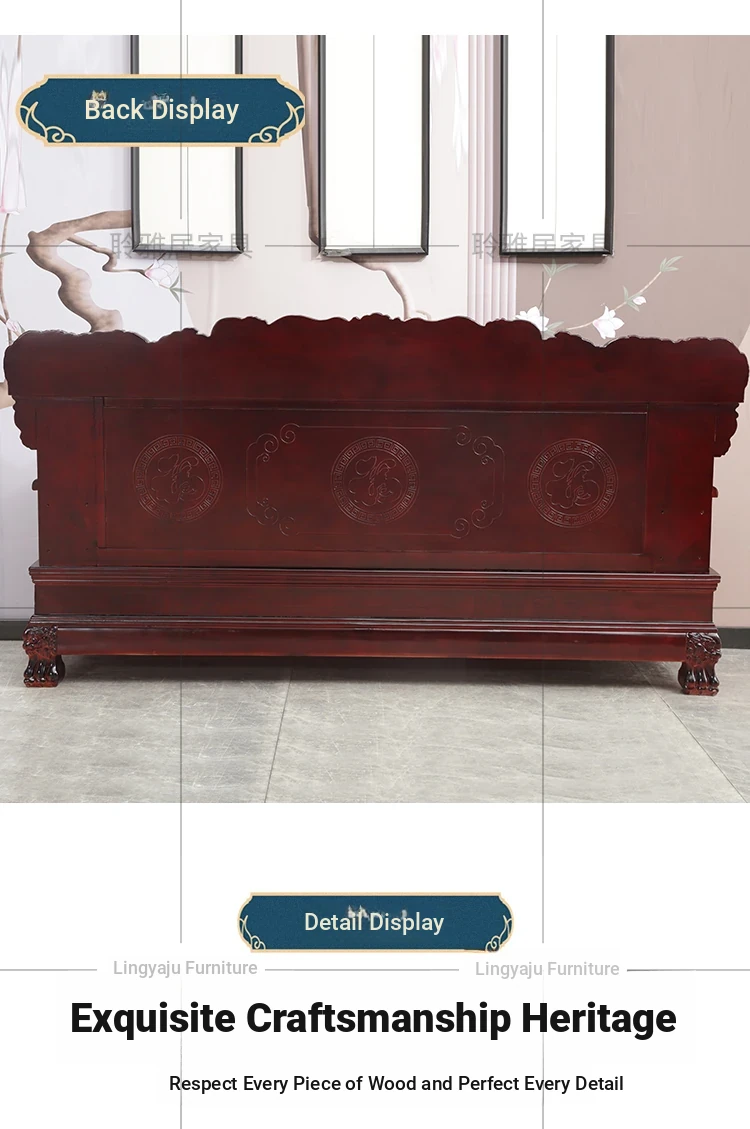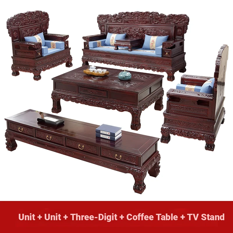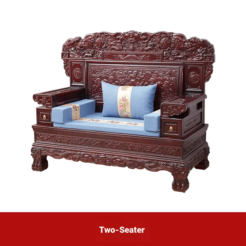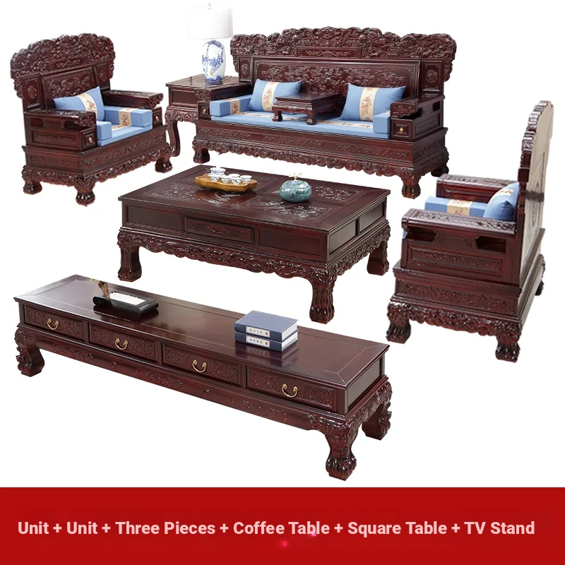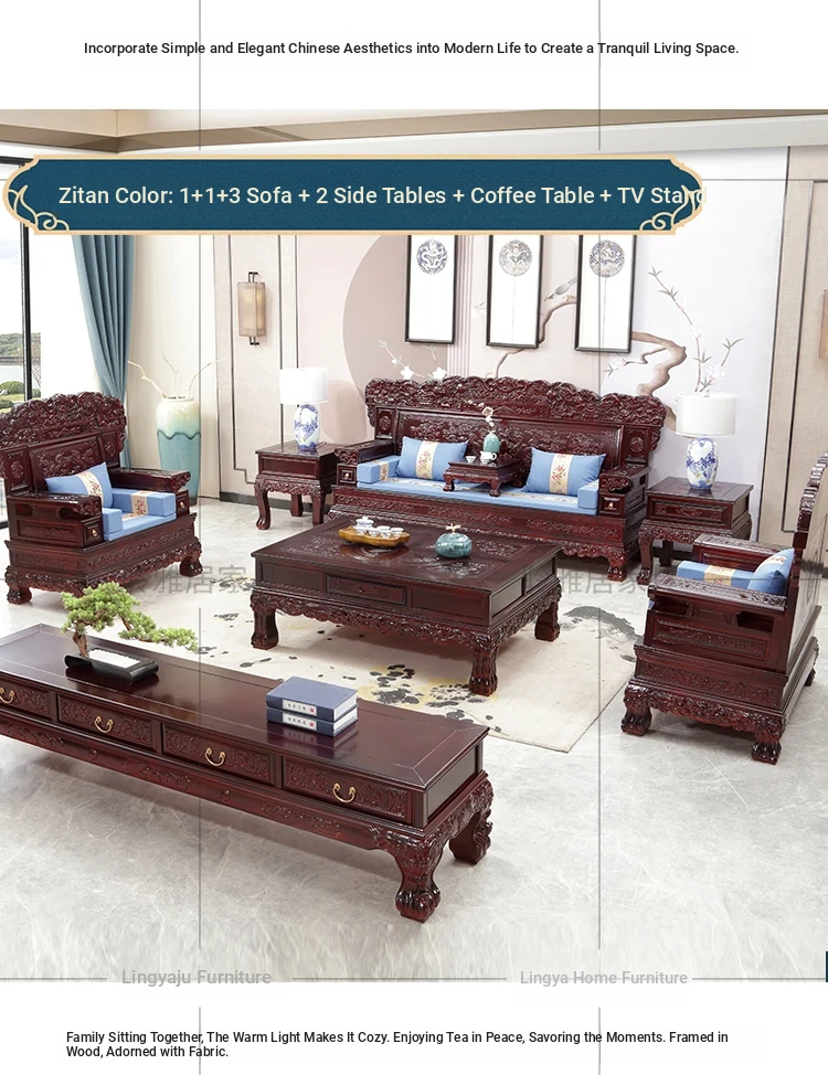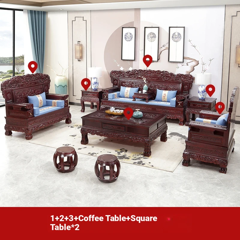 Classic Chinese Solid Wood Sofa Set - Complete Antique Style Ming and Qing Rosewood Furniture for Living Room, Hand-Carved Floral Design, Perfect for Year-Round Comfort