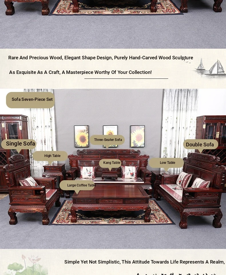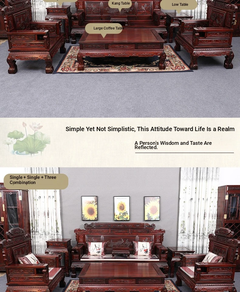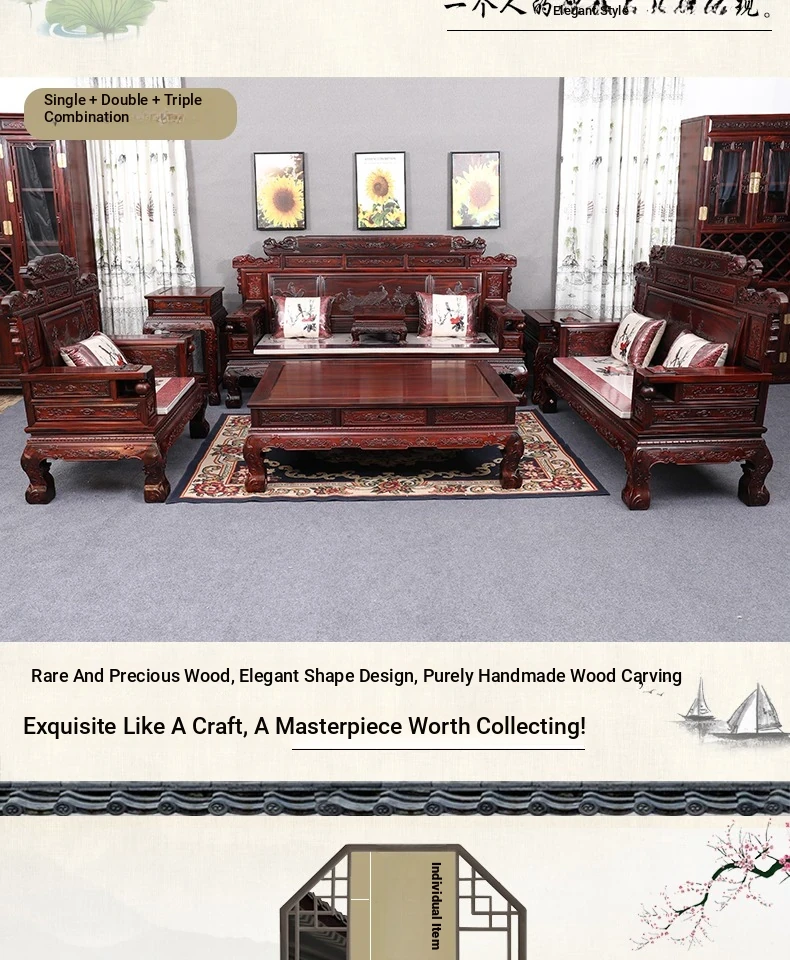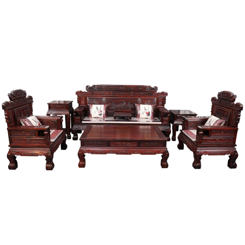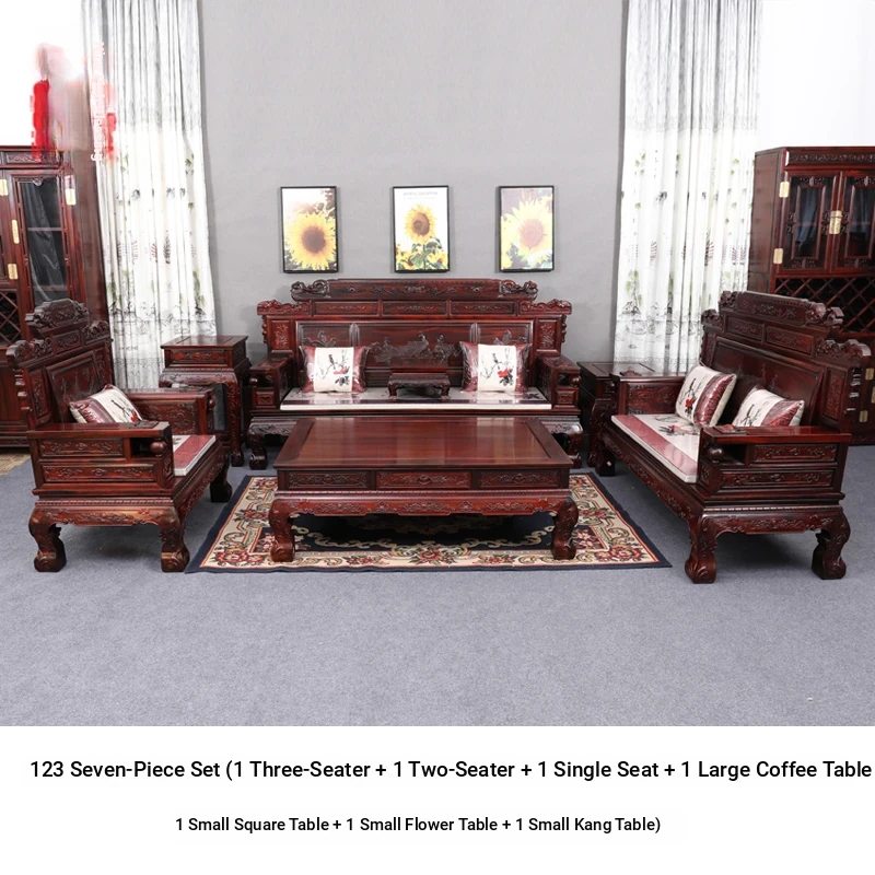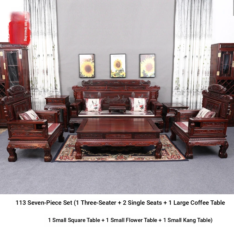 Complete Set of National Standard Redwood Furniture for Living Room - Indonesian Black Rosewood Sofa, Wide Leaf Rosewood, and African Rosewood - Elegant Chinese Style