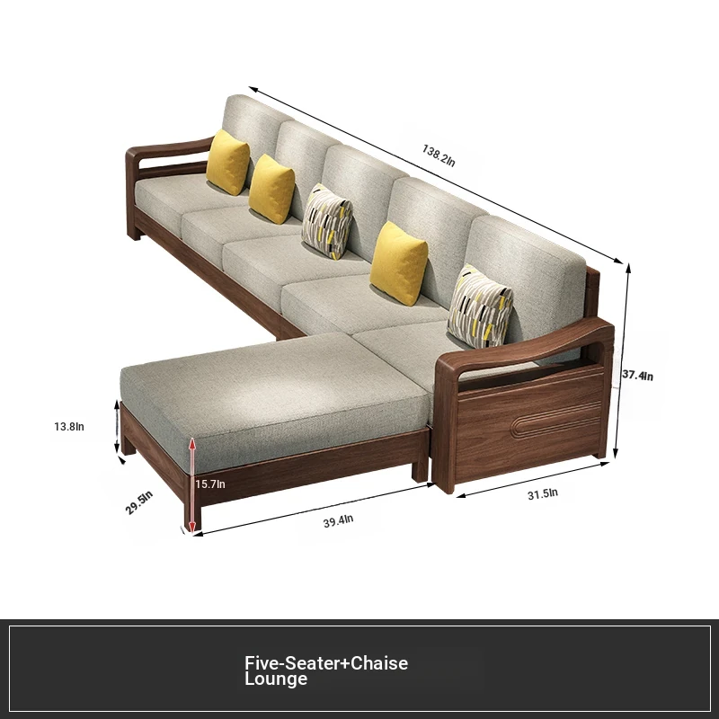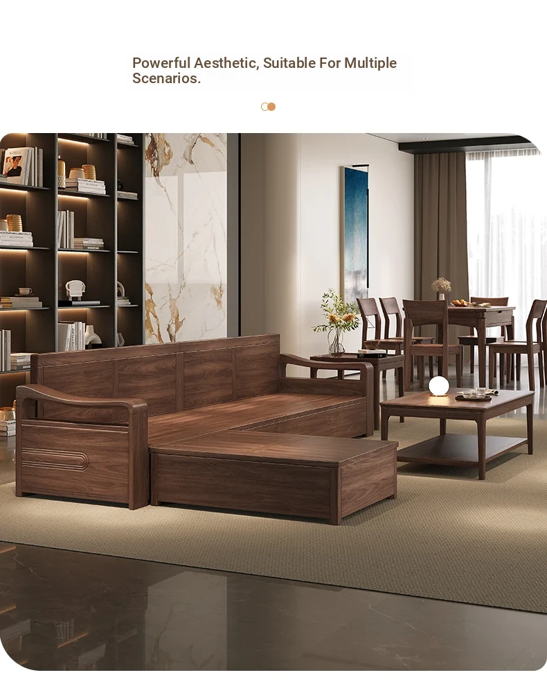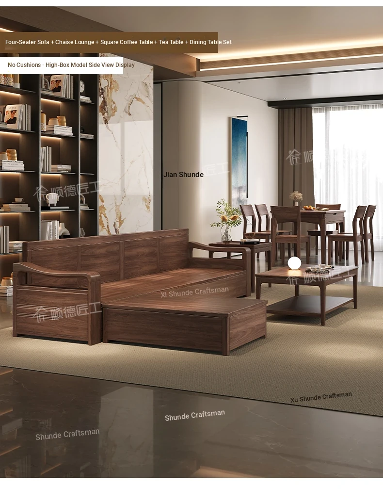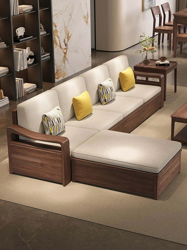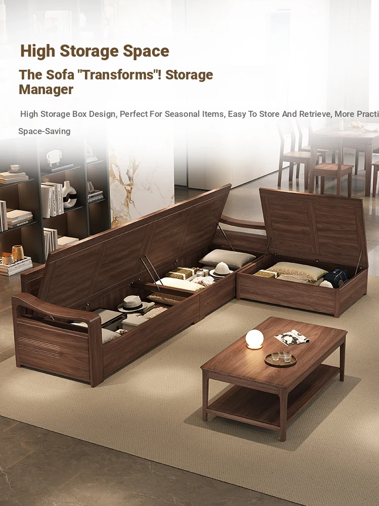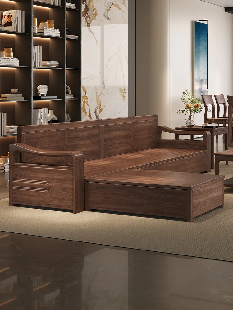 Elegant Black Walnut Solid Wood Sofa - New Chinese Style L-Shaped Chaise Lounge with Storage for Small Apartments - Minimalist Furniture for Living Rooms