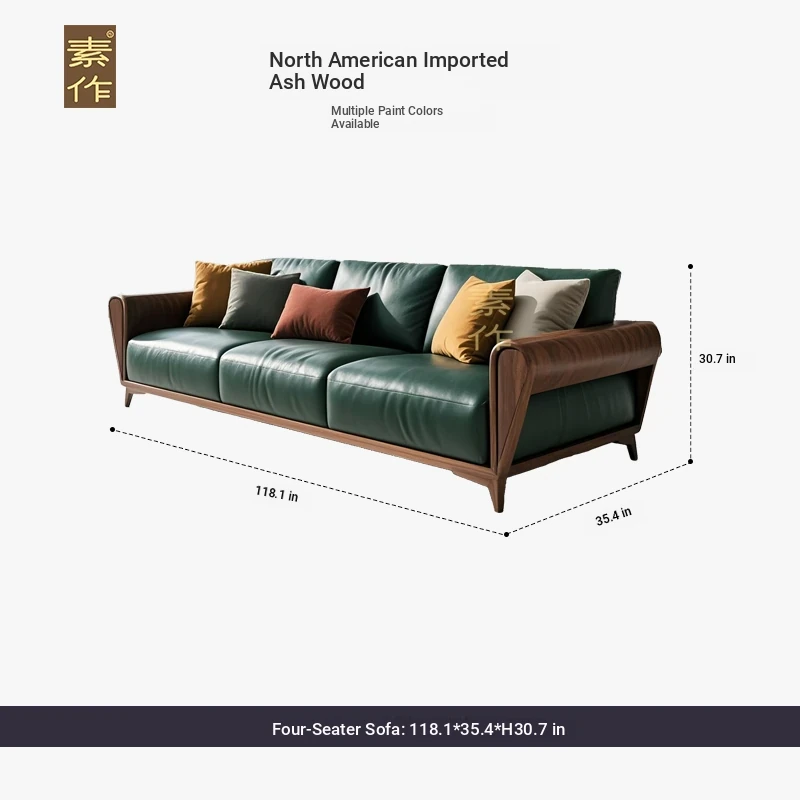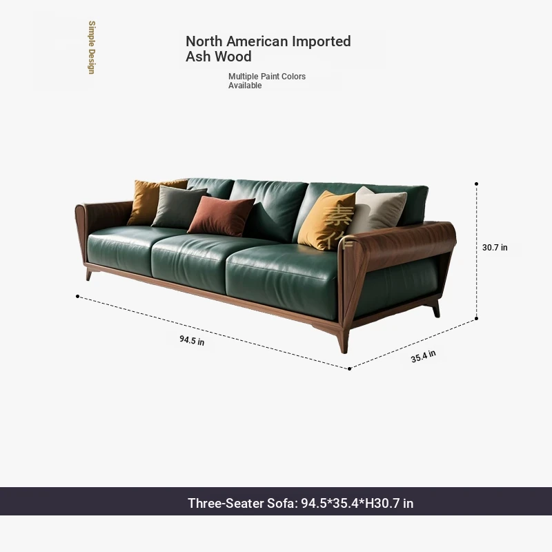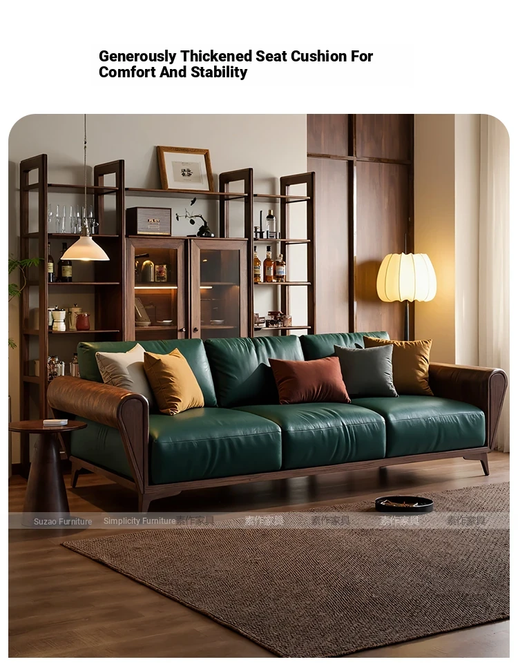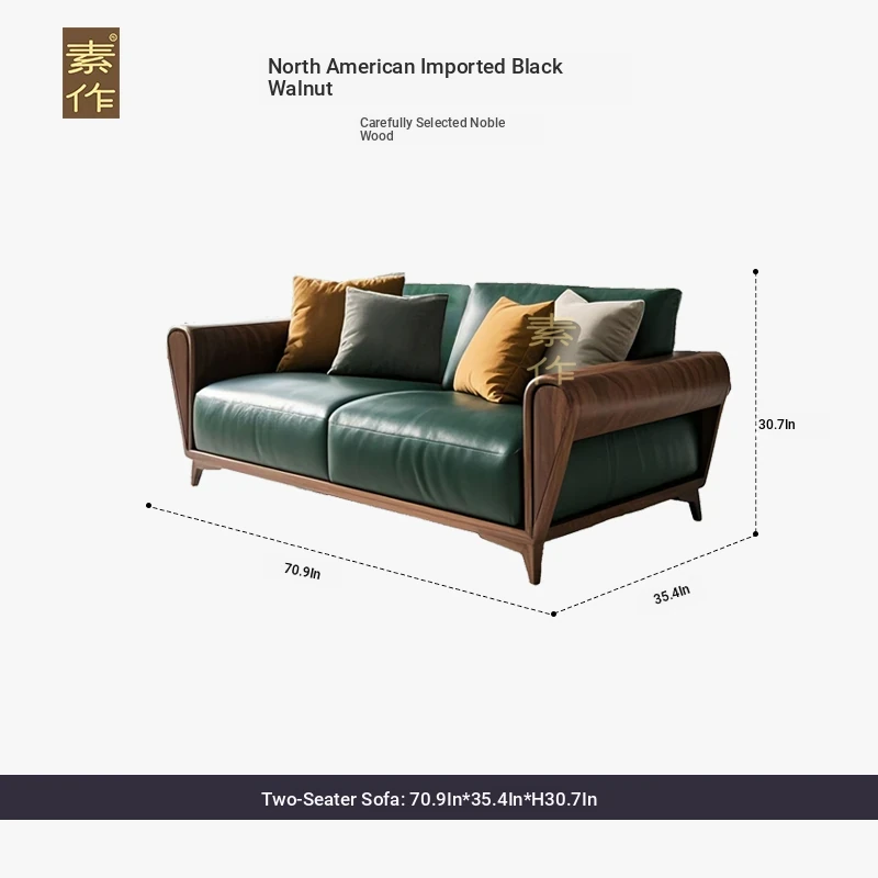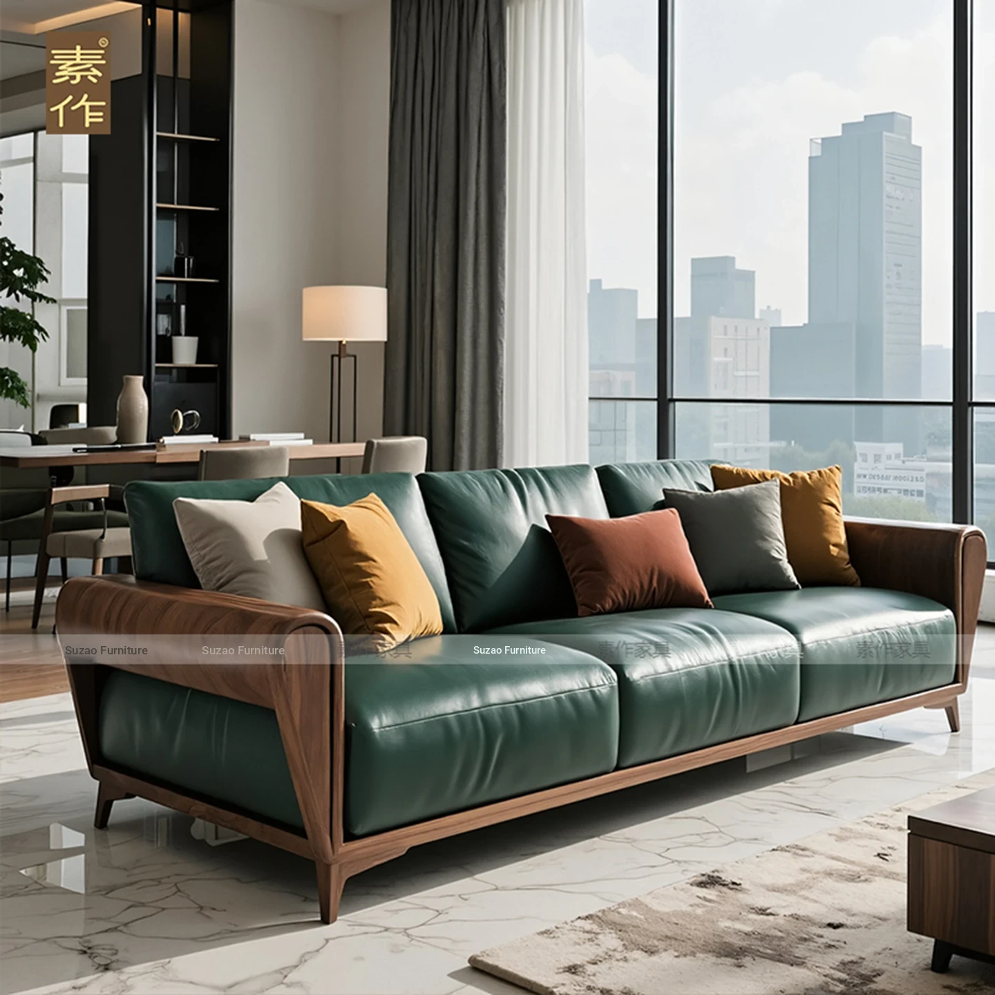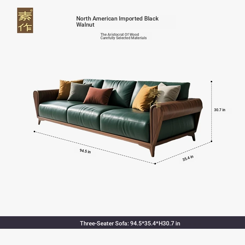 Elegant Italian Minimalist Jade Green Solid Wood Sofa - Spacious North American Black Walnut Sofa for Villas and Living Rooms, Perfect for Gatherings and Stylish Comfort.