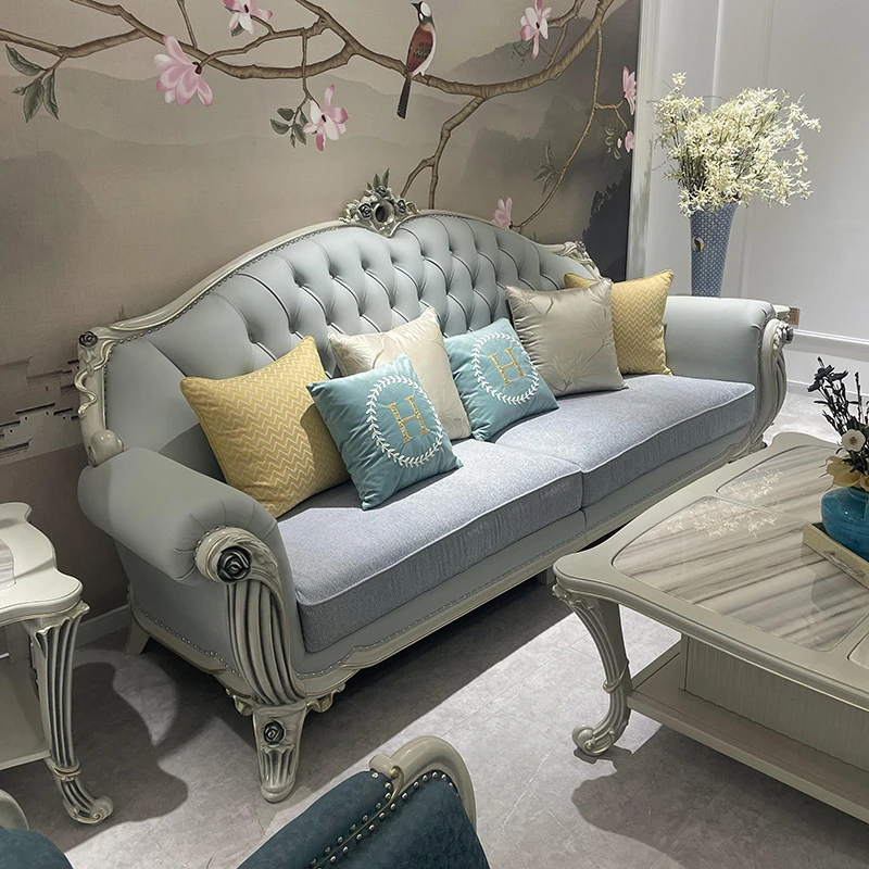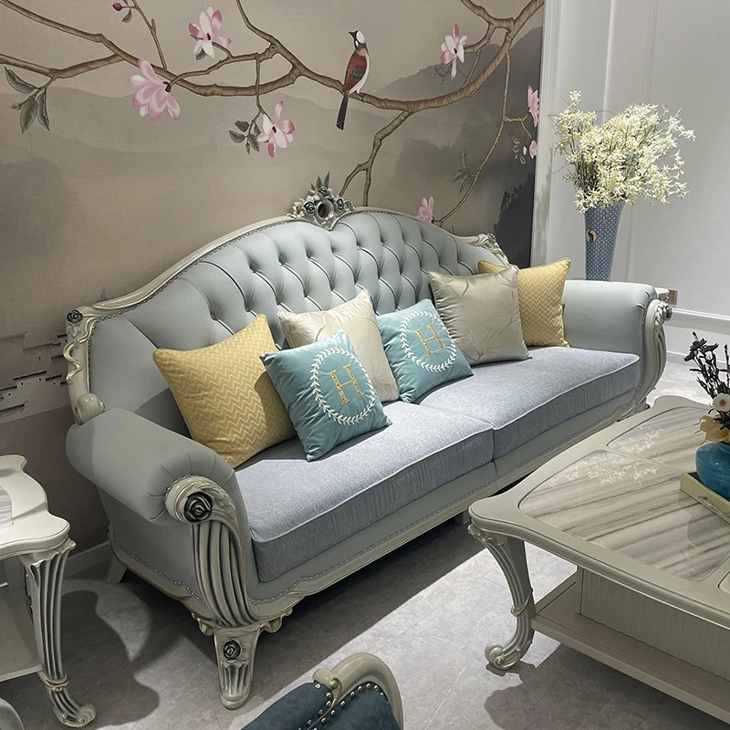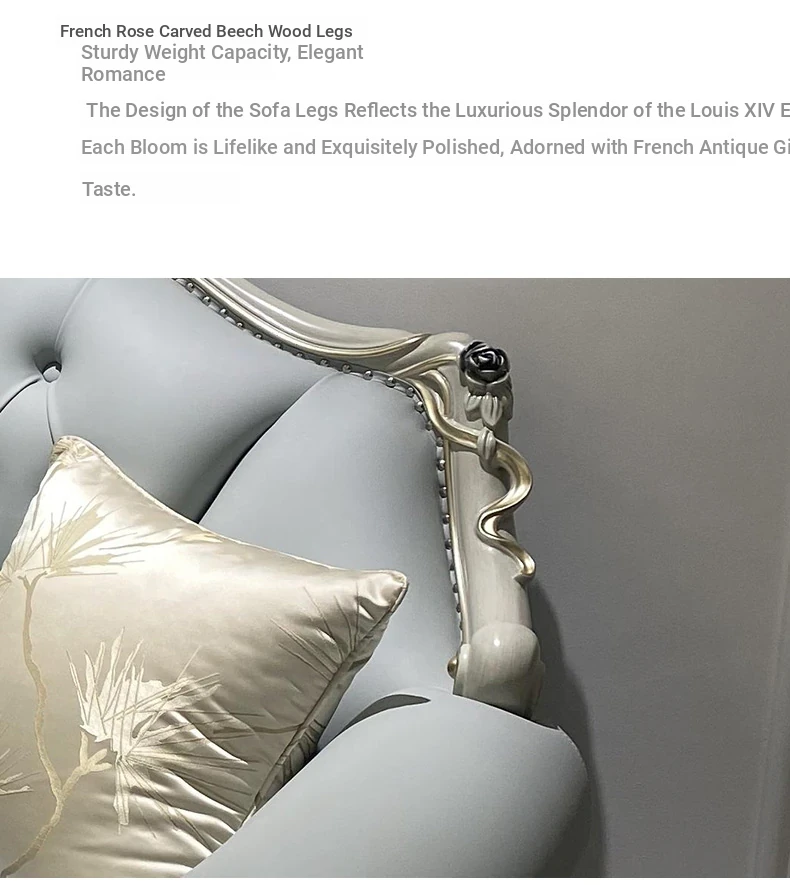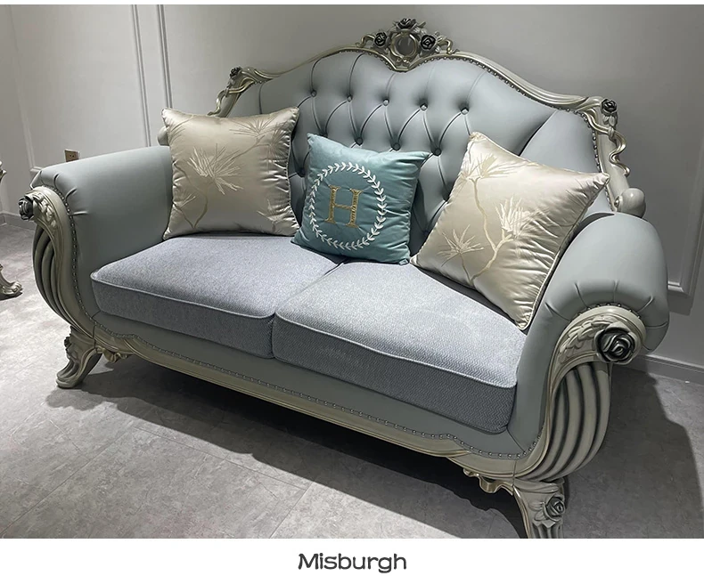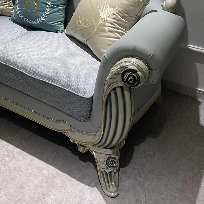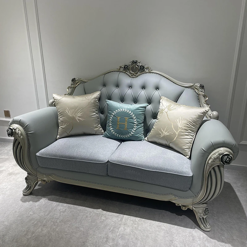 Luxurious French Genuine Leather Sofa with Hand-Carved Solid Wood in Tiffany Blue Finish - Elegant Three-Seat Living Room Furniture for Villas