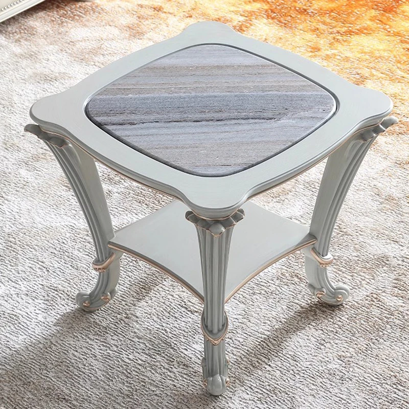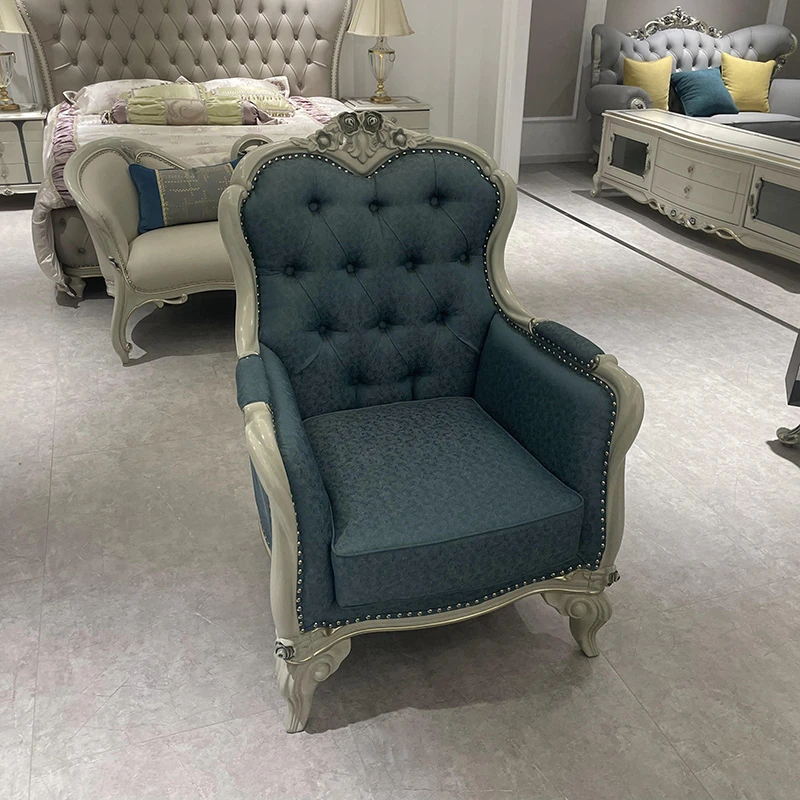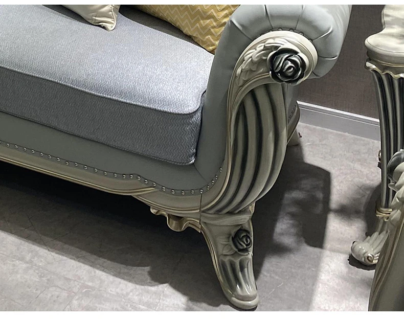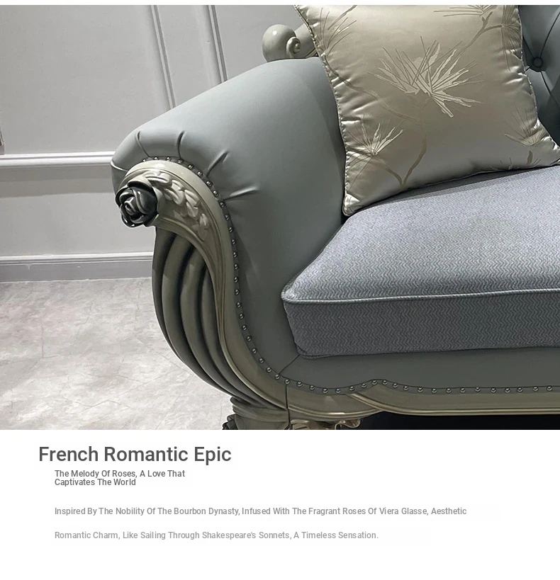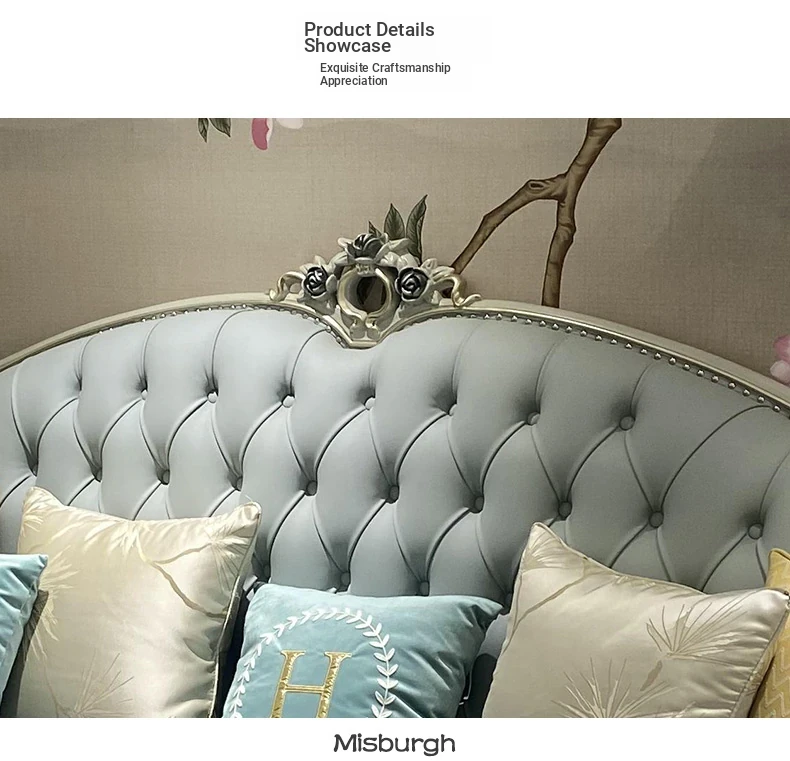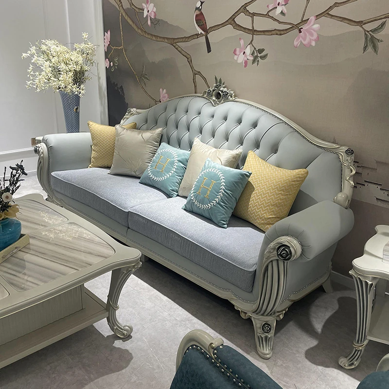 Luxurious French Genuine Leather Sofa with Hand-Carved Solid Wood in Tiffany Blue Finish - Elegant Three-Seat Living Room Furniture for Villas