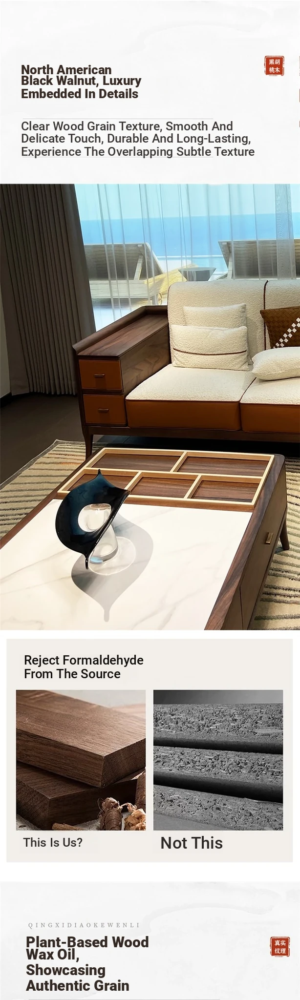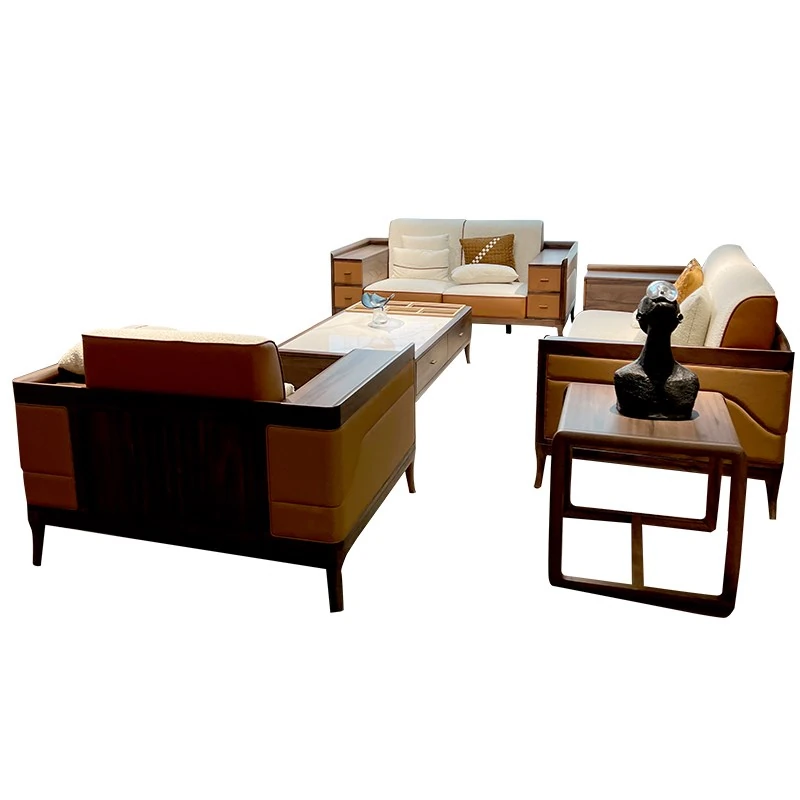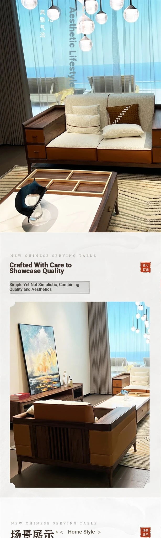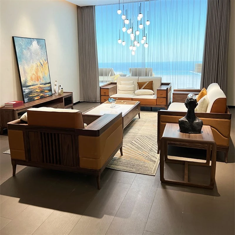 Luxury Modern Chinese Style Black Walnut Sofa Set for Living Room - Elegant Genuine Leather and Solid Wood Design for Villas and Contemporary Spaces