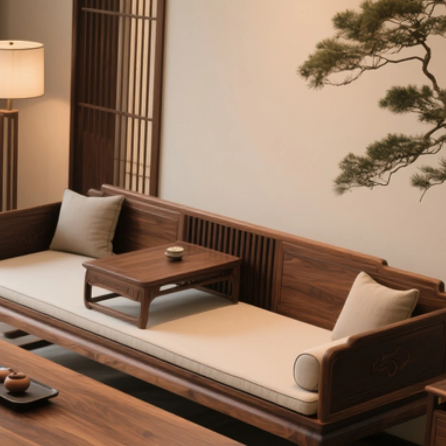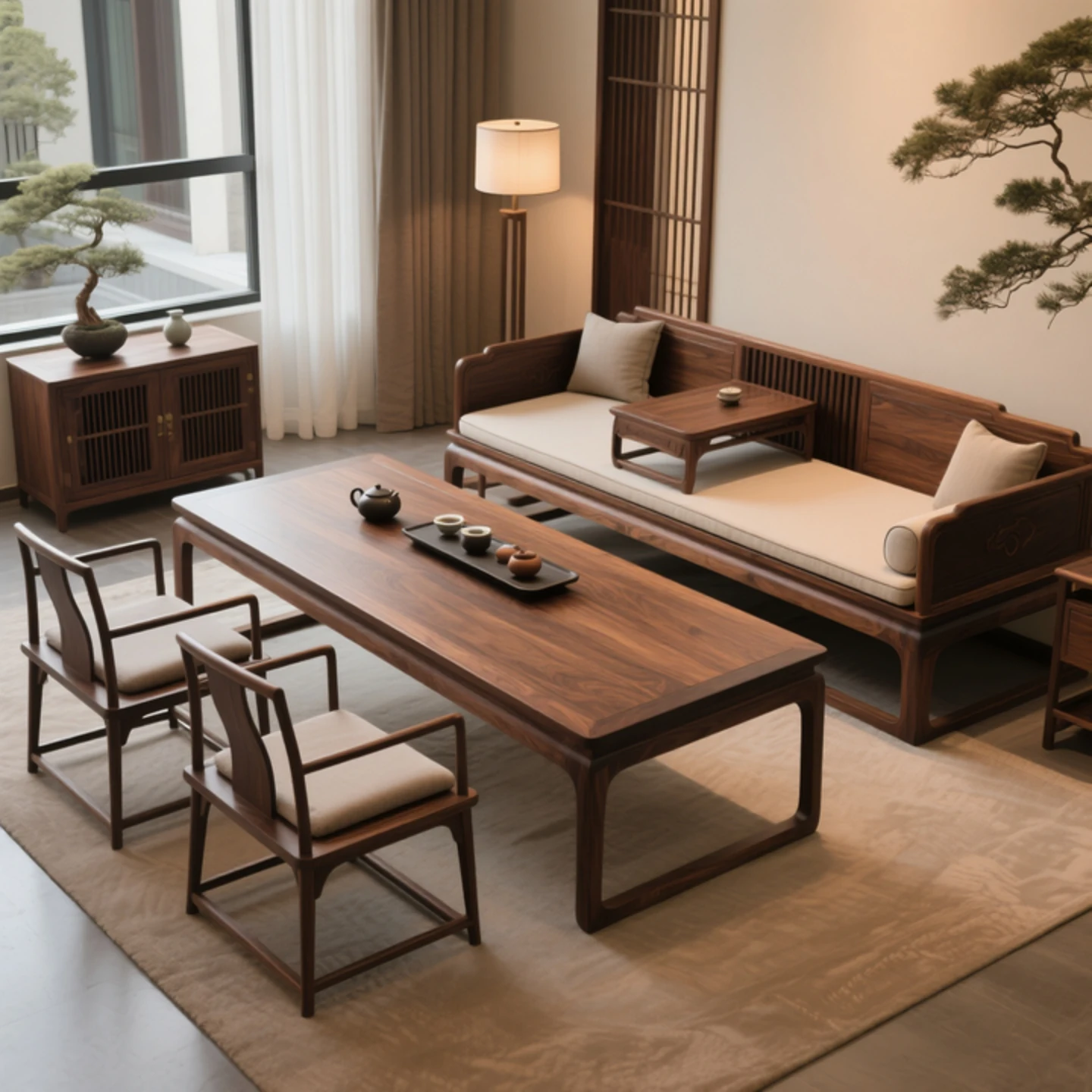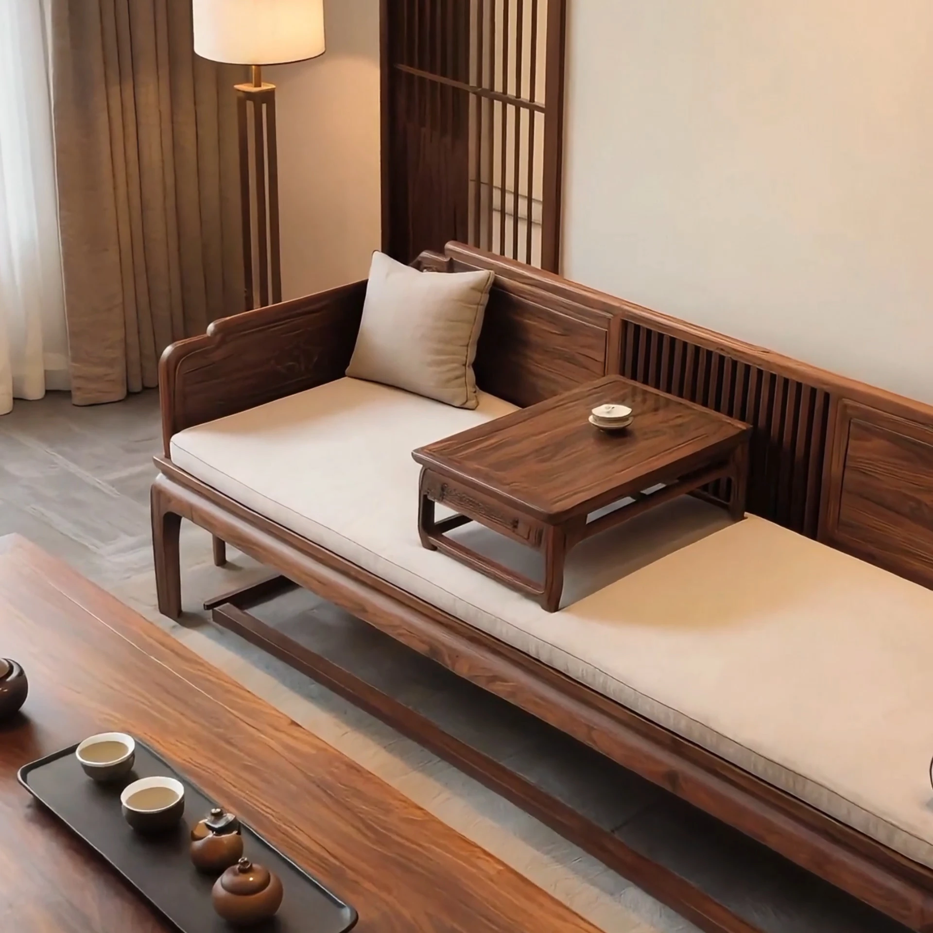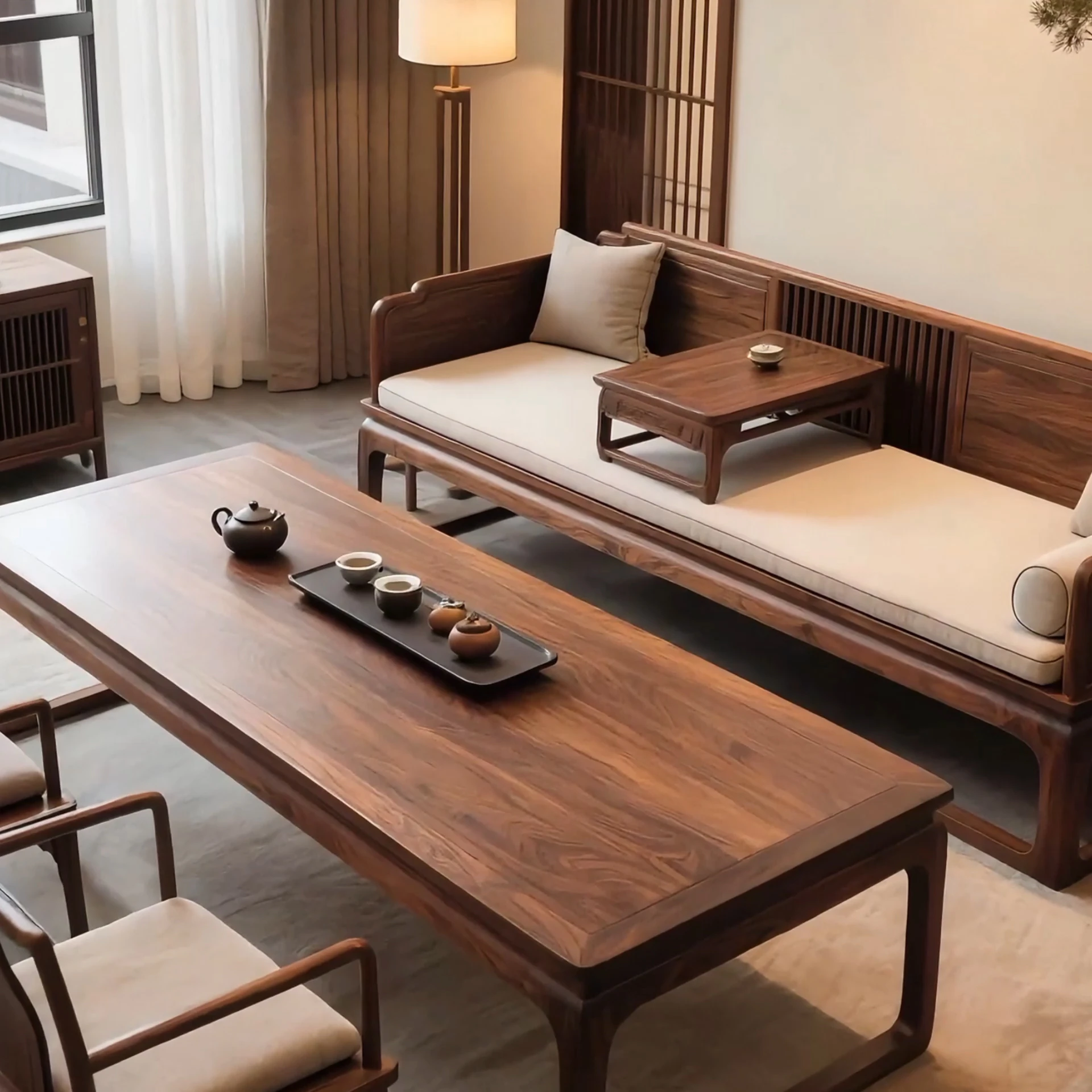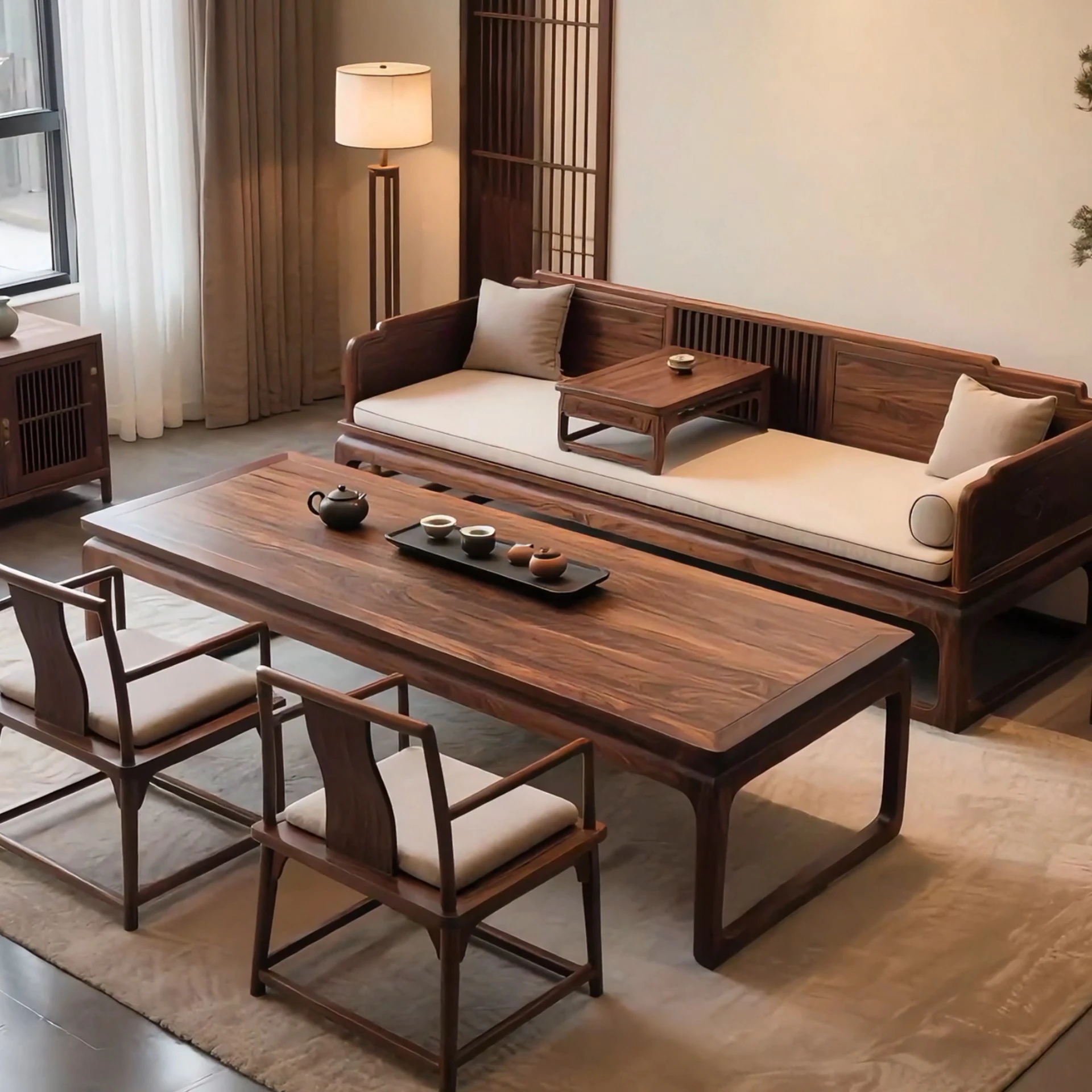Modern Chinese Solid Wood Luohan Bed Tea Table and Chair Set - Minimalist Design in North American Black Walnut for Kung Fu Tea Brewing, Perfect for Elegant Tea Ceremonies.