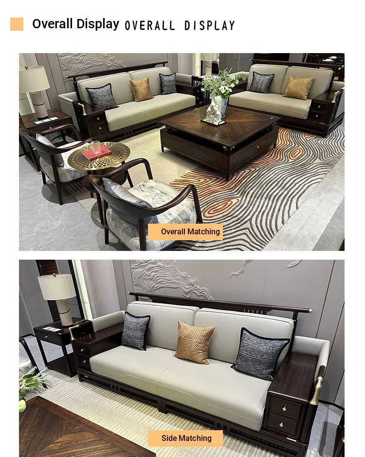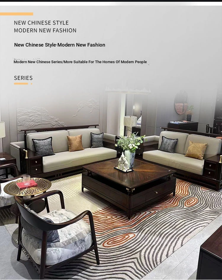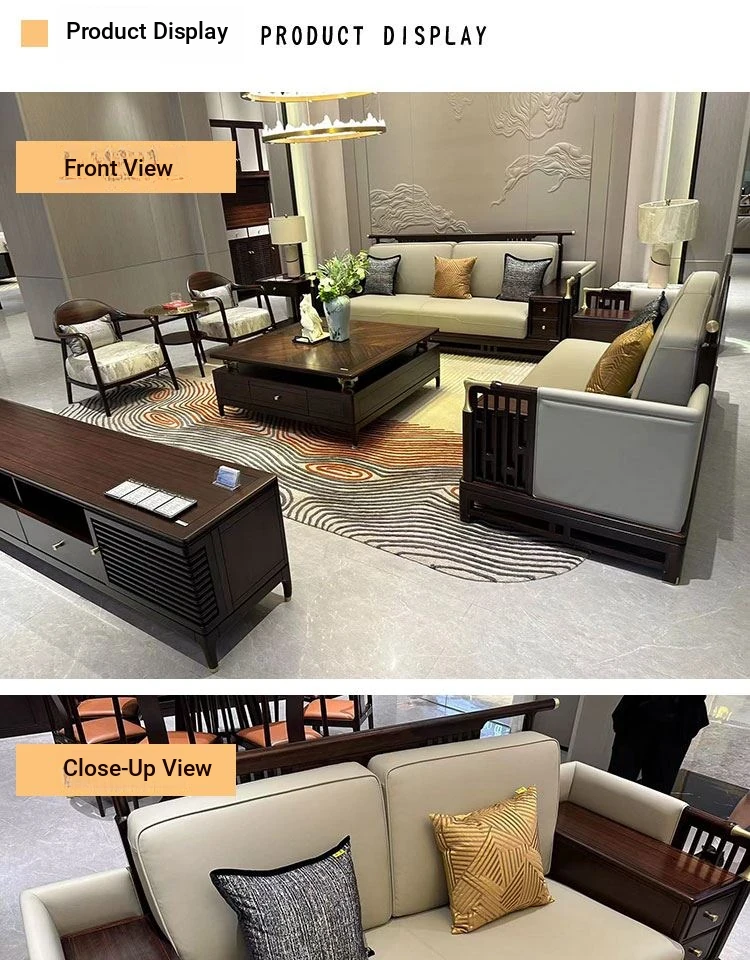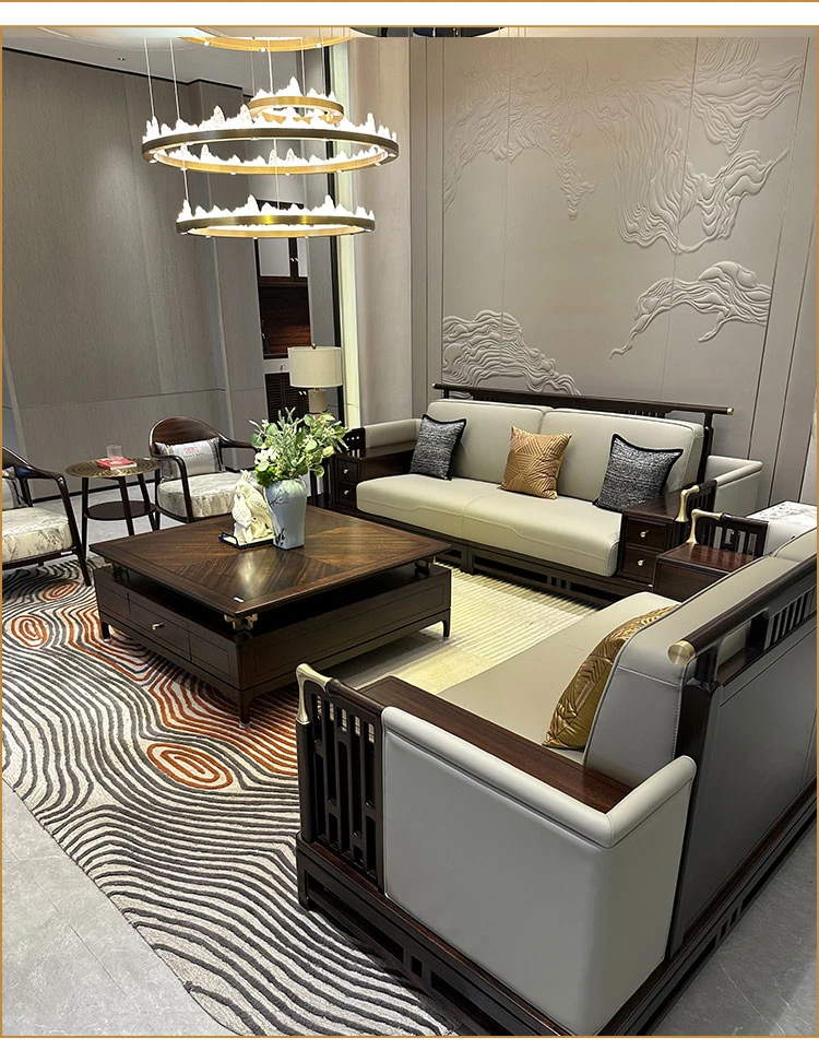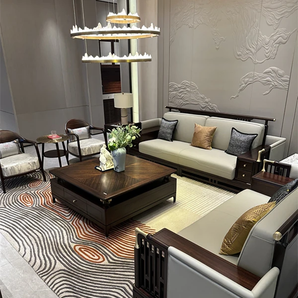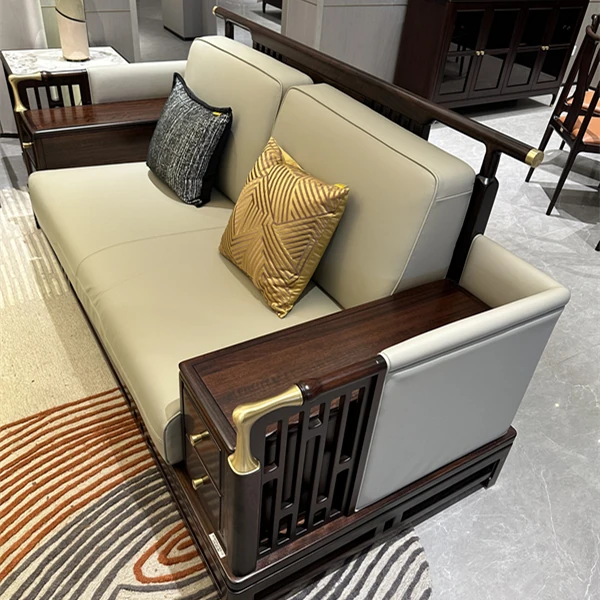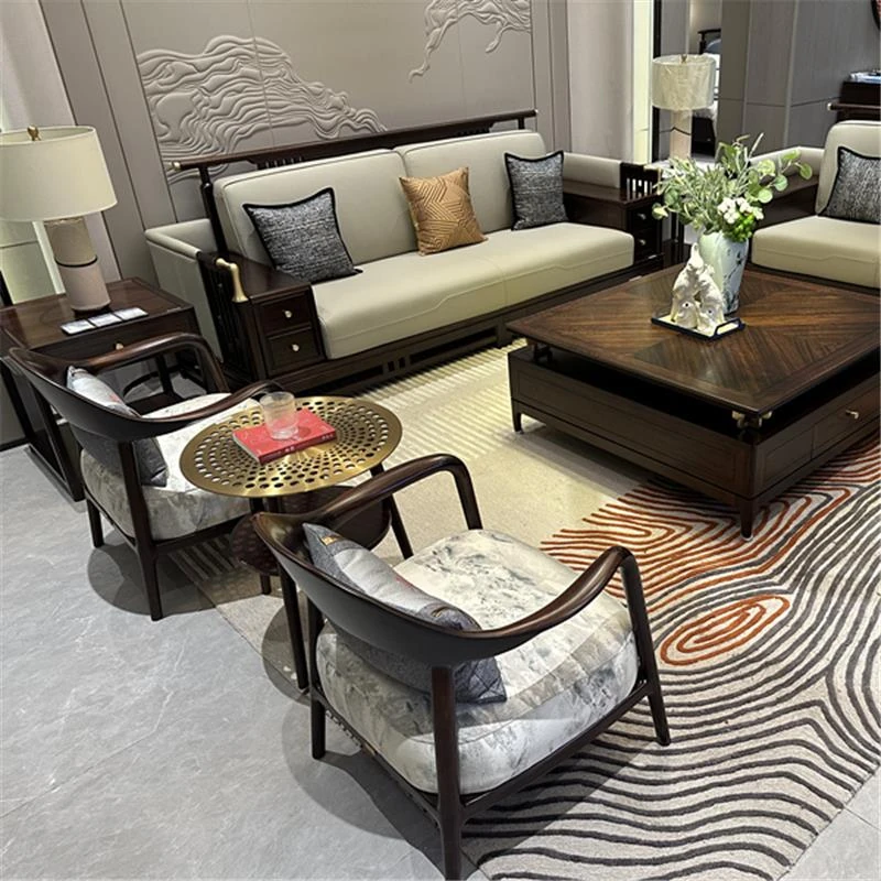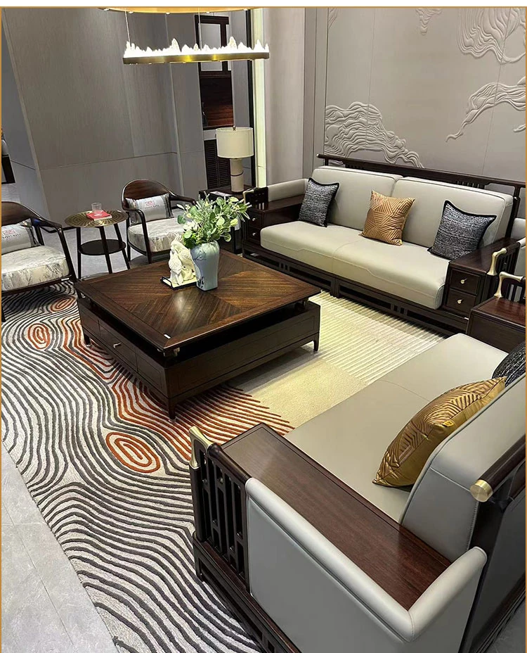 Modern Chinese Style Genuine Leather & Black Walnut Full Solid Wood Sofa Set - Elegant Minimalist Furniture for Large Villas and Clubhouses, Perfect for Living Rooms