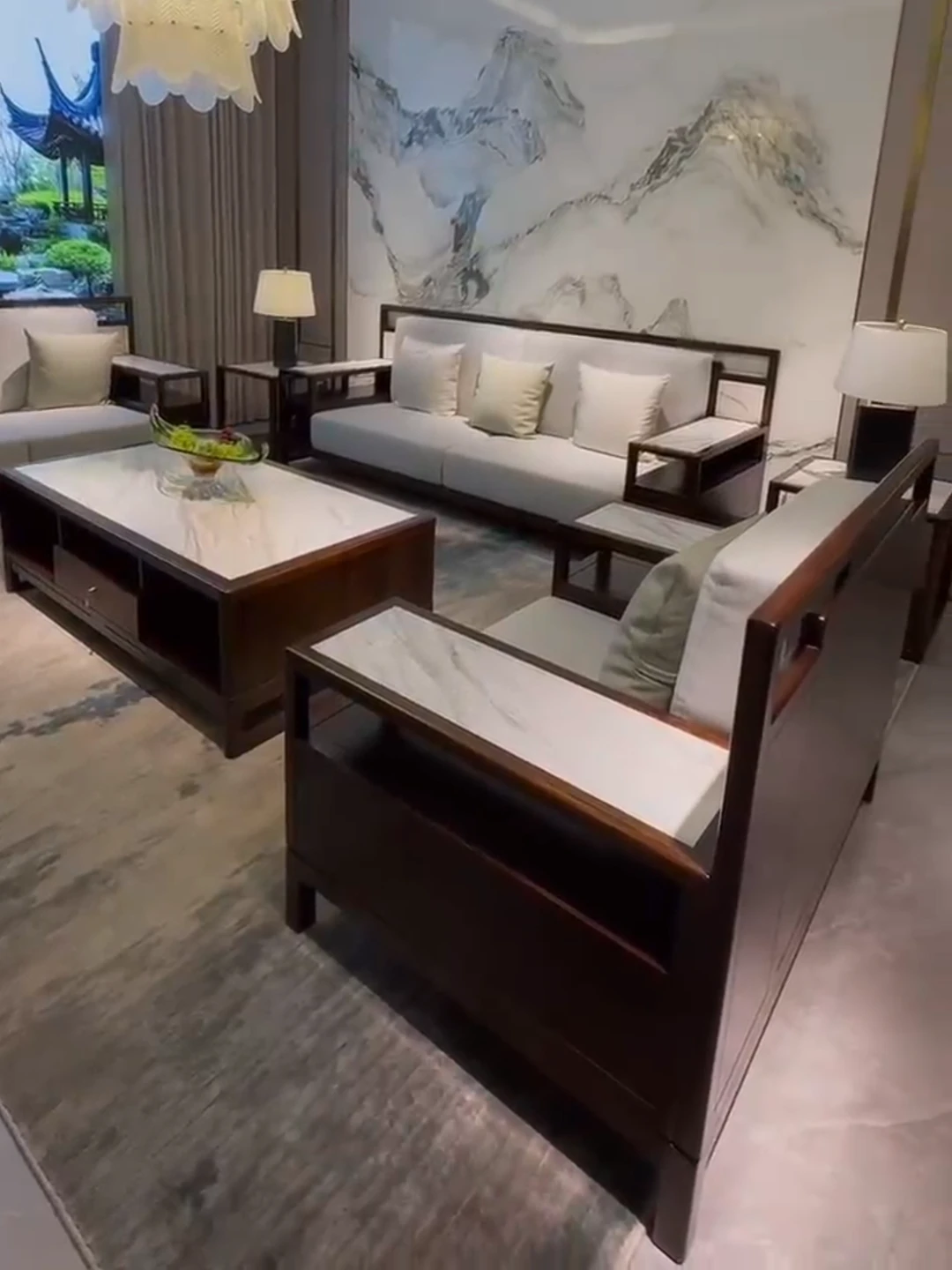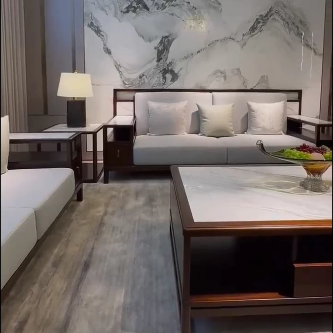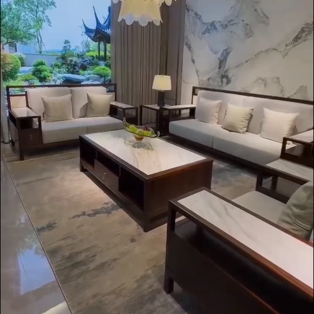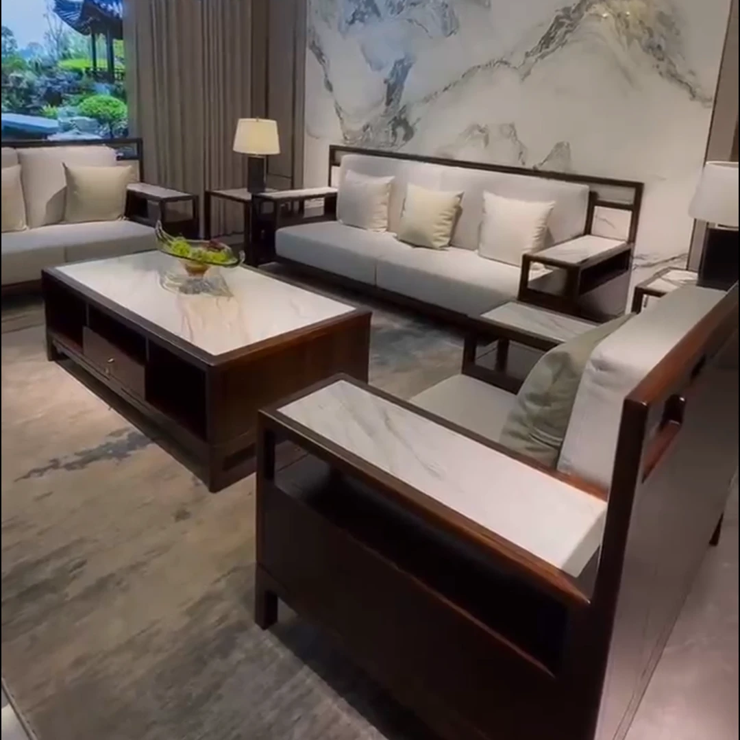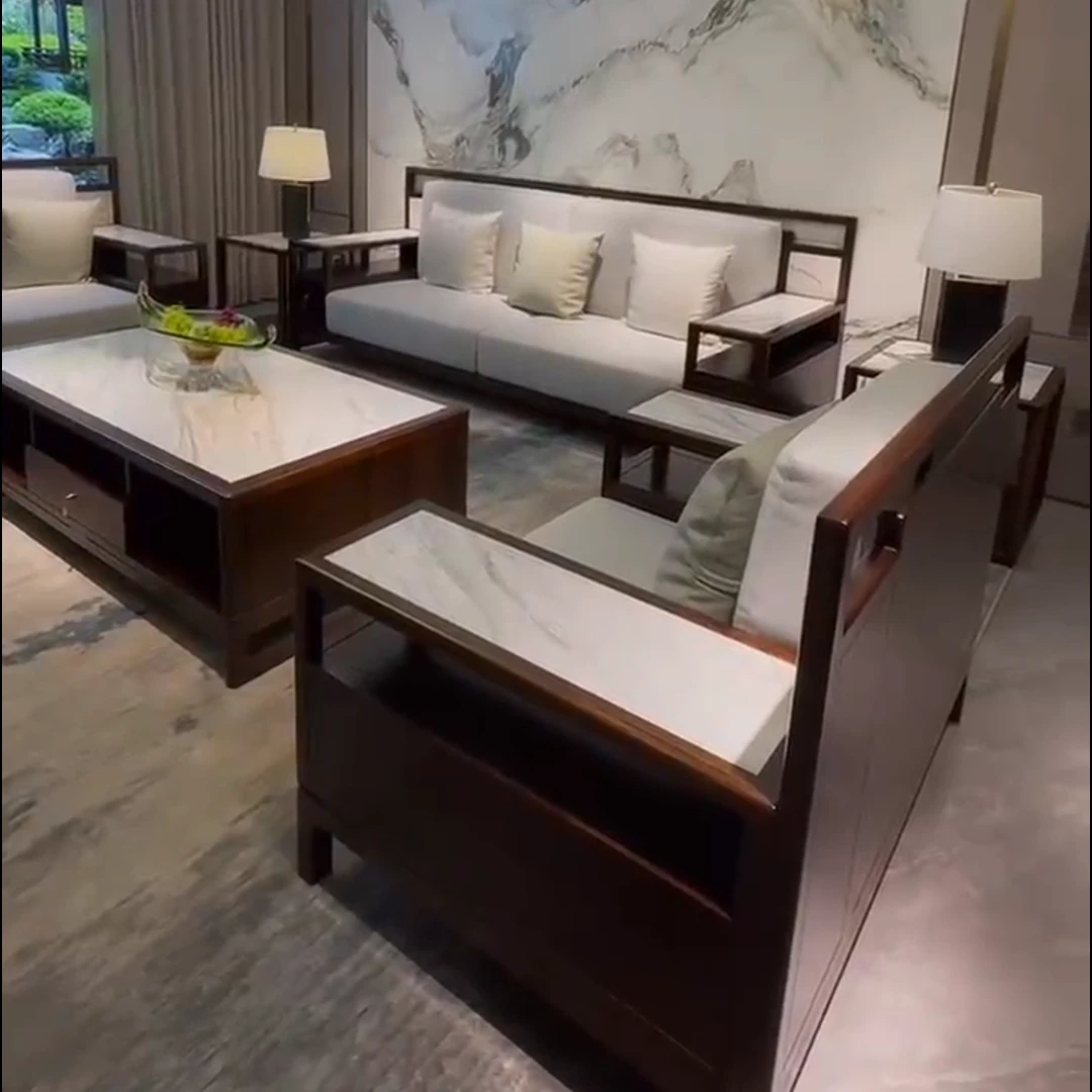 Modern Chinese-Style Solid Wood Black Gold Sofa Set - High-End Rock Plate Furniture for Living Room, Hotels, and Villas of All Sizes