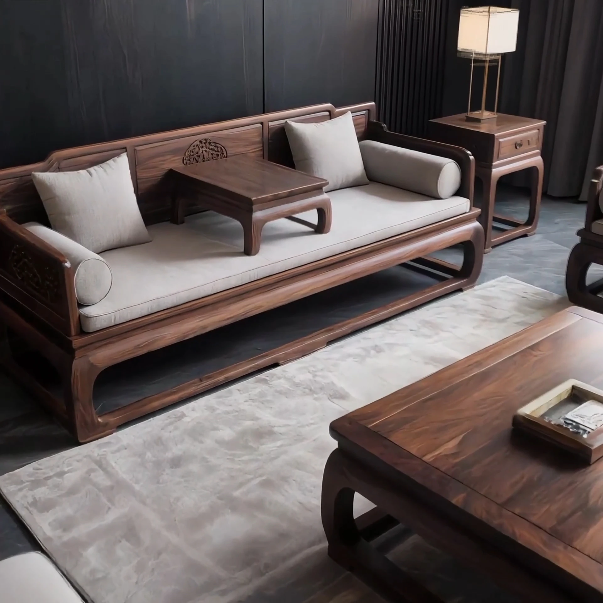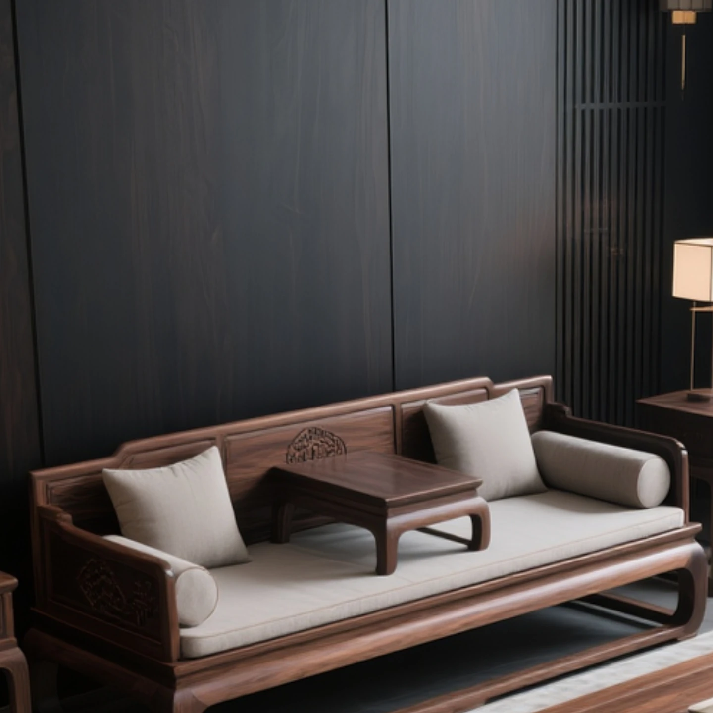 New Chinese Style Rohan Bed and Coffee Table Set - Solid North American Black Walnut Rohan Sofa Bed for Showroom and Homestay Furniture