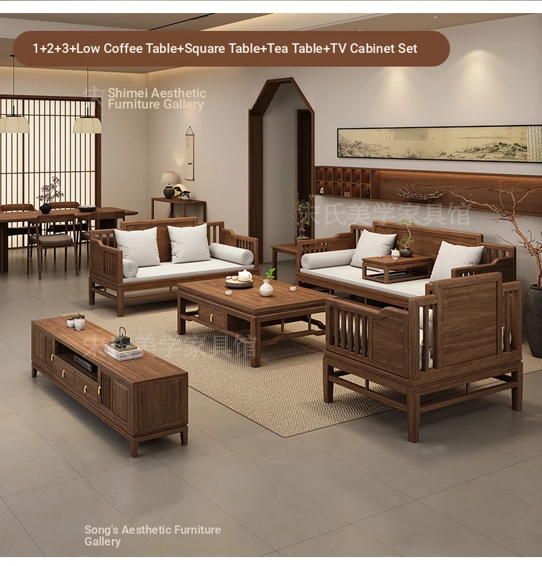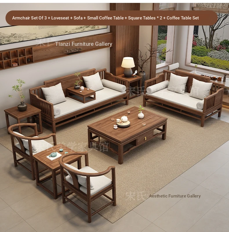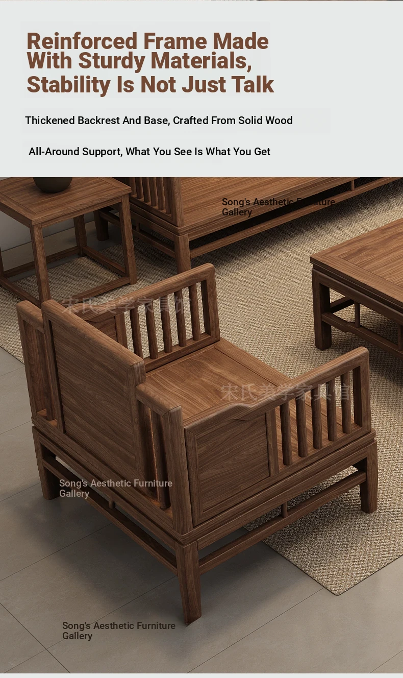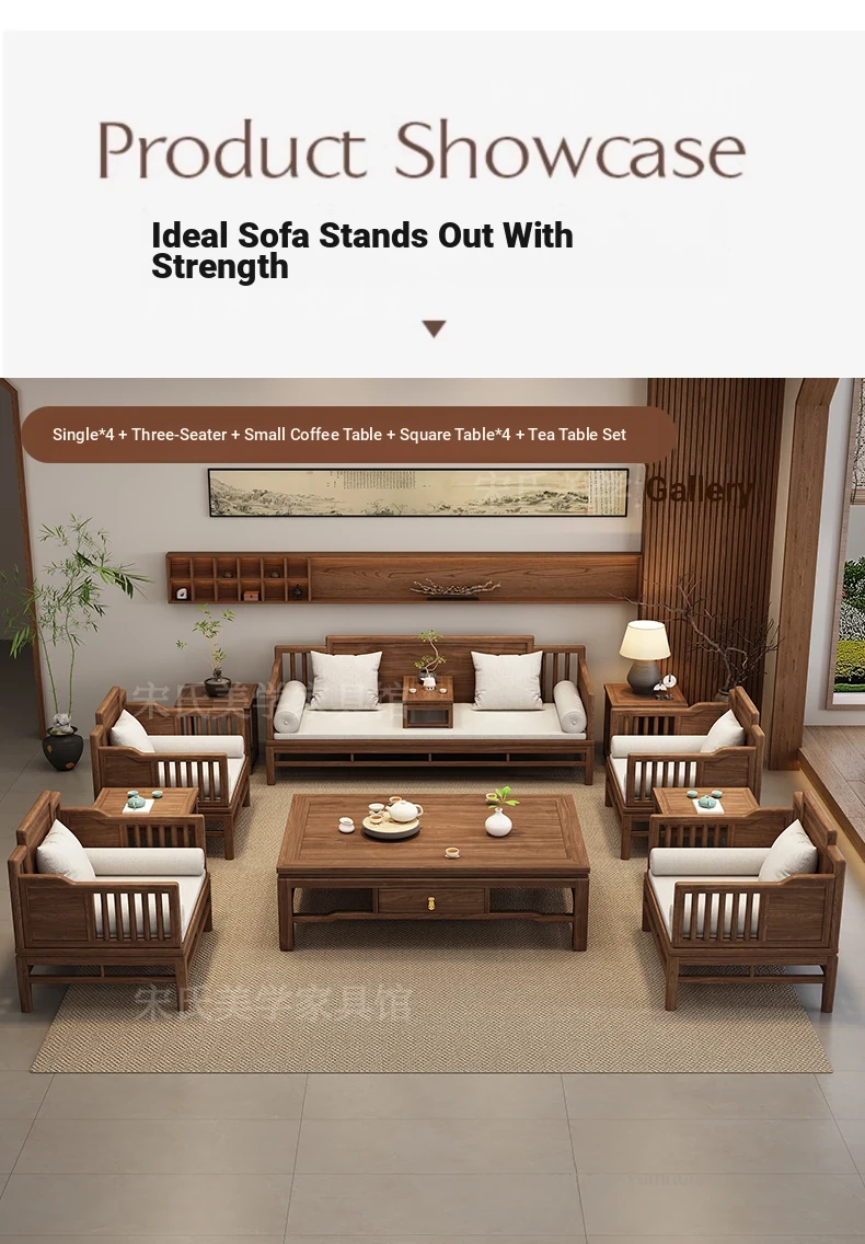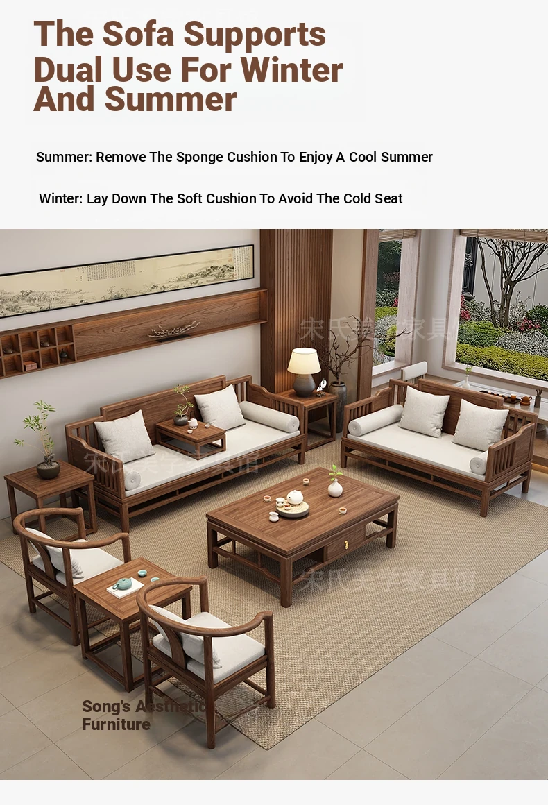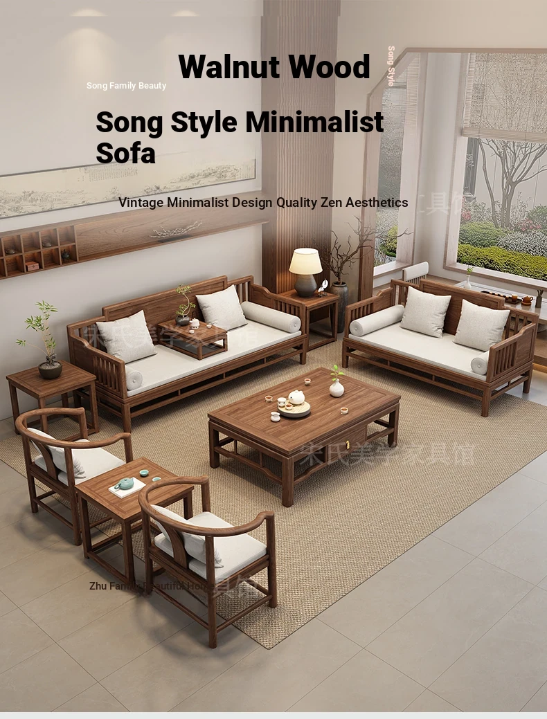 New Chinese Style Solid Walnut Sofa Set - Full Solid Wood, Perfect for Small Spaces, Featuring Modern Song Aesthetic and High-End Zen Furniture Design