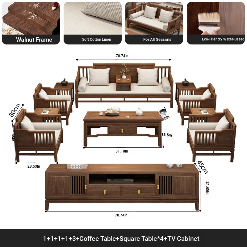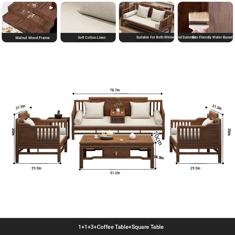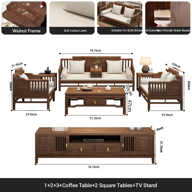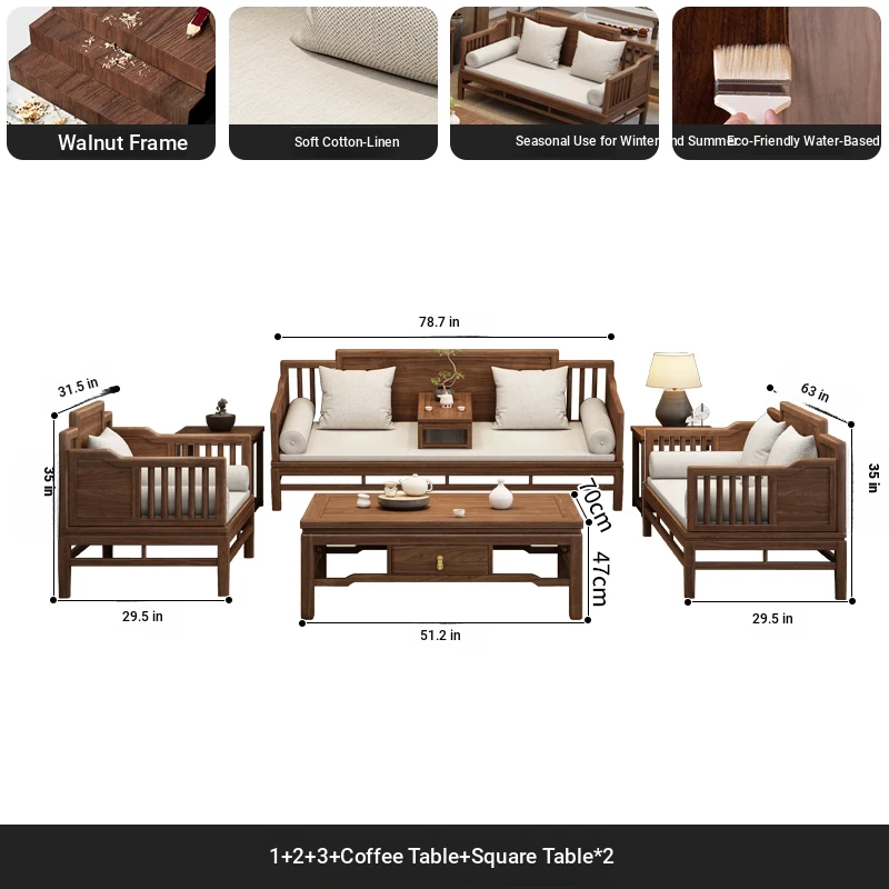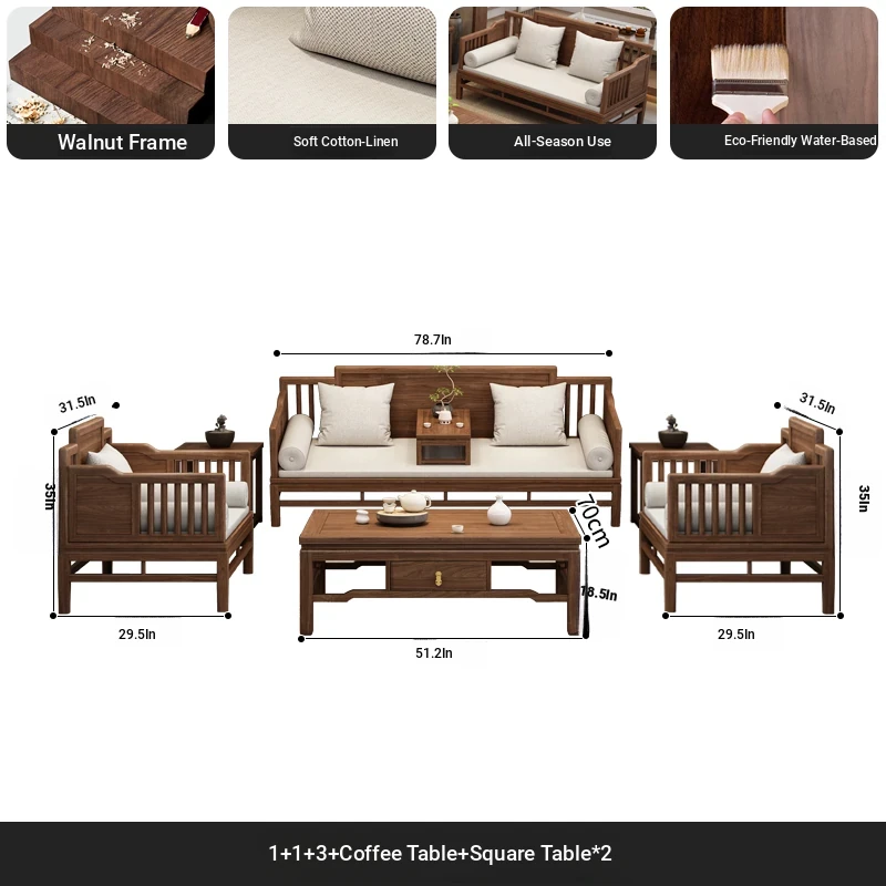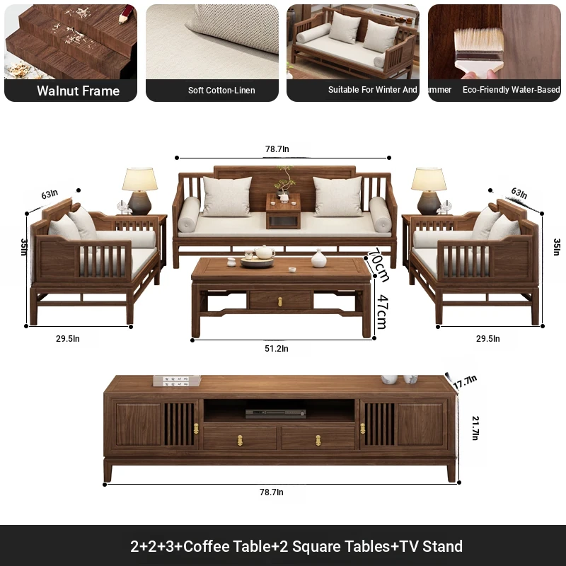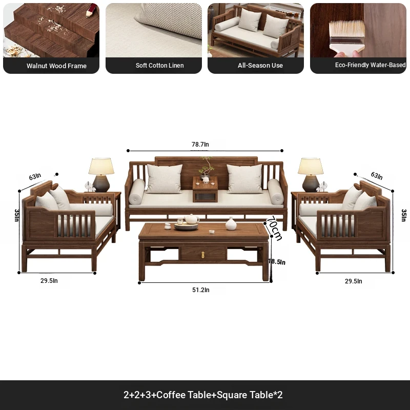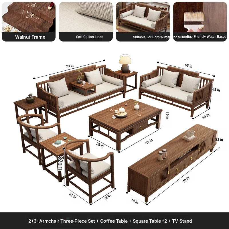New Chinese Style Solid Walnut Sofa Set - Full Solid Wood, Perfect for Small Spaces, Featuring Modern Song Aesthetic and High-End Zen Furniture Design
