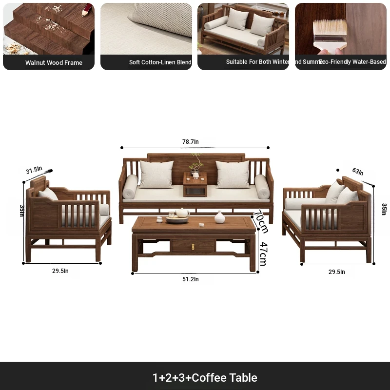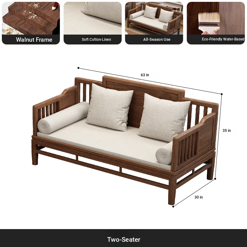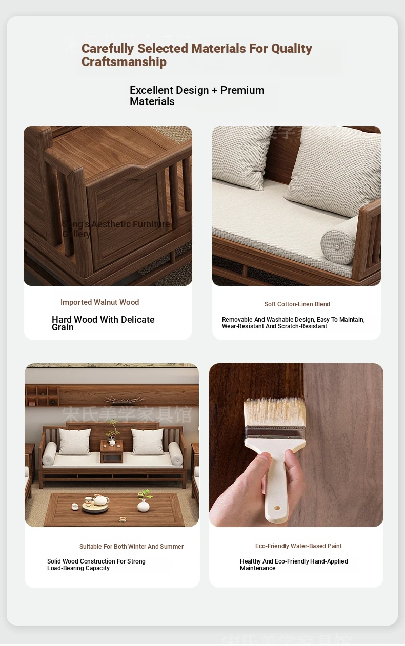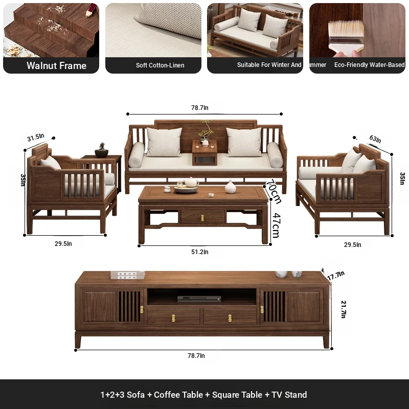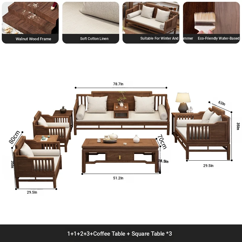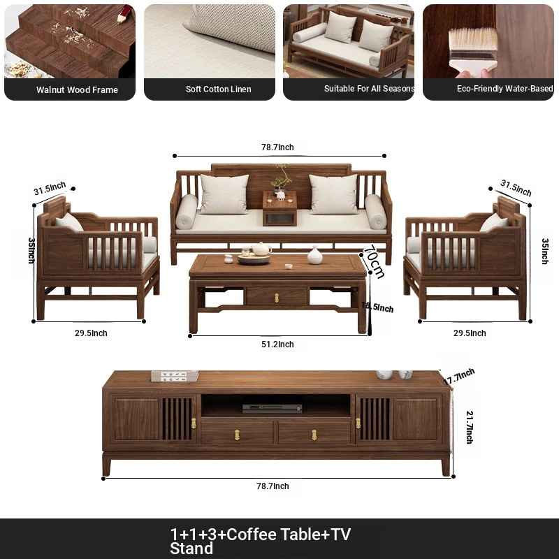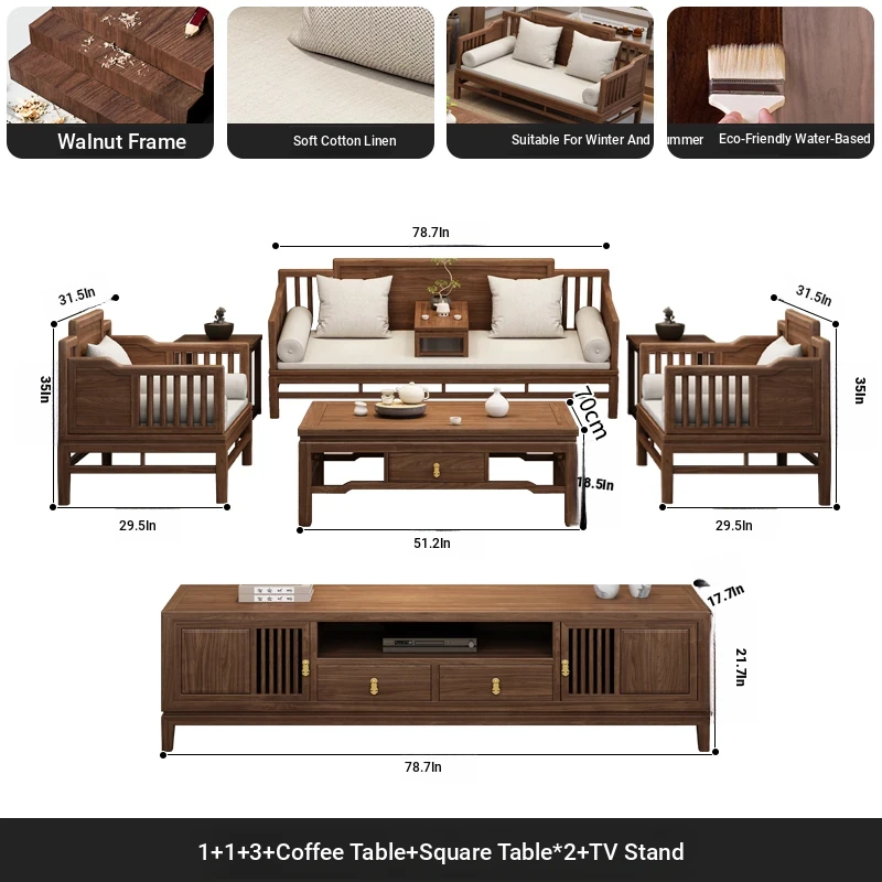 New Chinese Style Solid Walnut Sofa Set - Full Solid Wood, Perfect for Small Spaces, Featuring Modern Song Aesthetic and High-End Zen Furniture Design