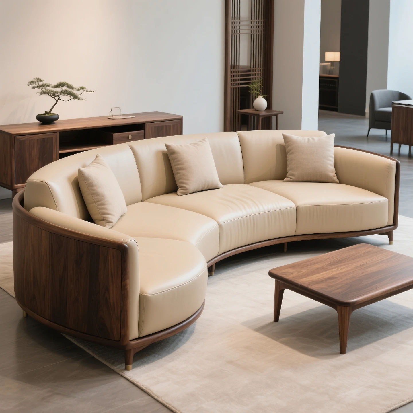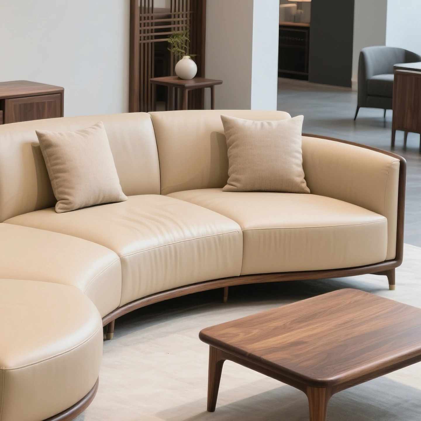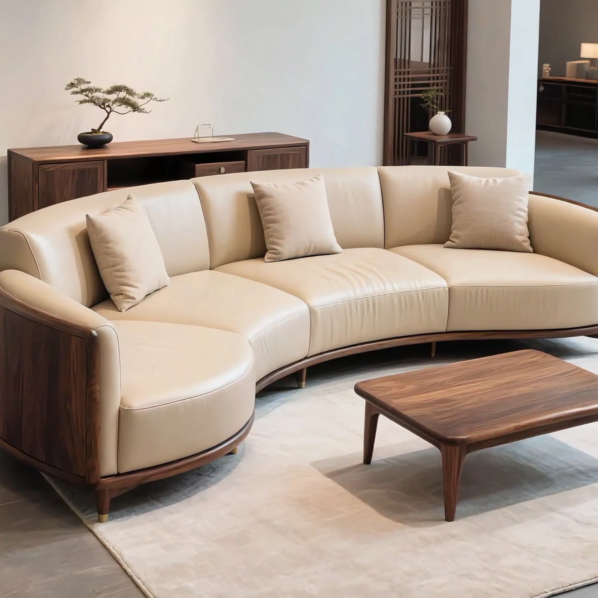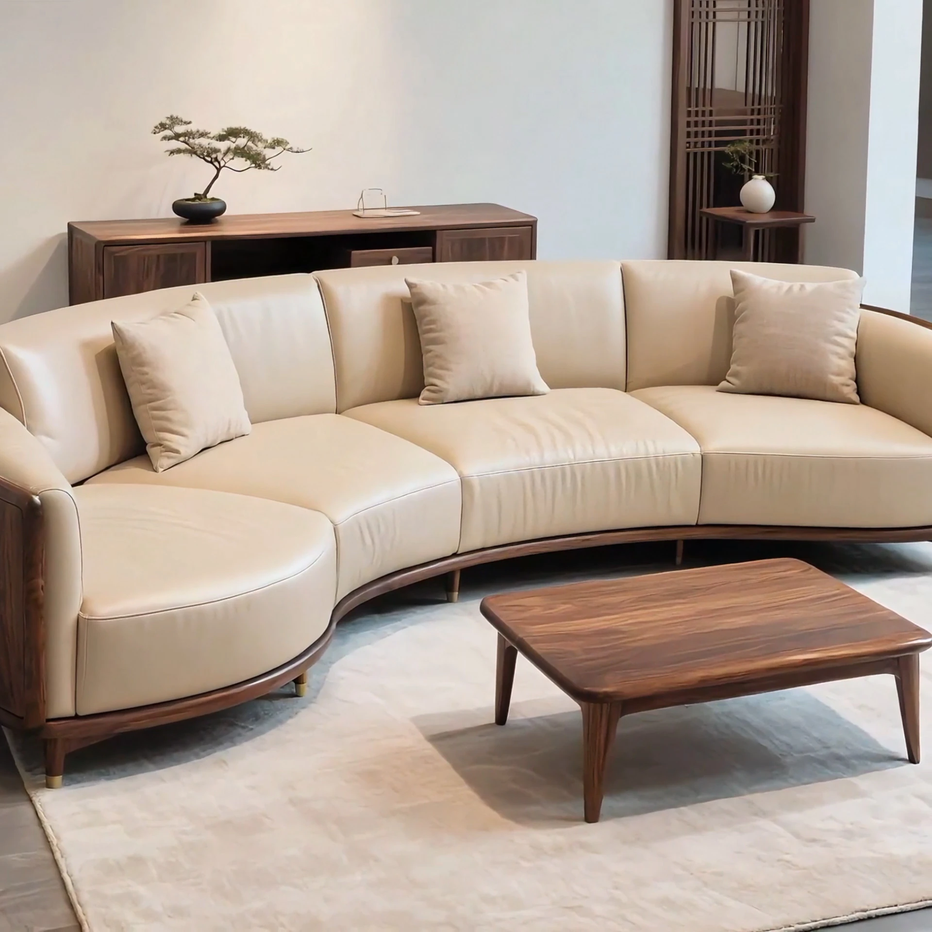 New Chinese-Style North American Black Walnut Solid Wood Leather Sofa - Creamy Italian Minimalist Luxury Crescent-Shaped Sofa