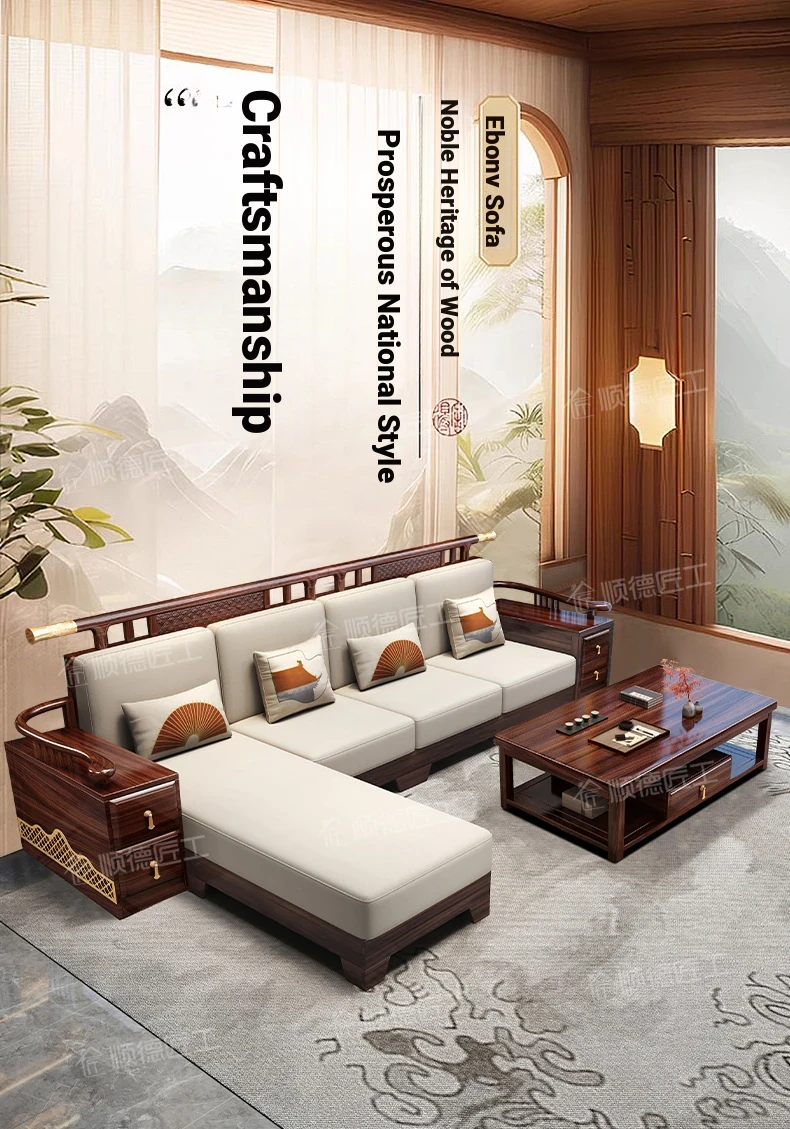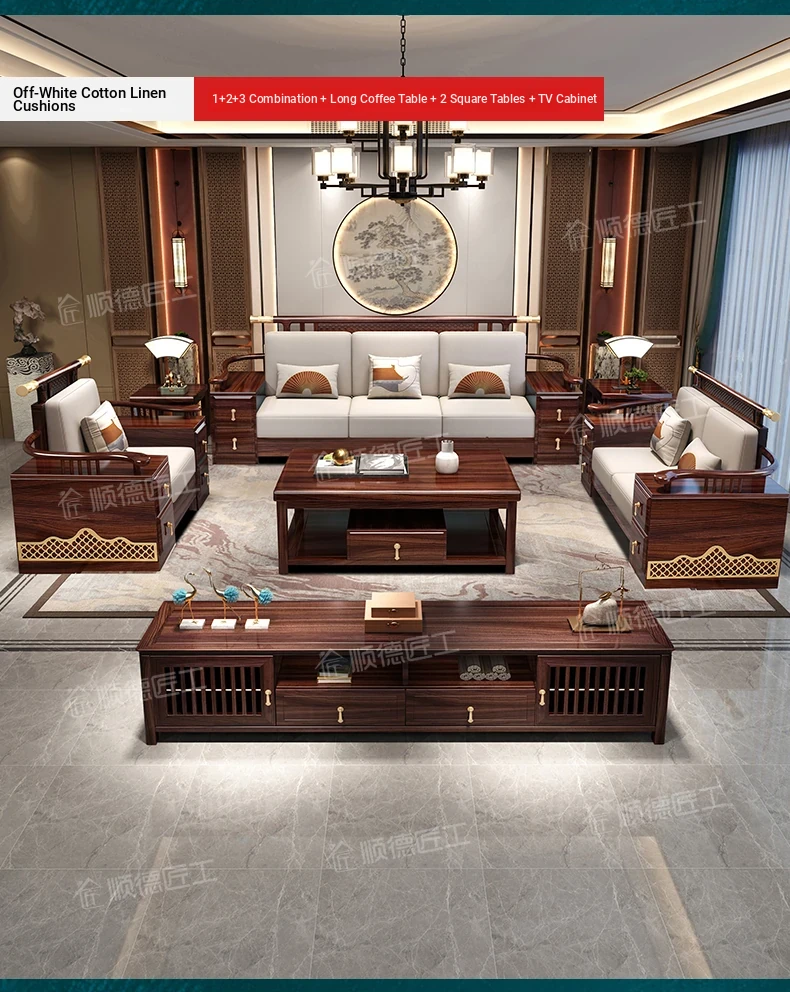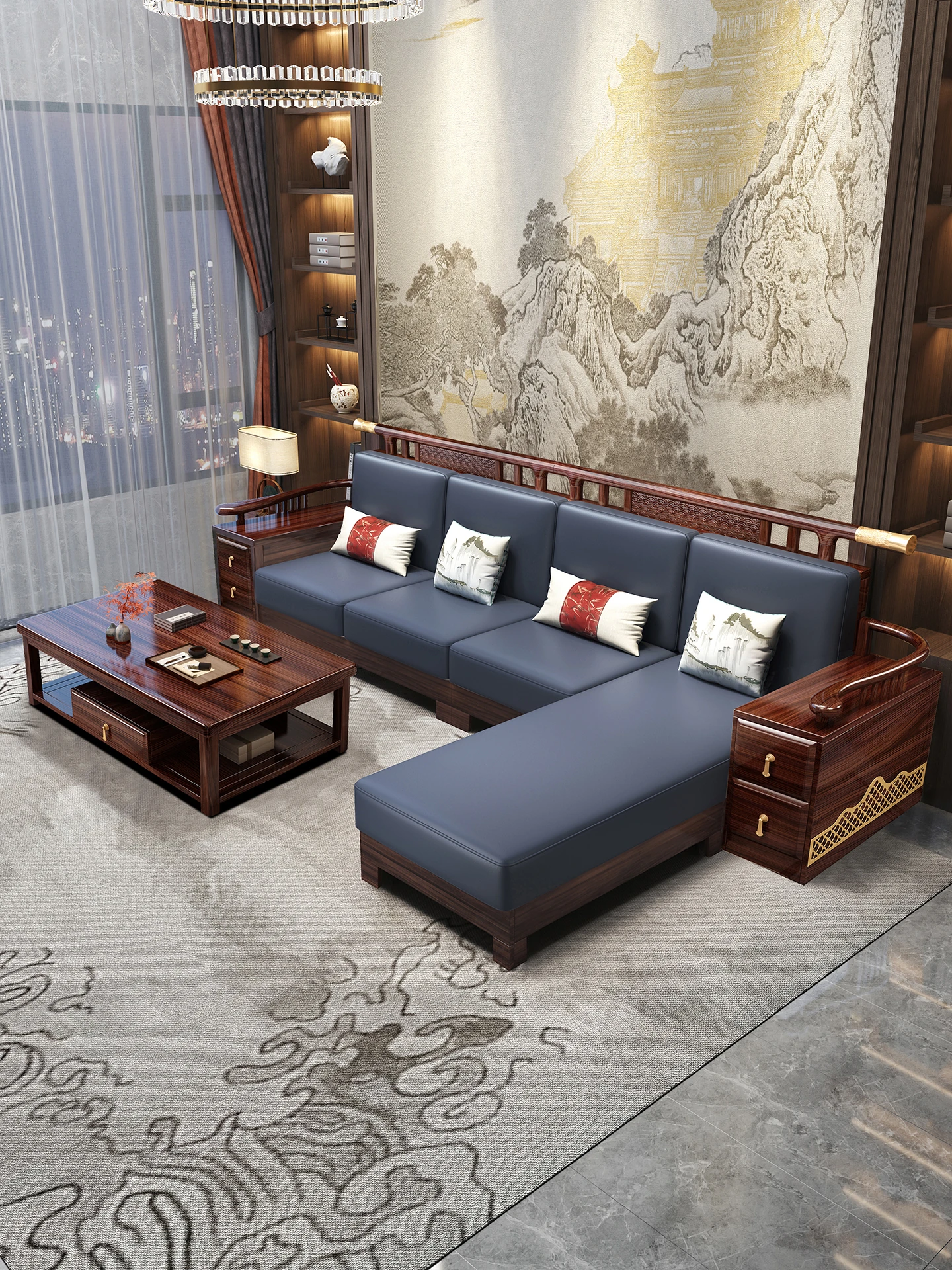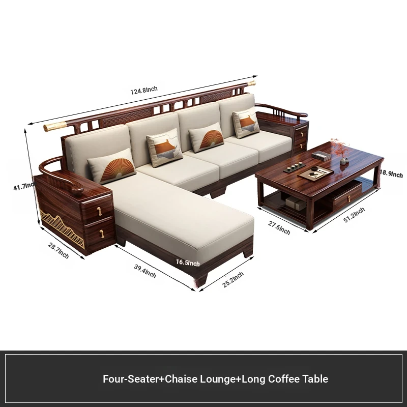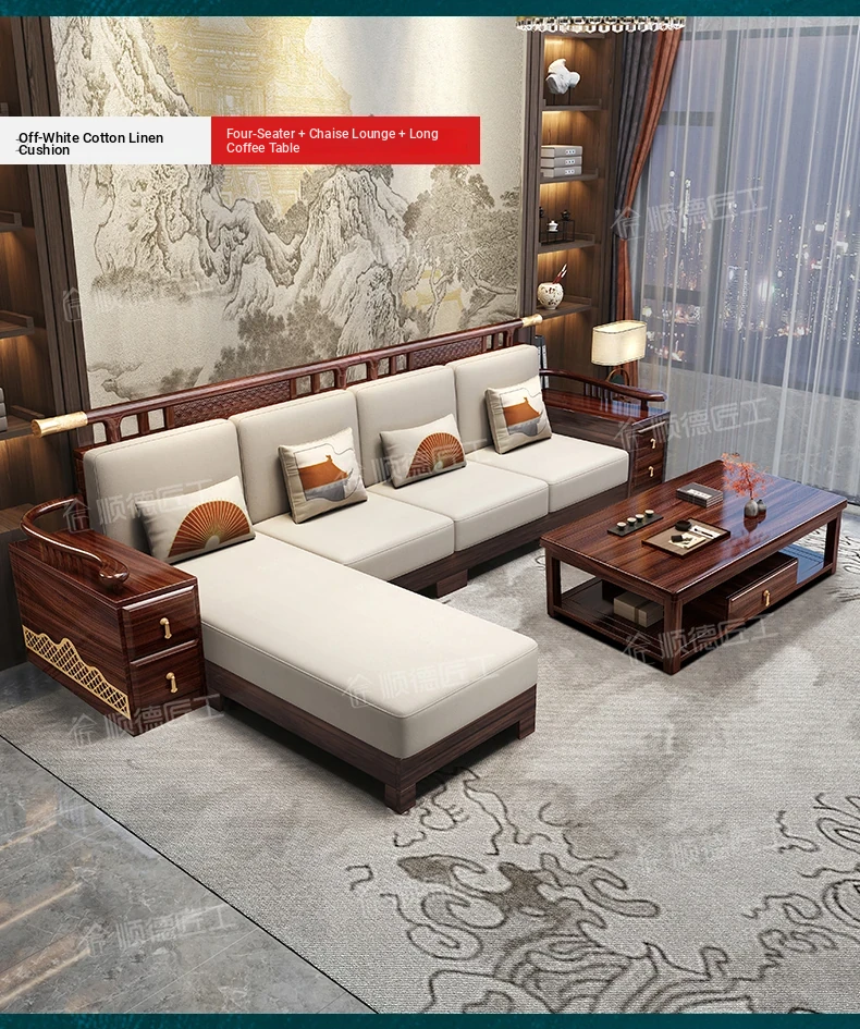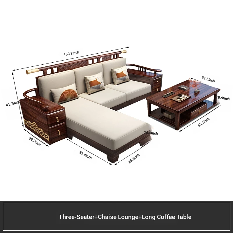 Premium Wu Jin Wood Solid Wood Sofa Set 1+2+3 - New Chinese Style Light Luxury Corner Chaise Lounge for Living Room - Elegant Chinese Wooden Furniture