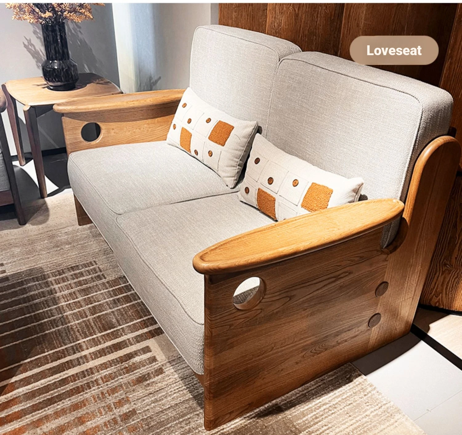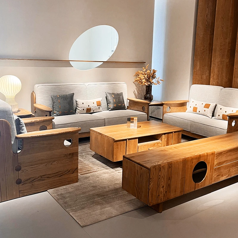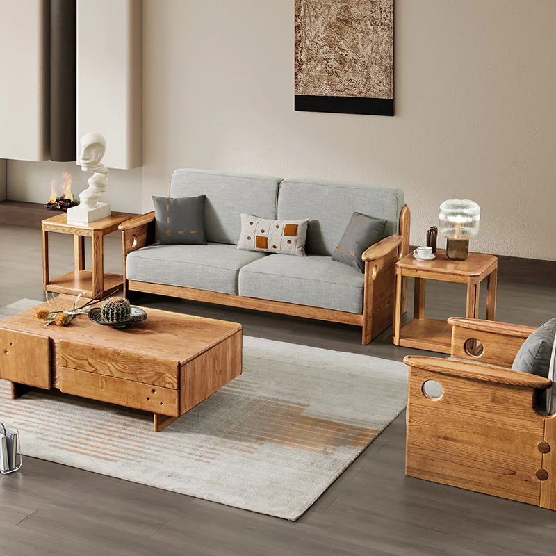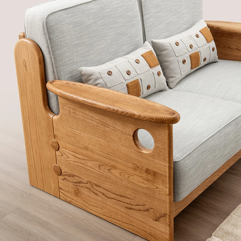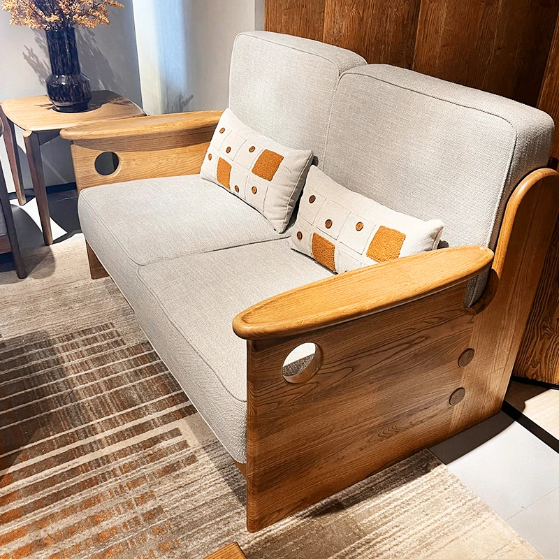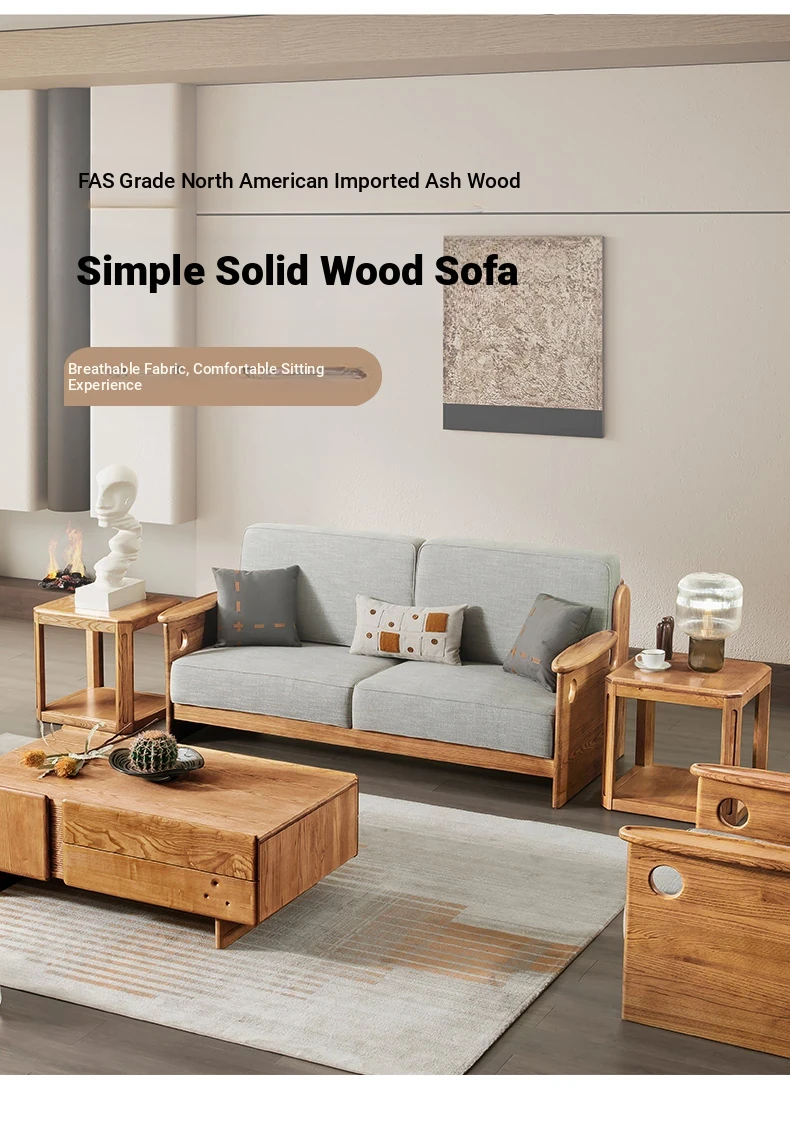Solid Wood Sofa with New Chinese Style - White Ash Small Apartment Living Room Furniture, Minimalist Design with Tech Fabric, Cat Scratch Resistant