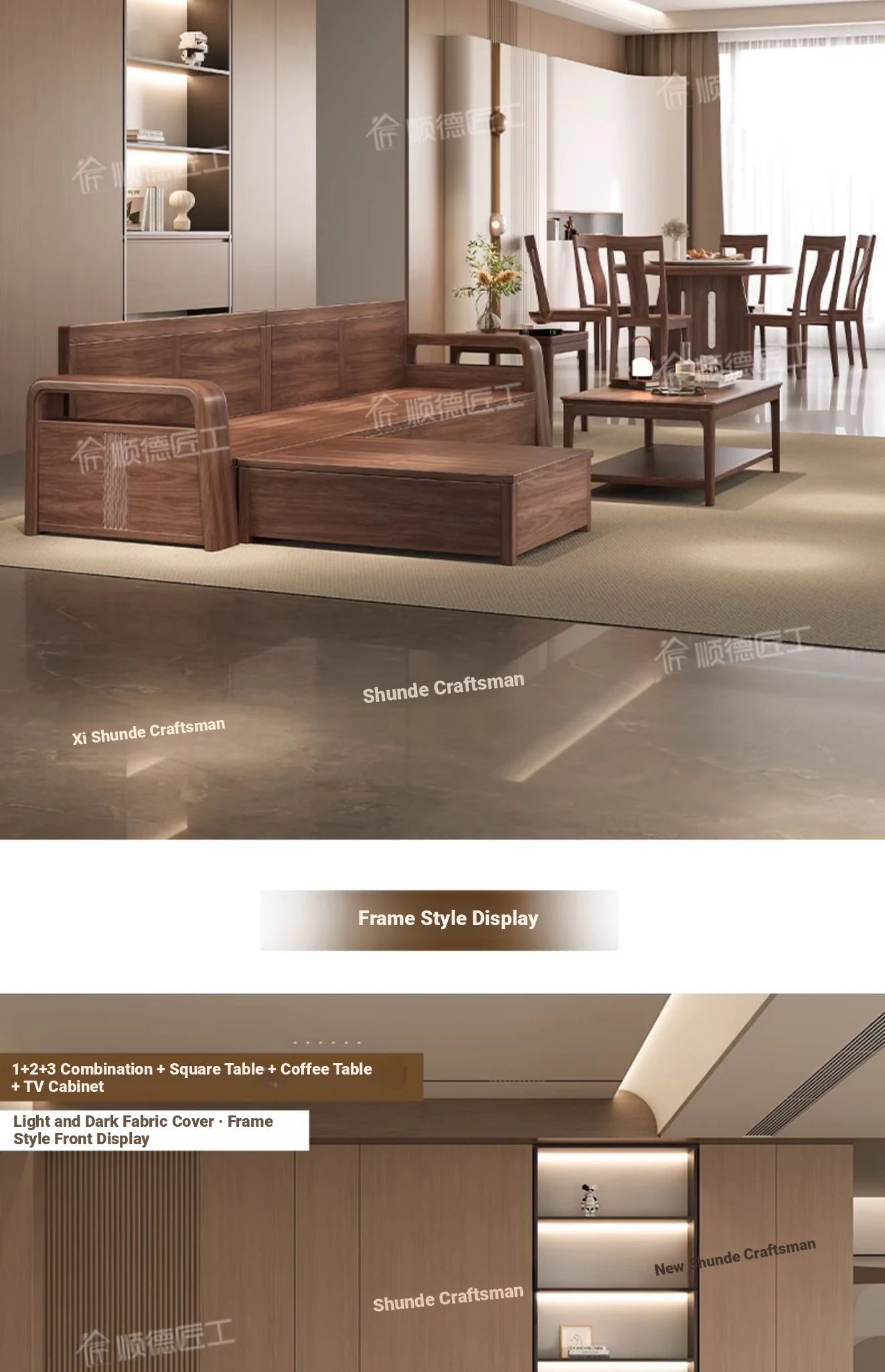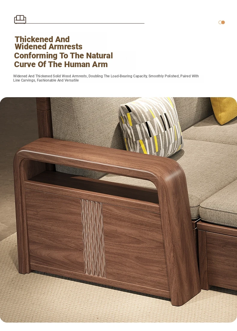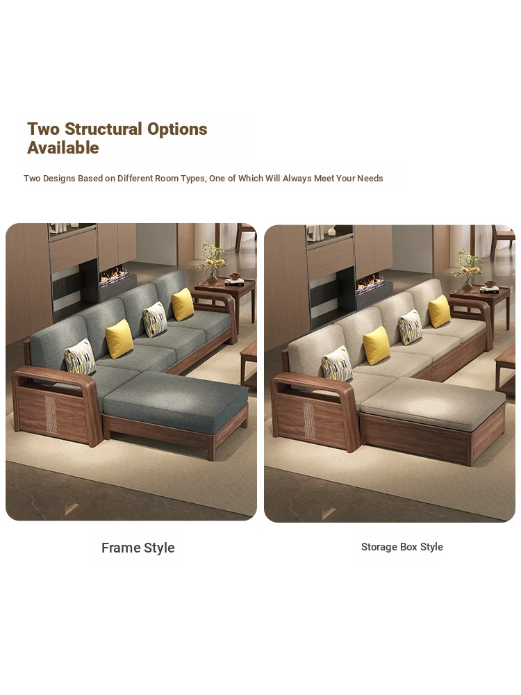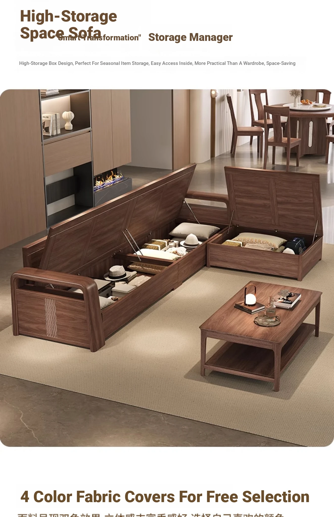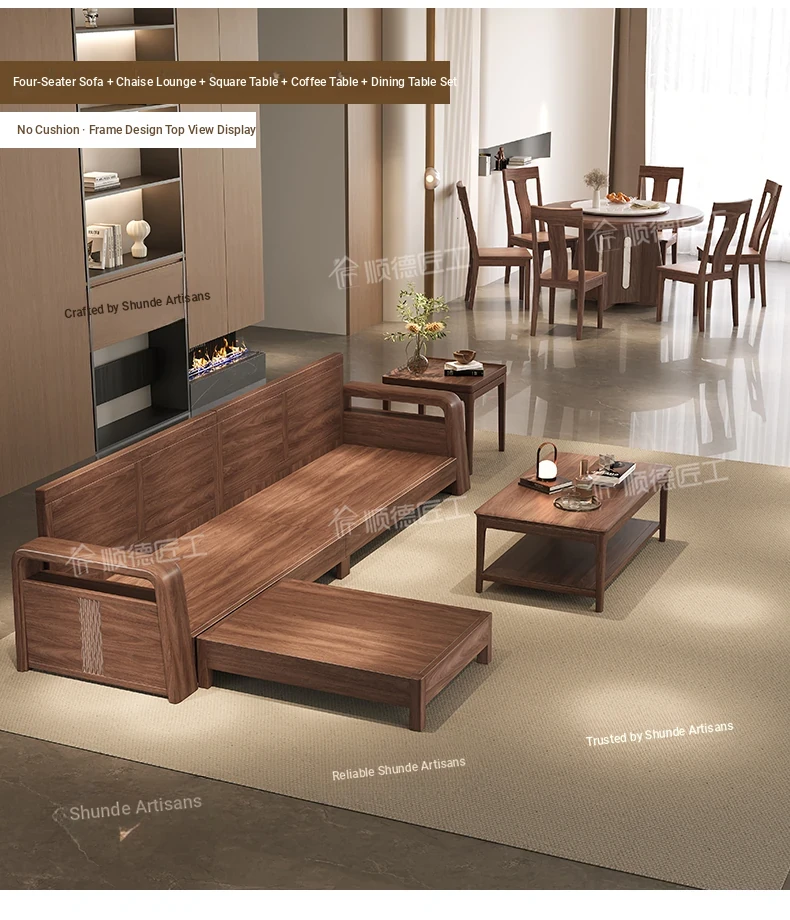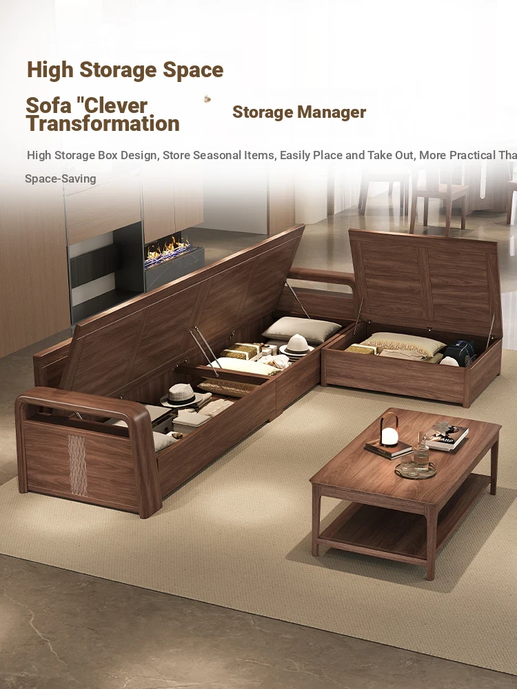 Stylish Black Walnut Solid Wood Sofa - New Chinese Style, Versatile Winter-Summer Corner Storage, Exquisite Carvings, Minimalist Design Perfect for Small Living Rooms