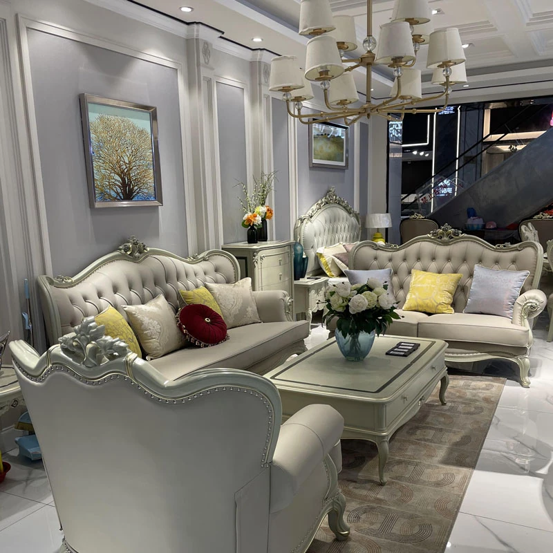 French Genuine Leather Solid Wood Dream Blue Sofa - Elegant European Style Luxury Furniture Set for Small Apartments and Villas - Perfect for Living Rooms and Suites