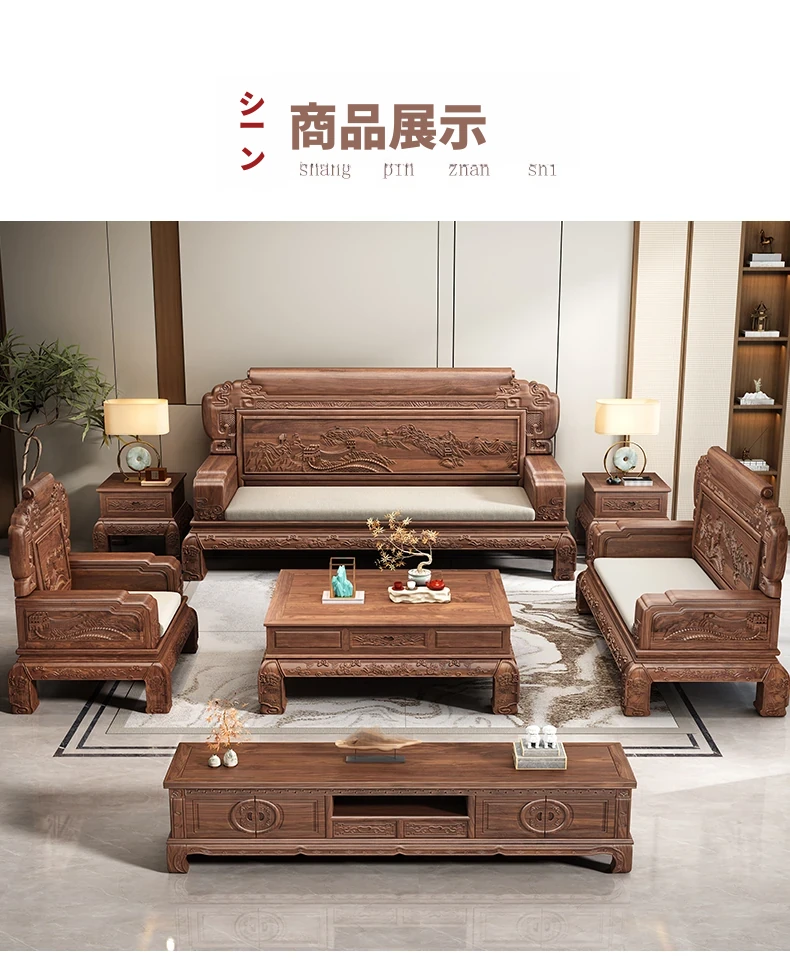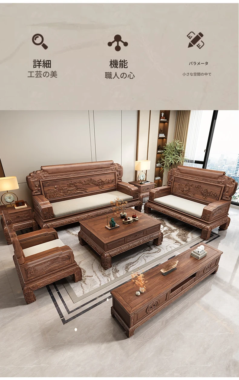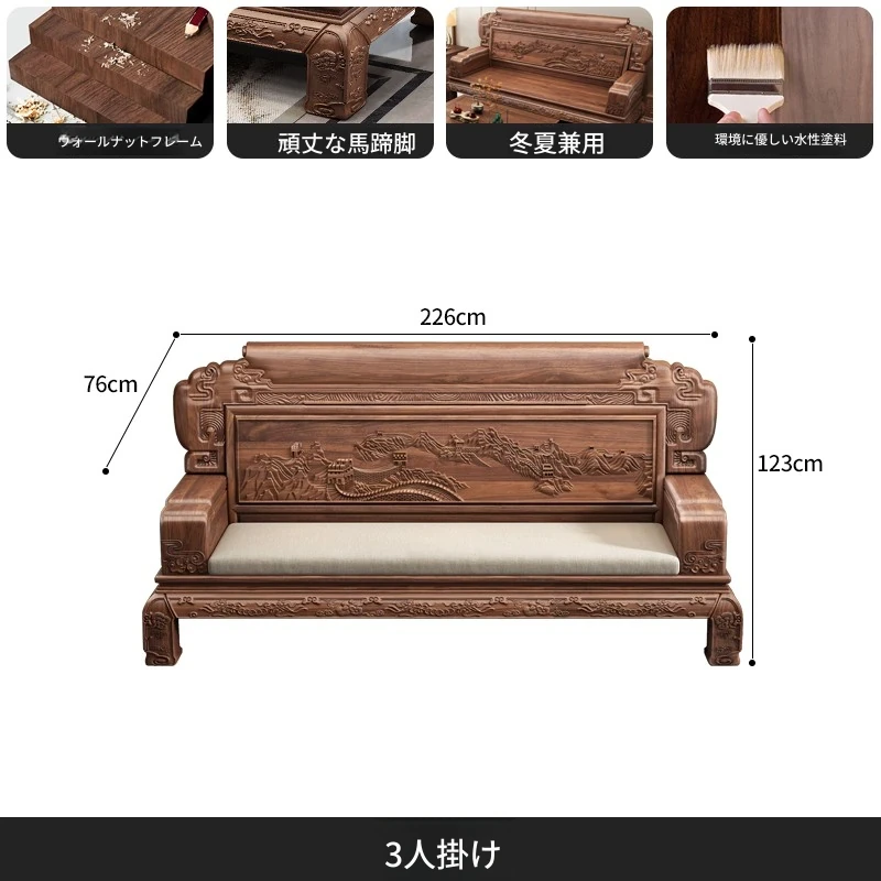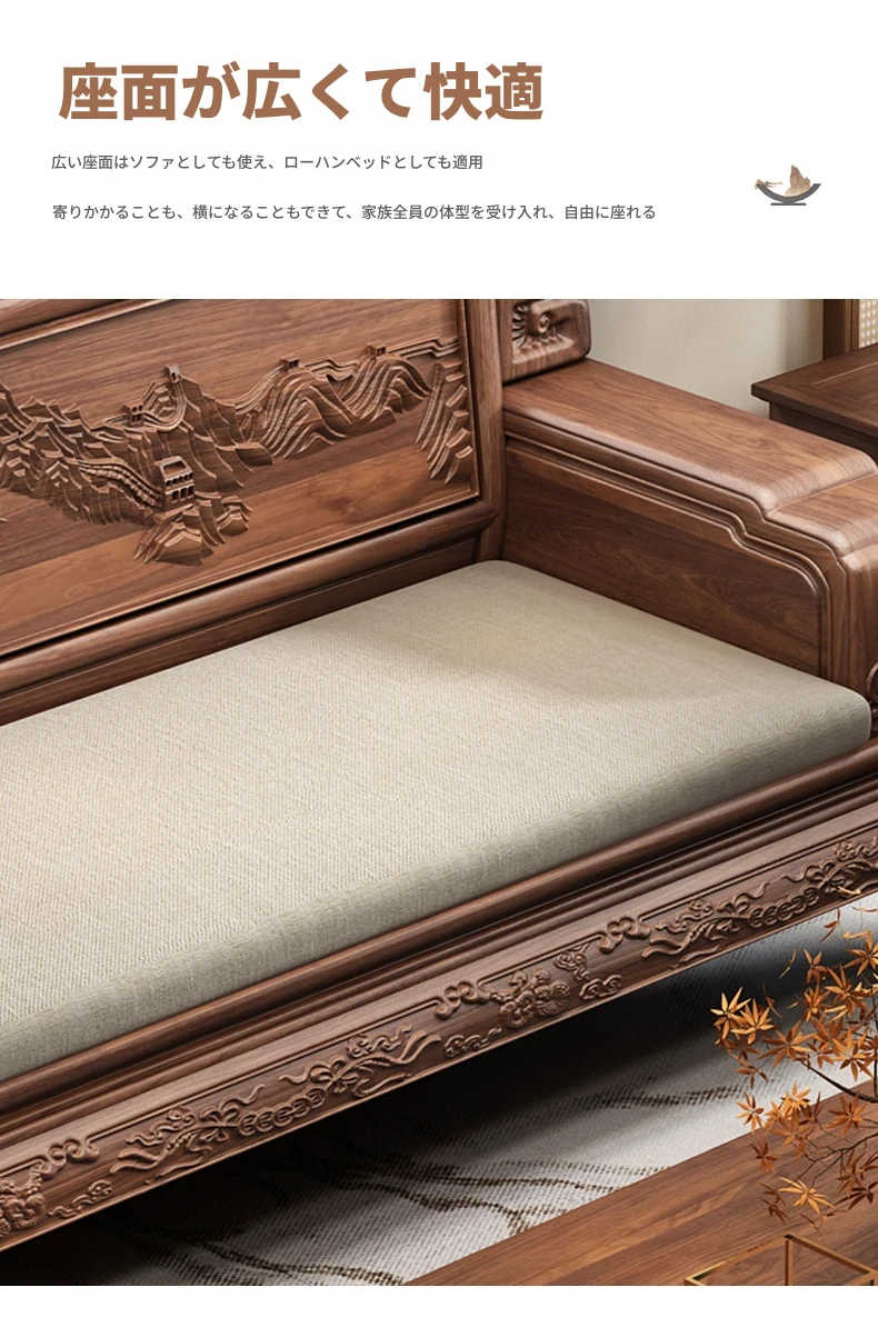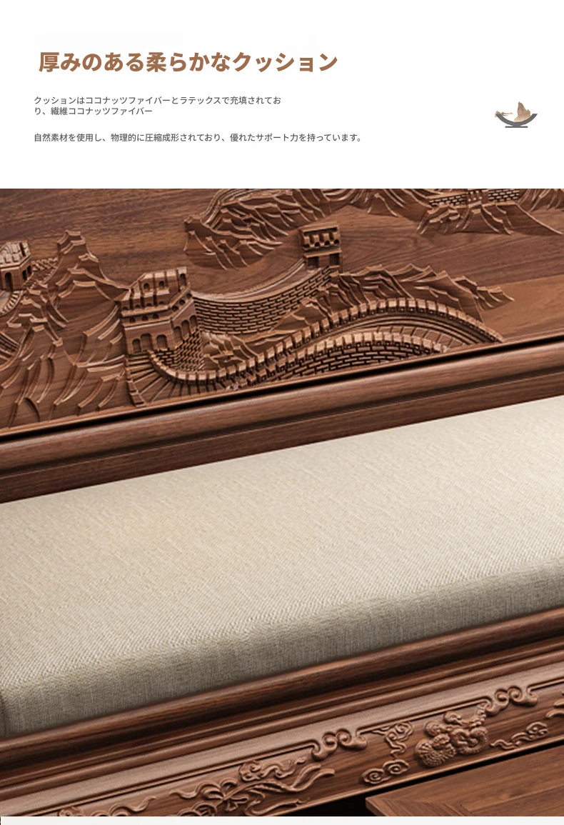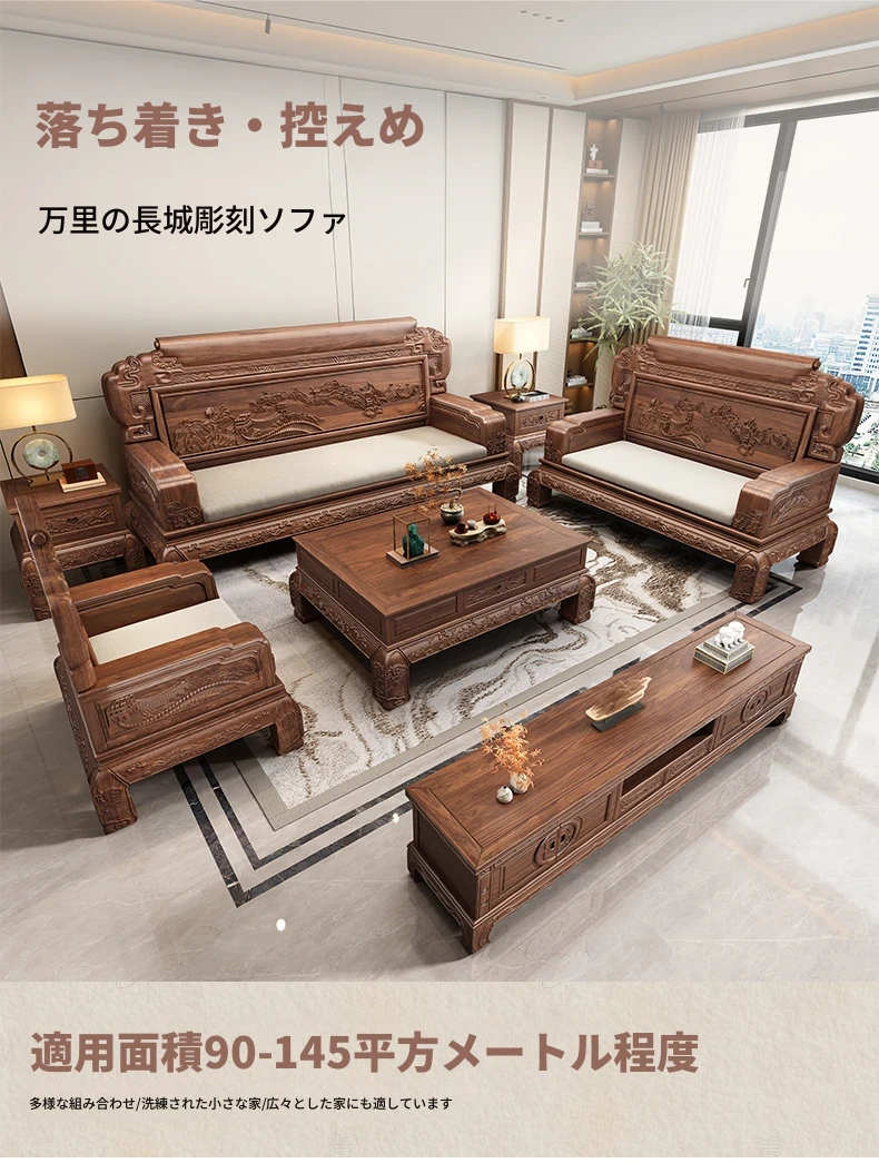 2025年新作!胡桃木全実木ソファー - 中式古典宋風美学の魅力を引き立てる万里長城彫刻家具。あなたのリビングに洗練された雰囲気をプラス!
