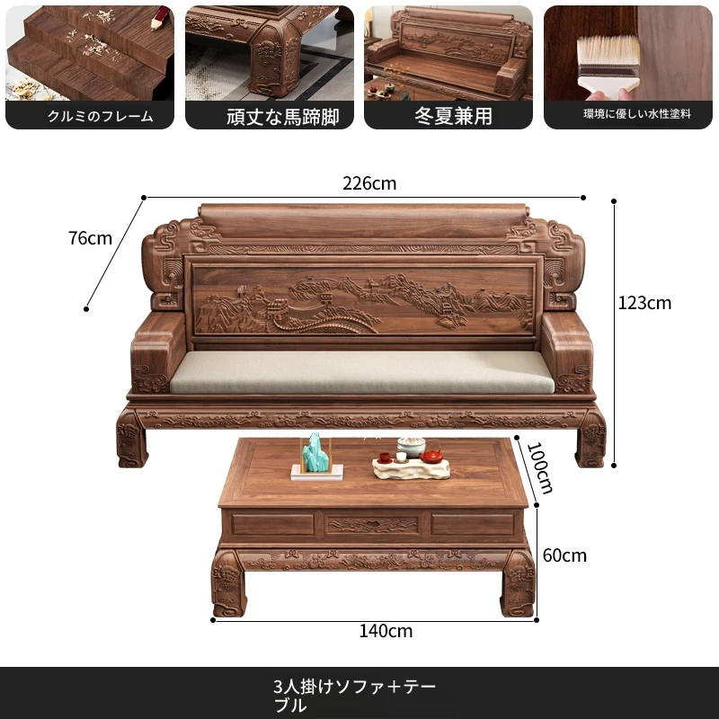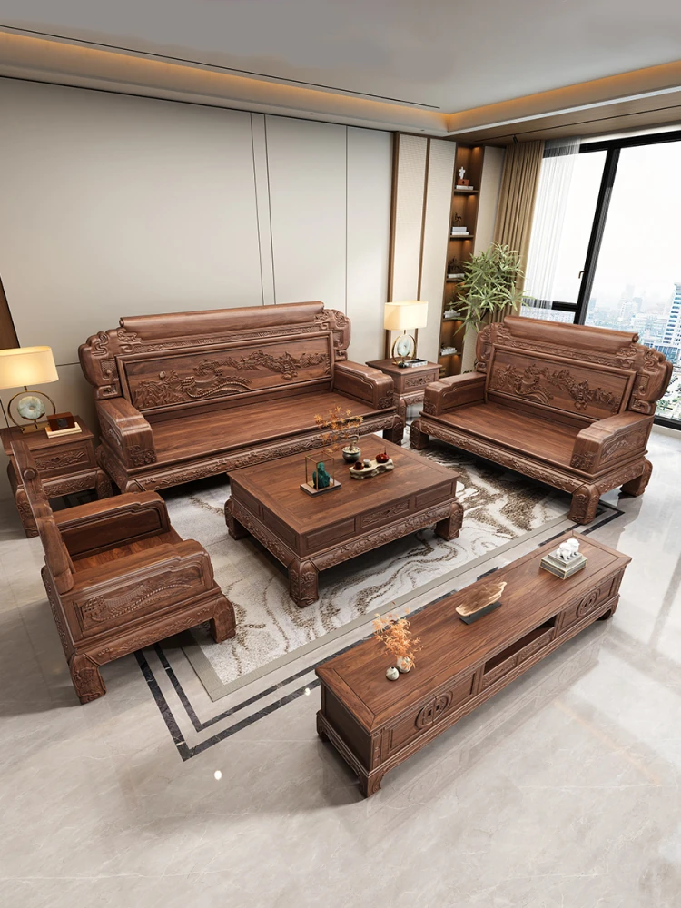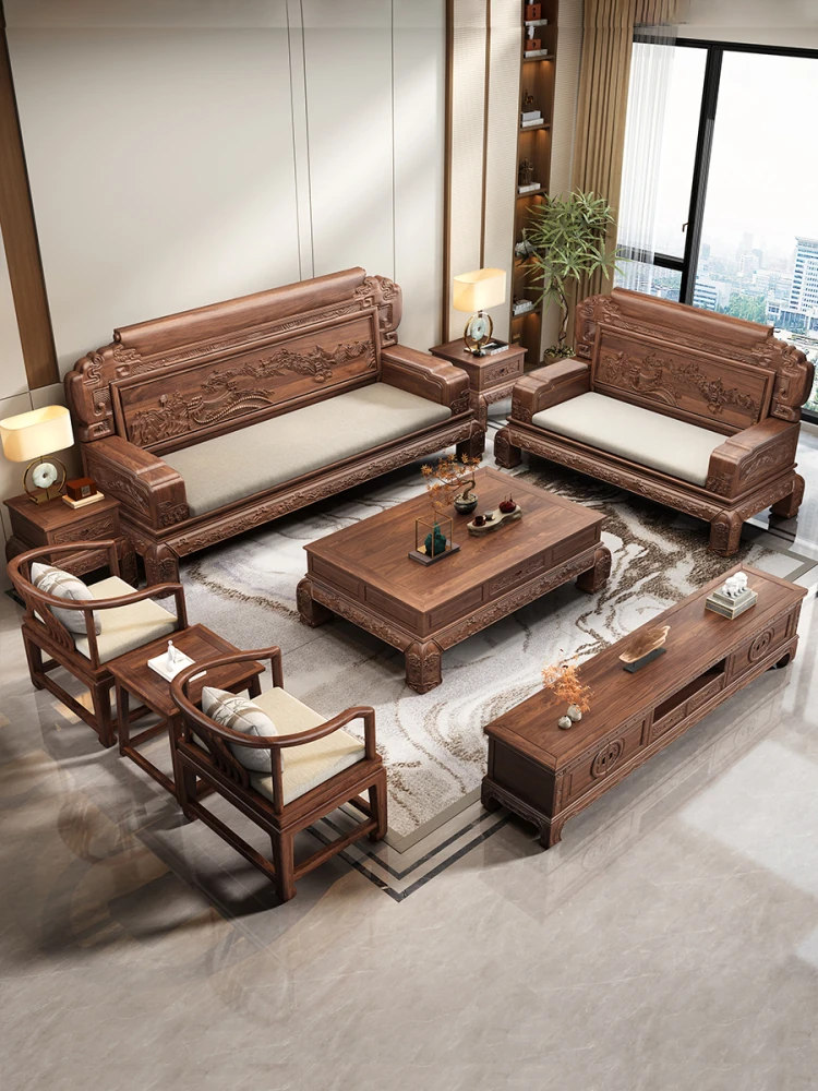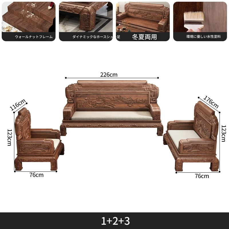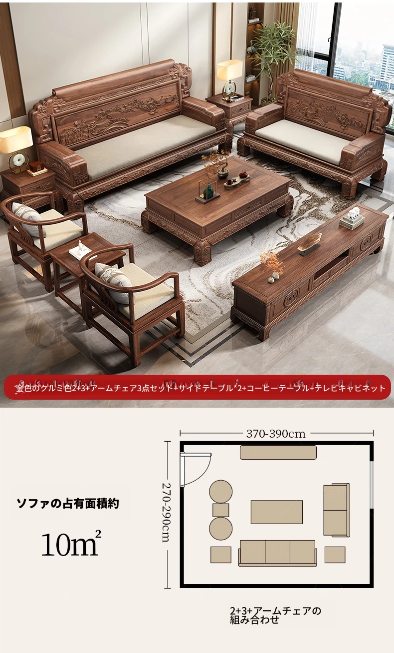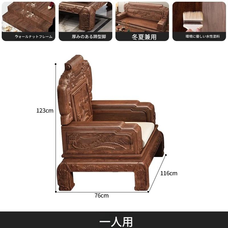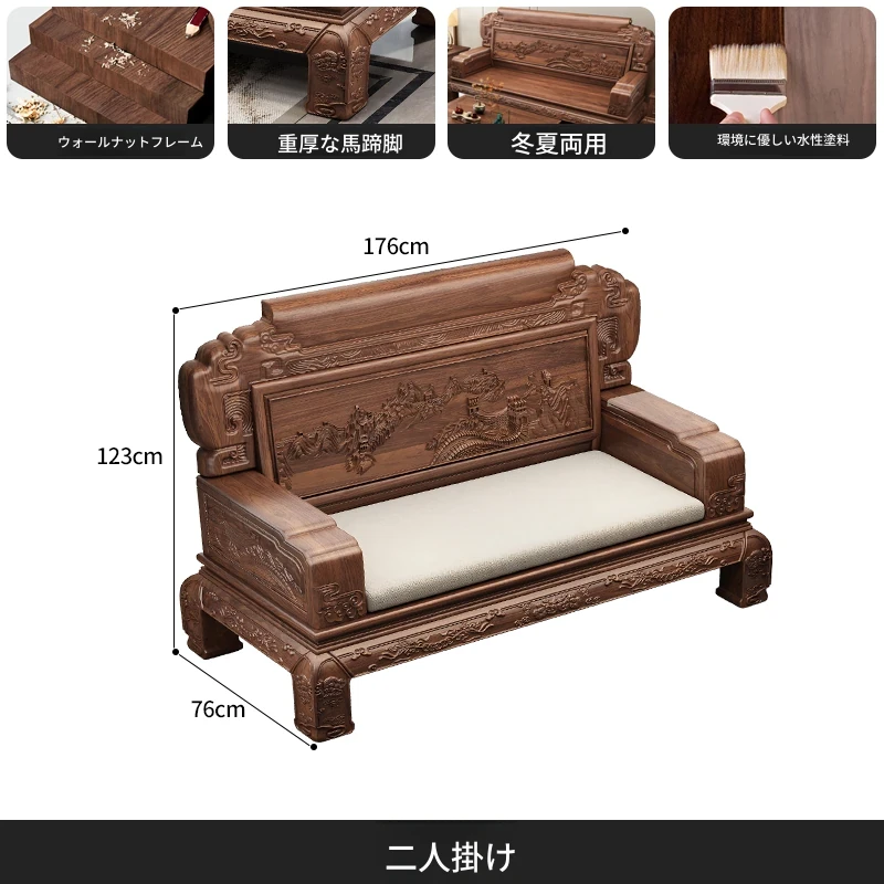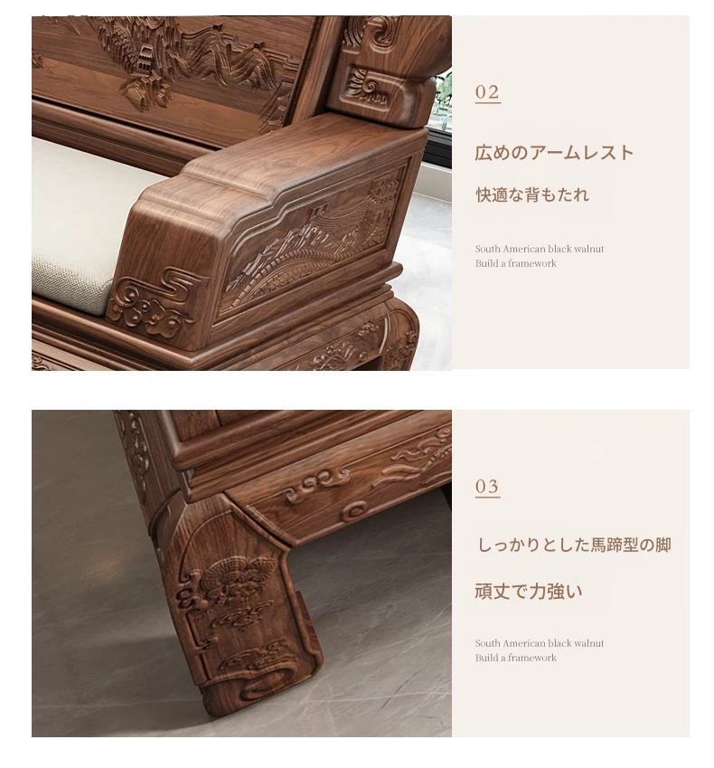 2025年新作!胡桃木全実木ソファー - 中式古典宋風美学の魅力を引き立てる万里長城彫刻家具。あなたのリビングに洗練された雰囲気をプラス!