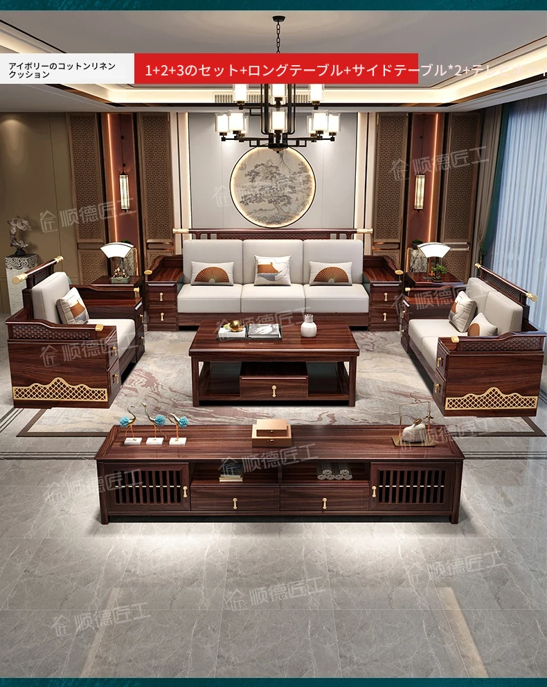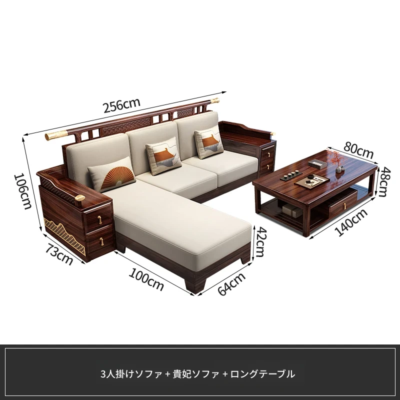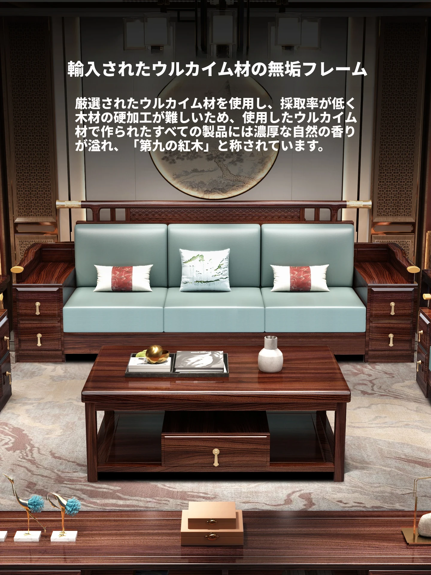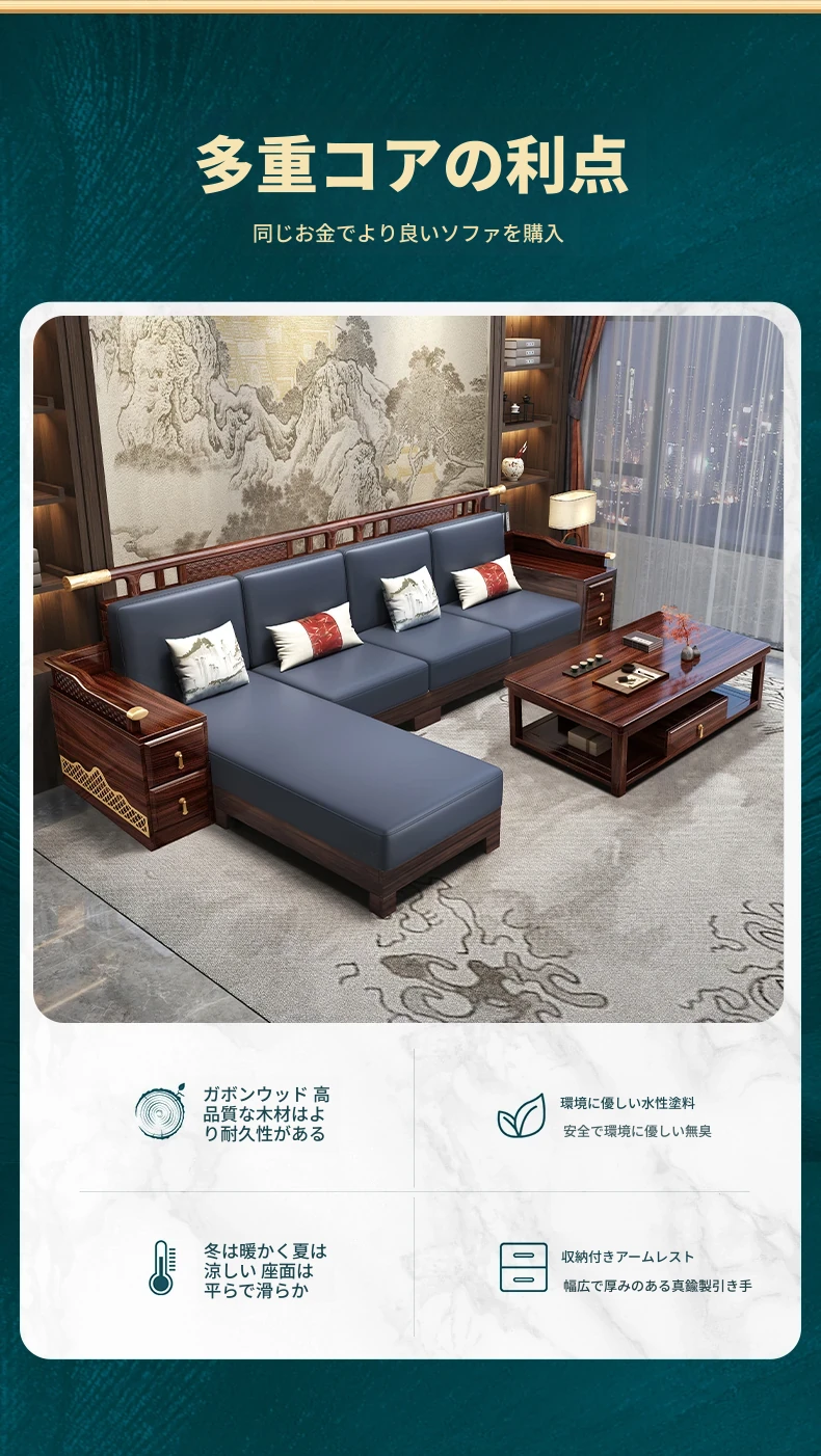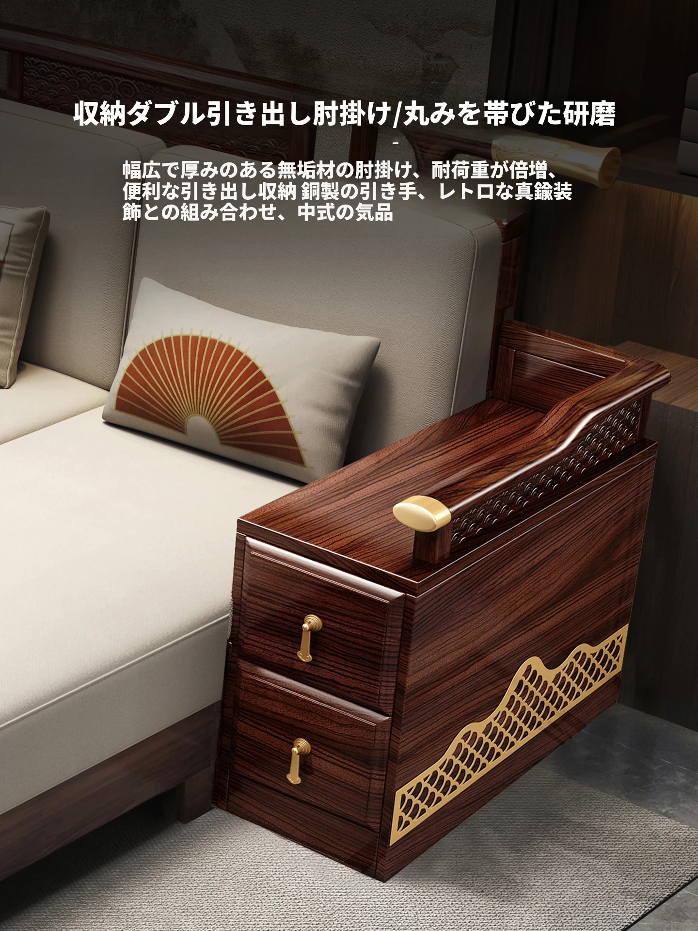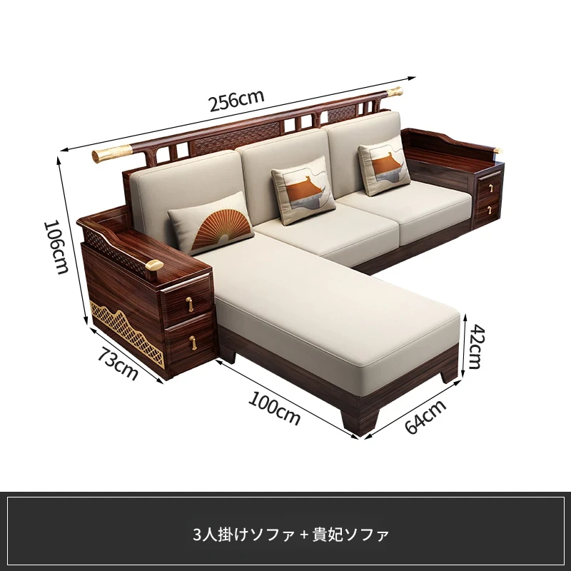 ウーキン木の無垢材ソファセット 新中式の軽奢華スタイル L字型の貴妃ソファ 大小どちらのリビングにぴったりなシンプルな木製家具で、優雅な空間を演出します。