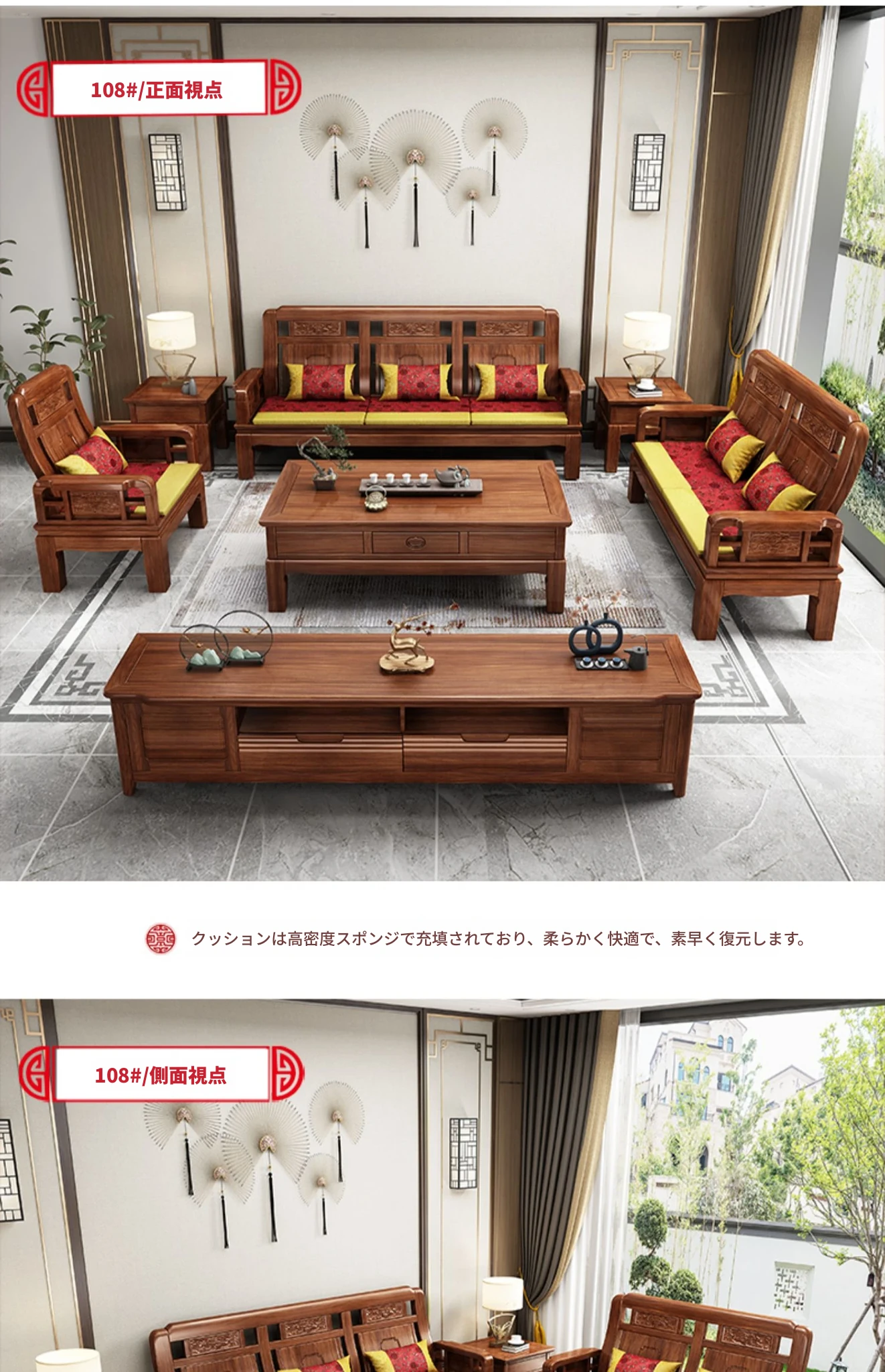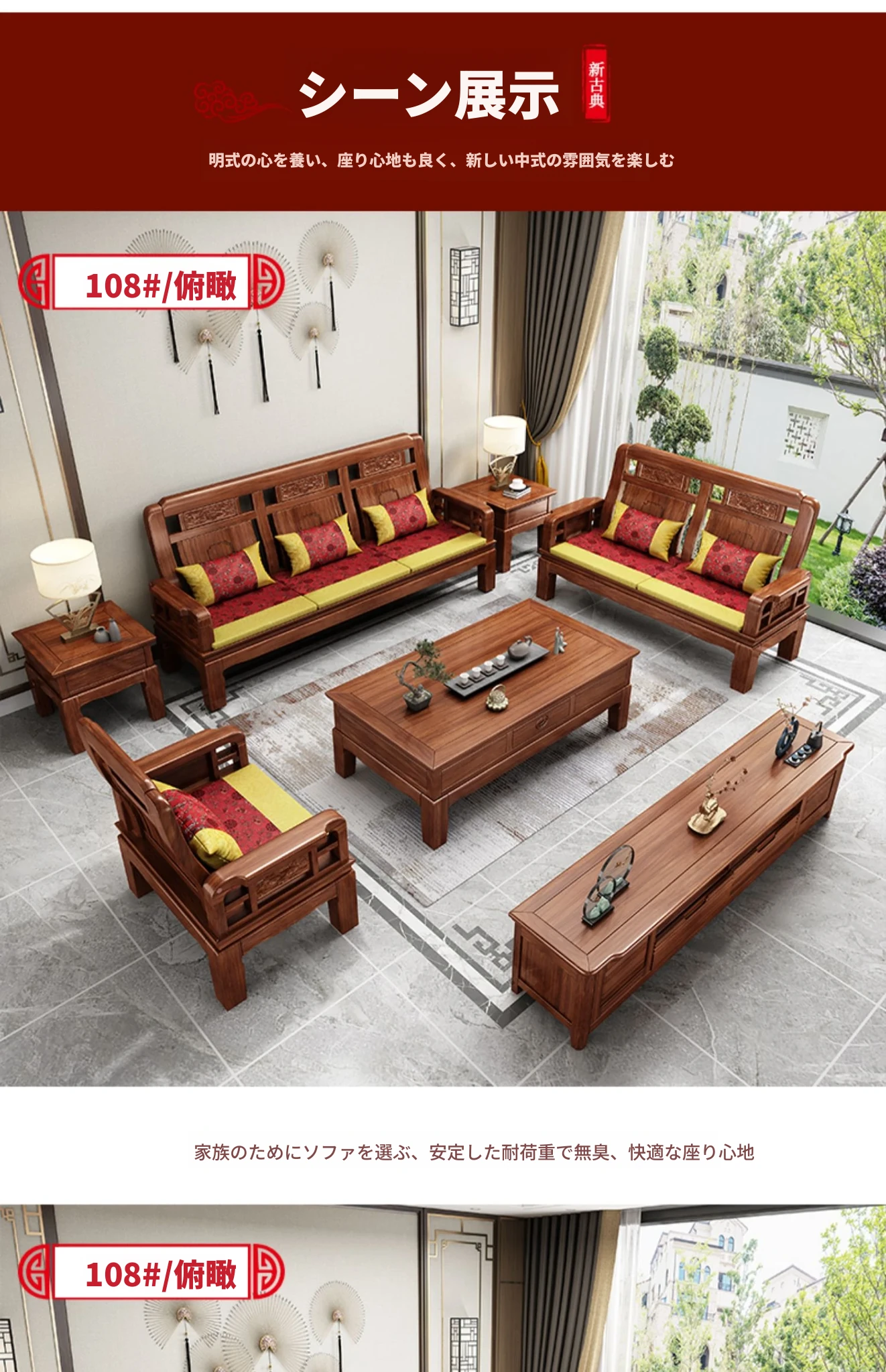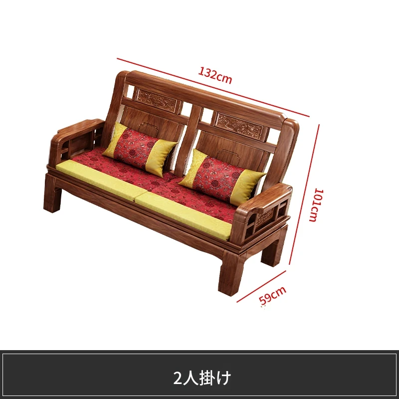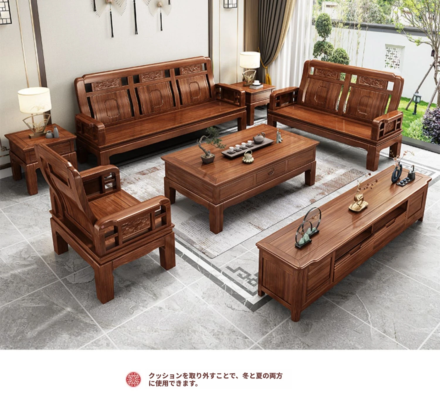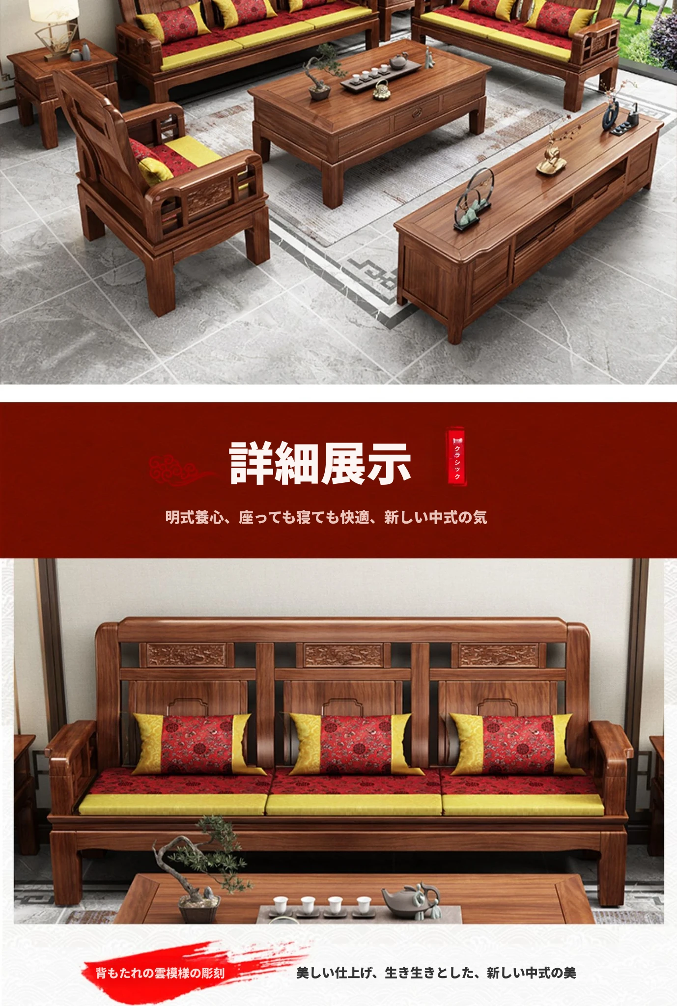 彫刻デザインの古典中式実木ソファ - 小型住宅に最適!冬夏両用、明清風のアンティークスタイルで、リビングルームを華やかに彩る123仿紅木家具。快適さと美しさを兼ね備えた一品!