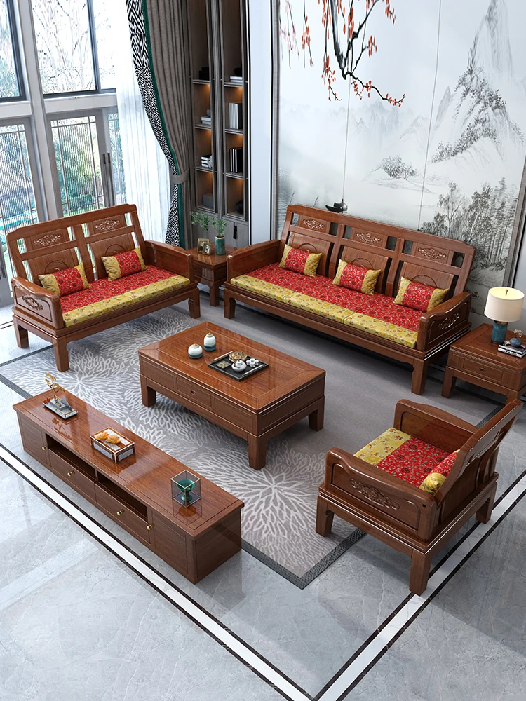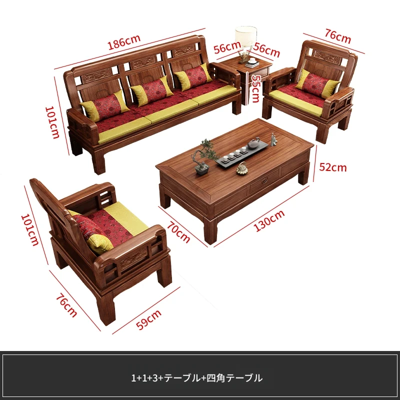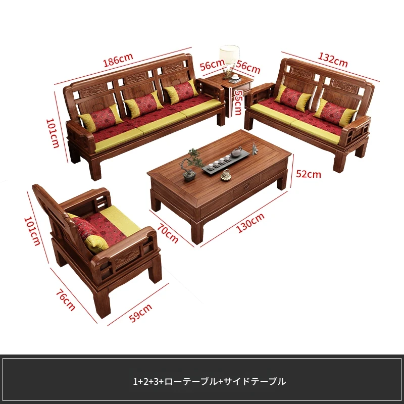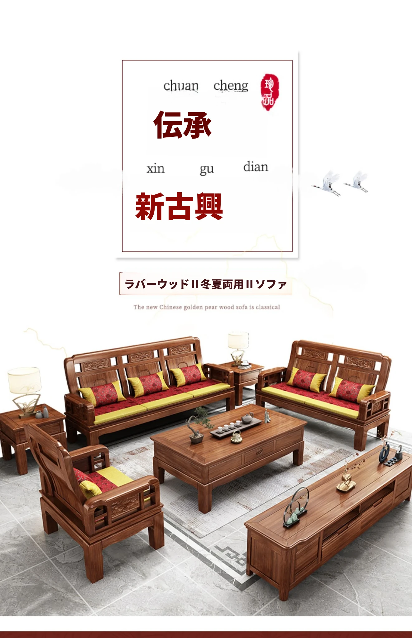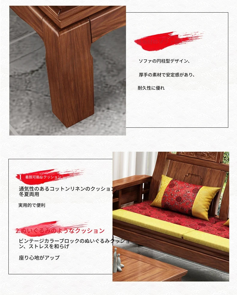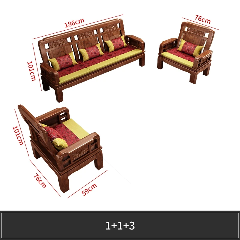 彫刻デザインの古典中式実木ソファ - 小型住宅に最適!冬夏両用、明清風のアンティークスタイルで、リビングルームを華やかに彩る123仿紅木家具。快適さと美しさを兼ね備えた一品!