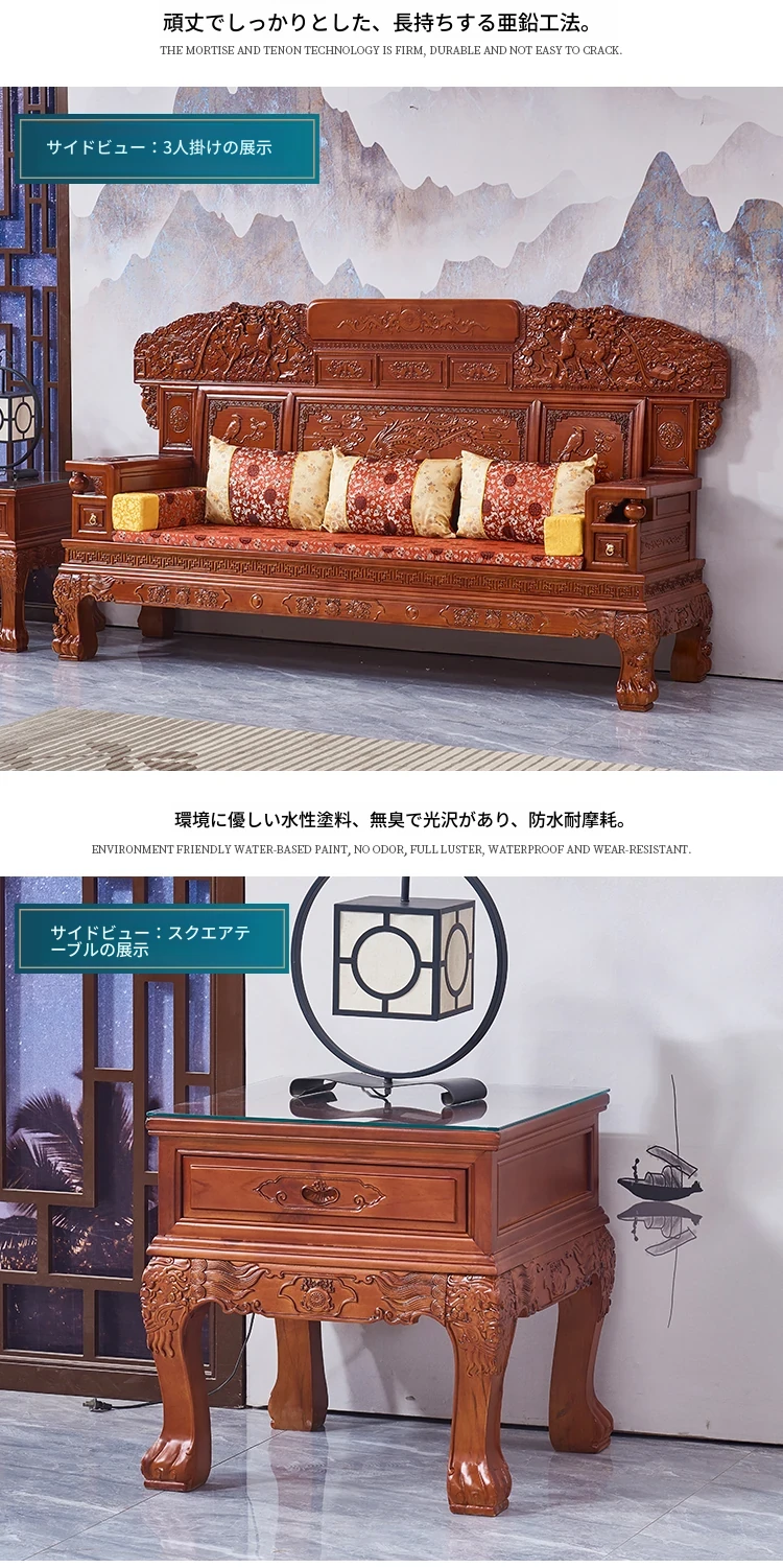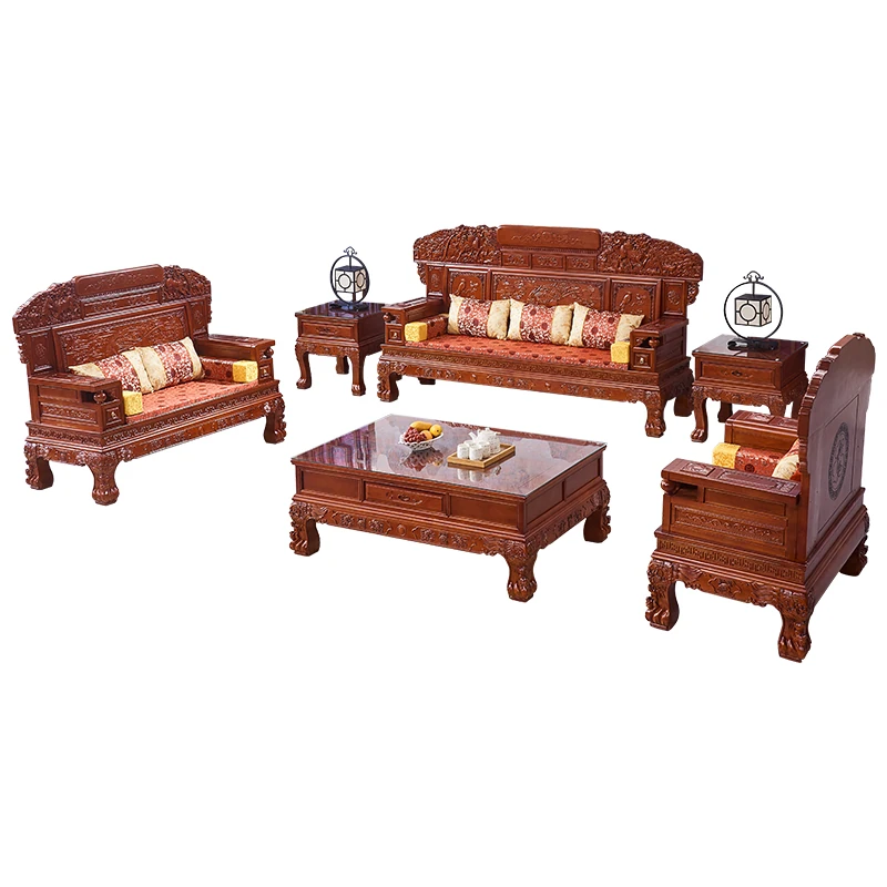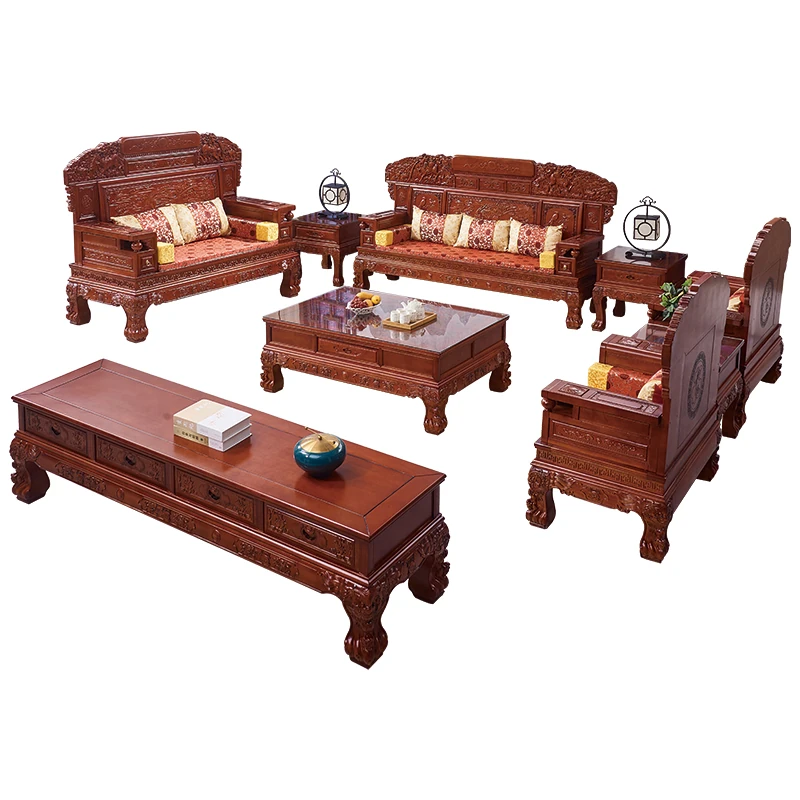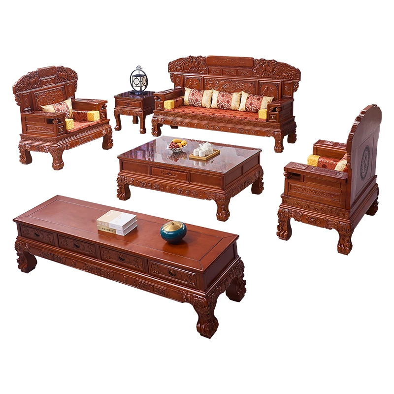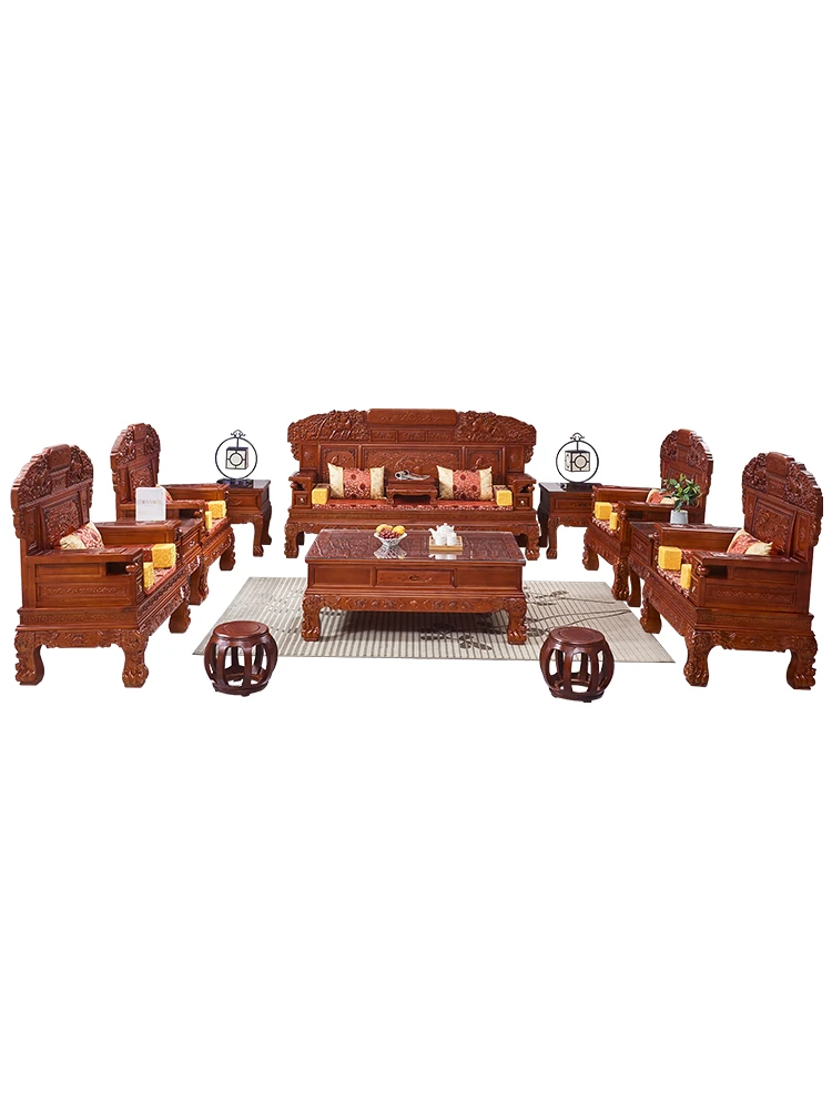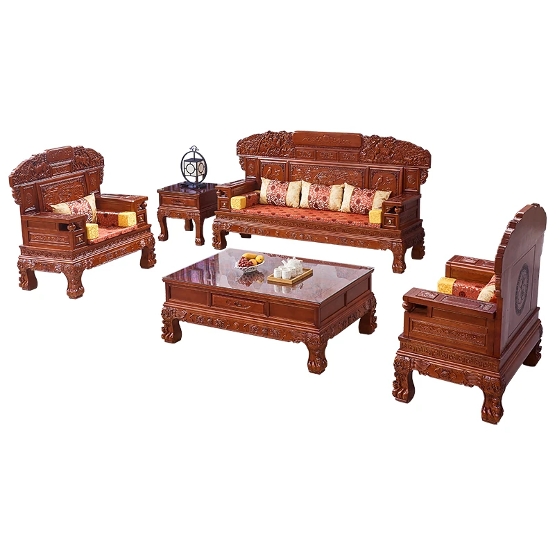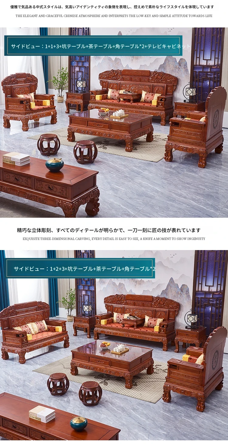 明清風格の本格的な無垢材ソファセット - 高級紅木製、彫刻が美しい古典的なデザインで、リビングルームにぴったりの全家具揃い!エレガントな雰囲気を演出し、上質なひとときをお楽しみください。