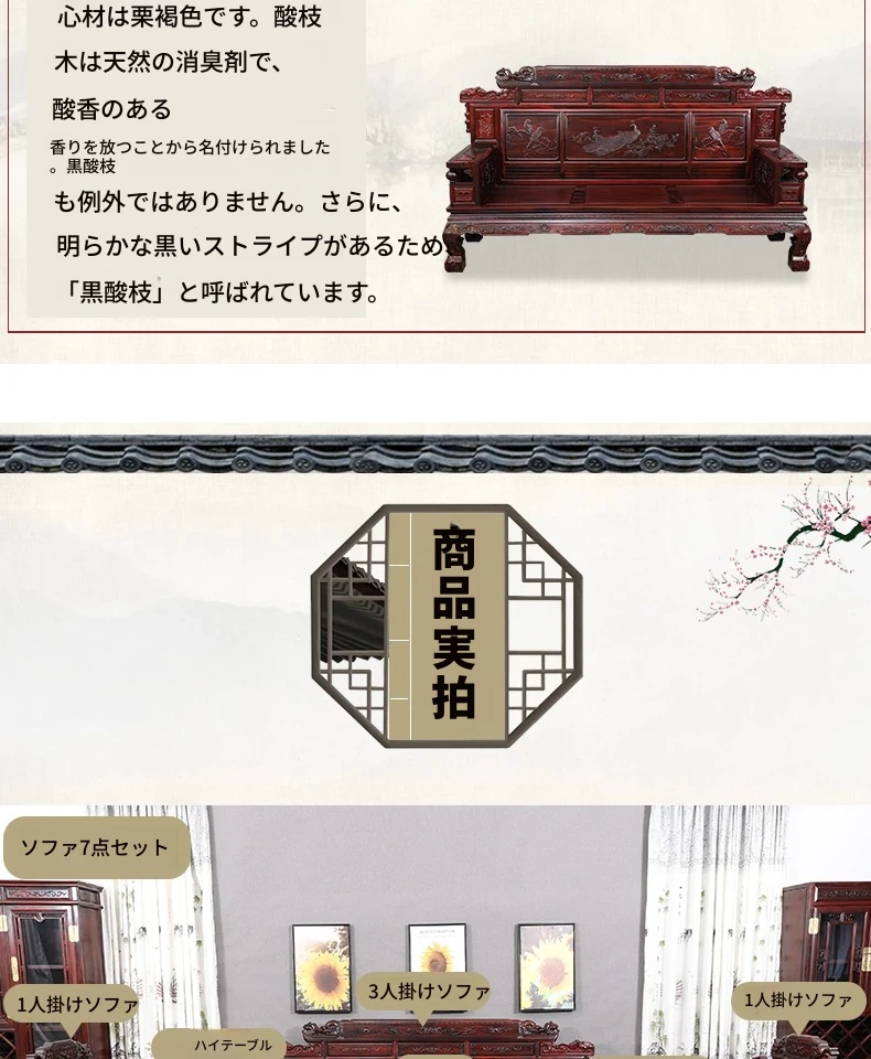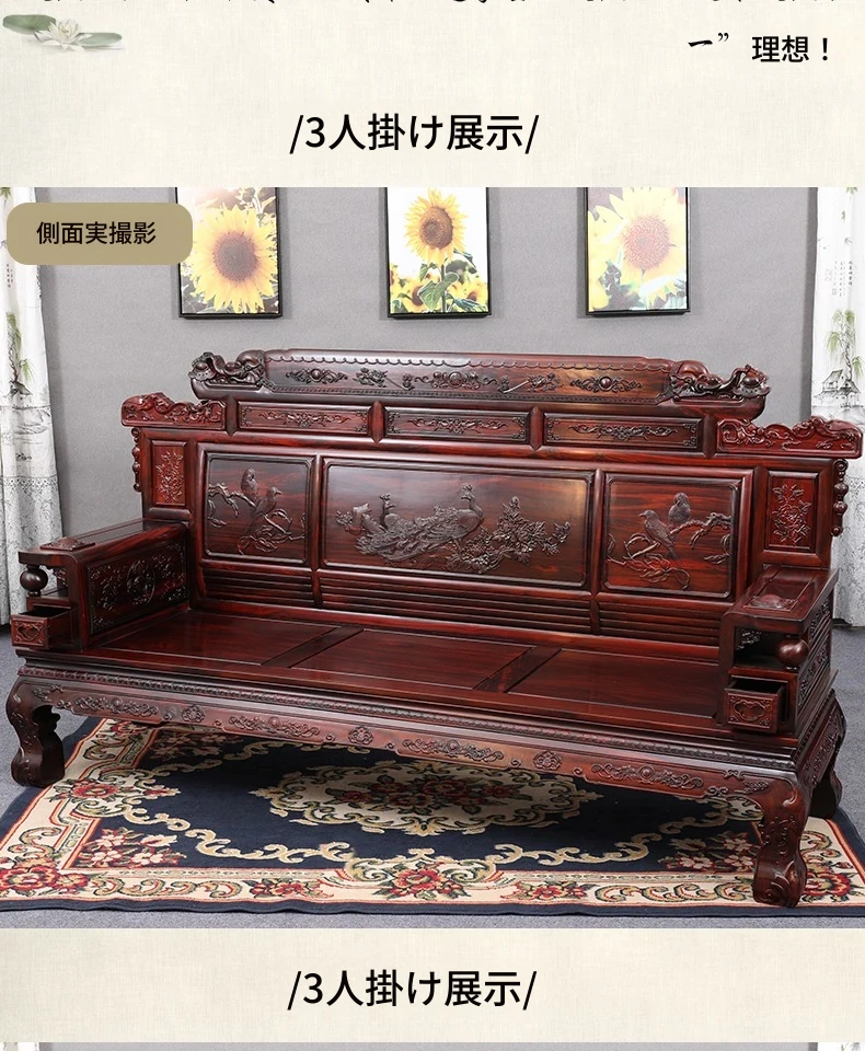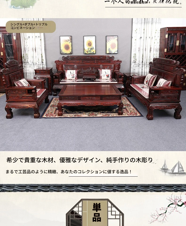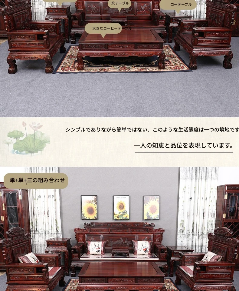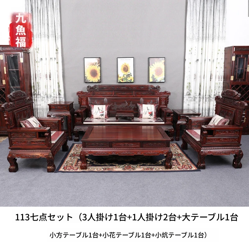 国産レッドウッド家具 フルセット リビングルーム用 インドネシア産ブラックローズウッドソファ 幅広のイエローパルサンダー 中華風アフリカンローズウッド使用!高級感溢れるデザインで、上質なひとときをお届けします。