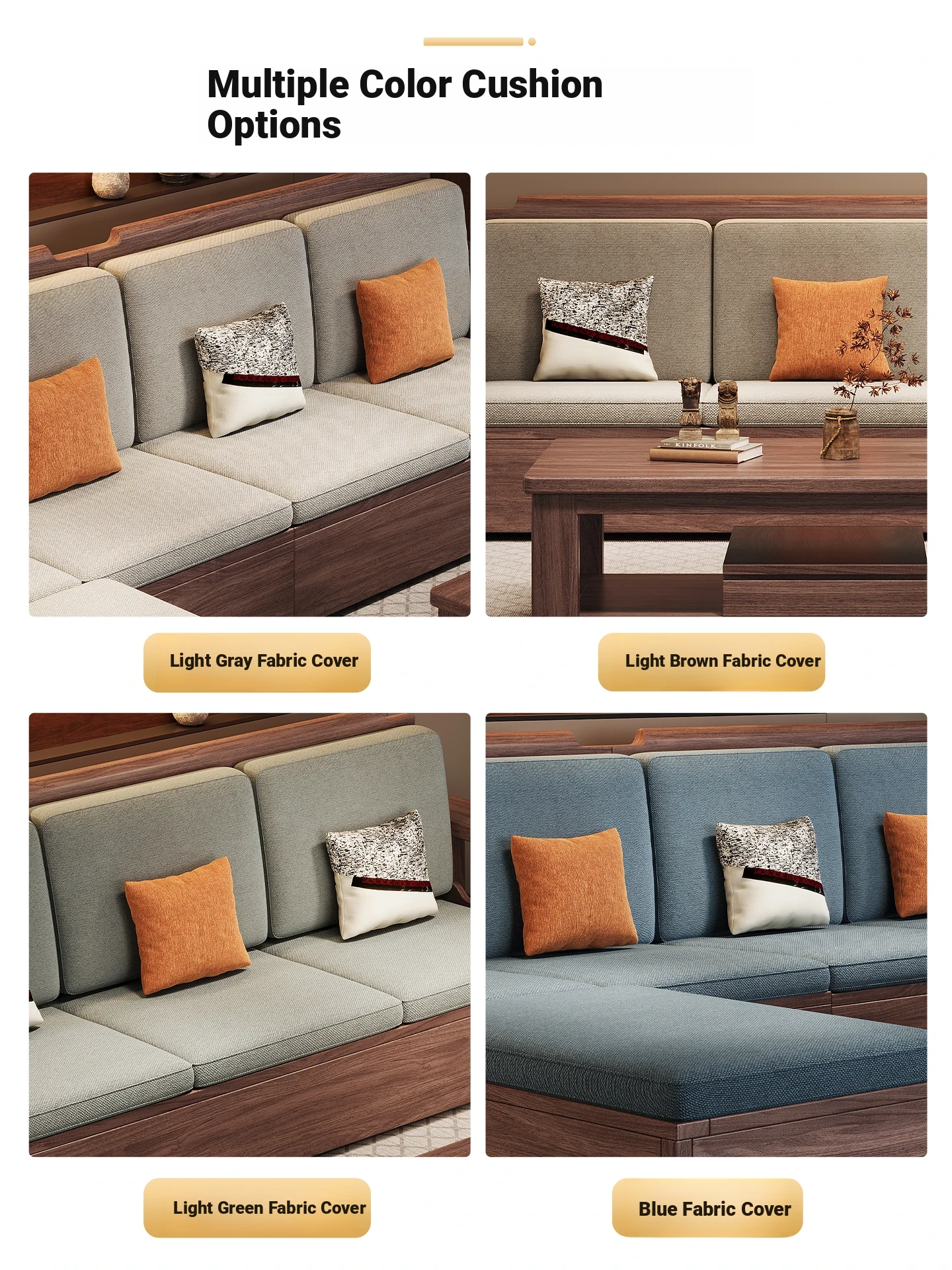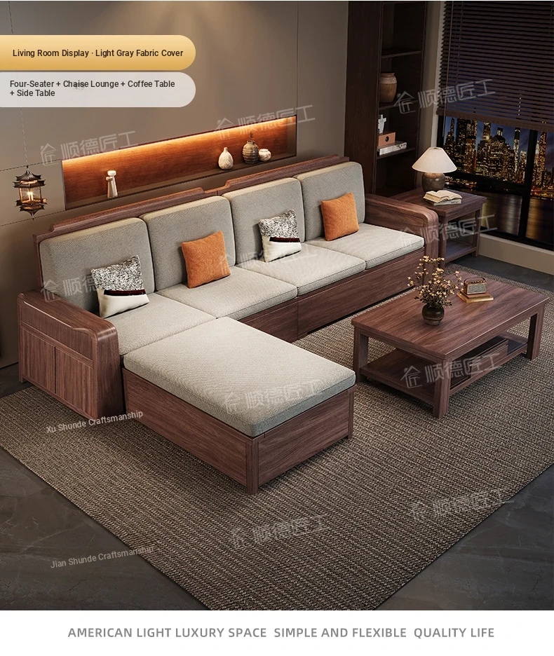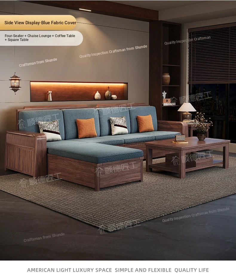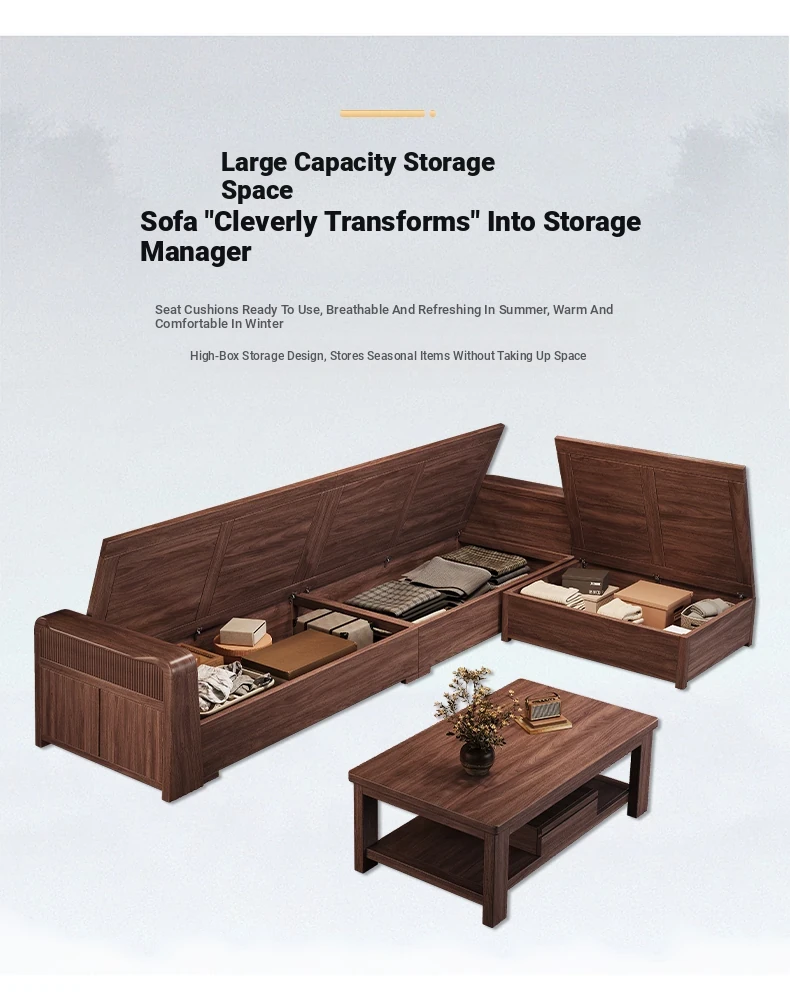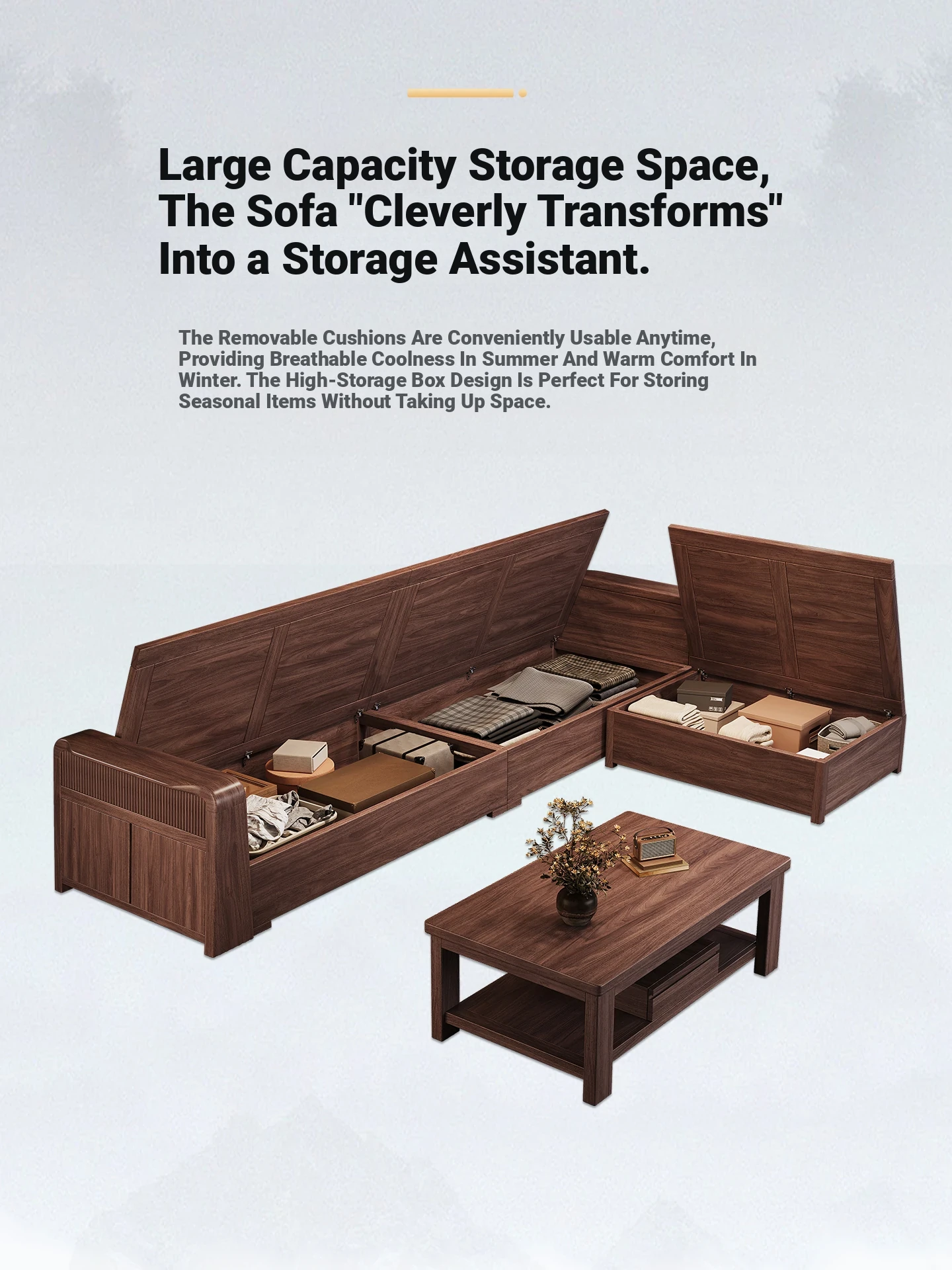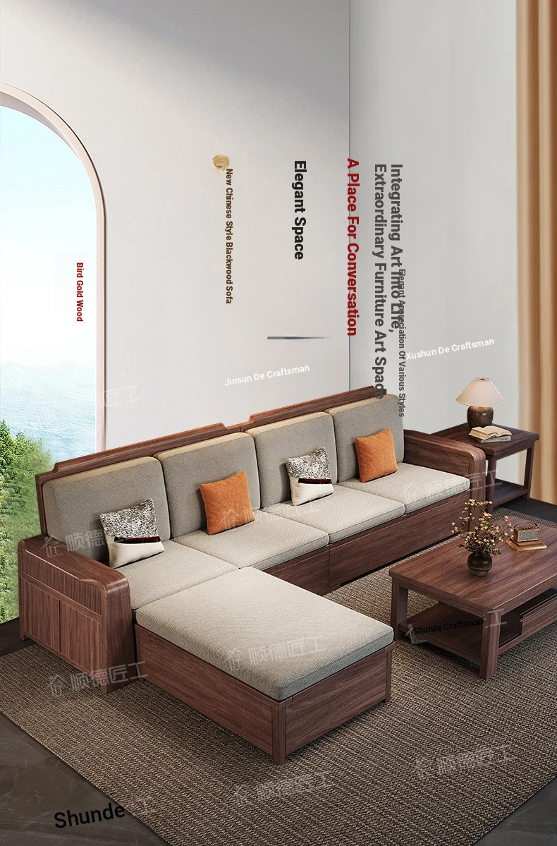 Elegant Black Walnut Solid Wood Sofa Set - New Chinese Style L-Shaped Chaise Lounge, Versatile for All Seasons, Perfect for Home Living Room with Storage Solutions