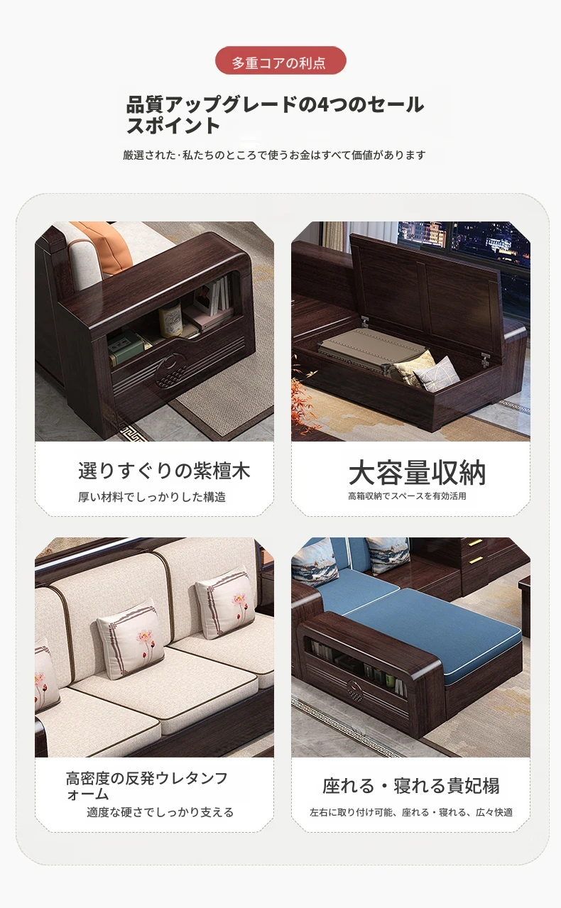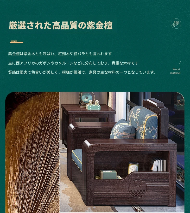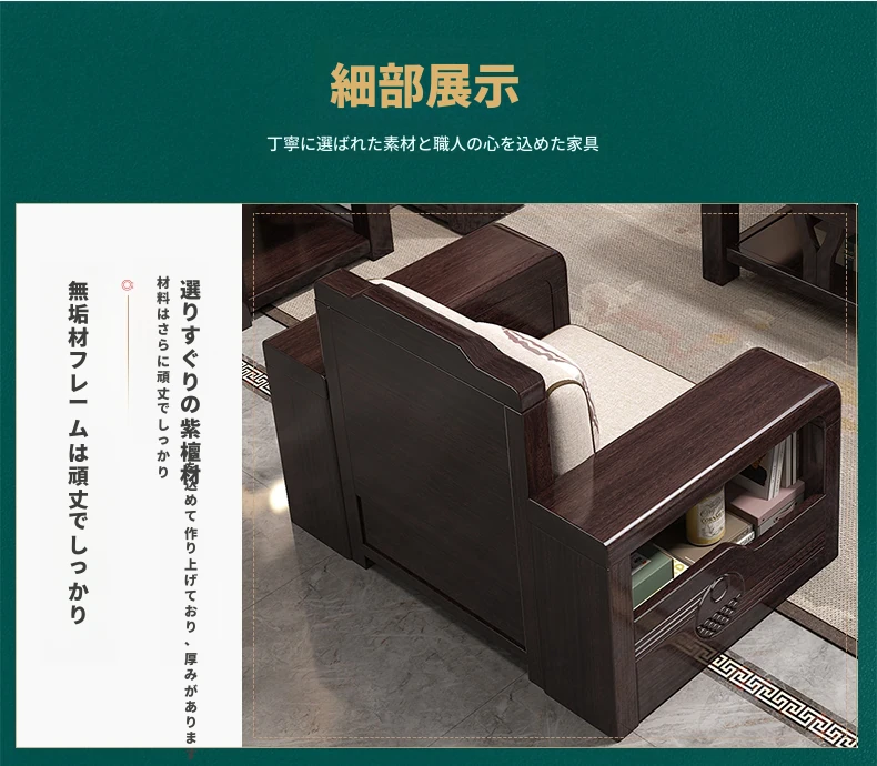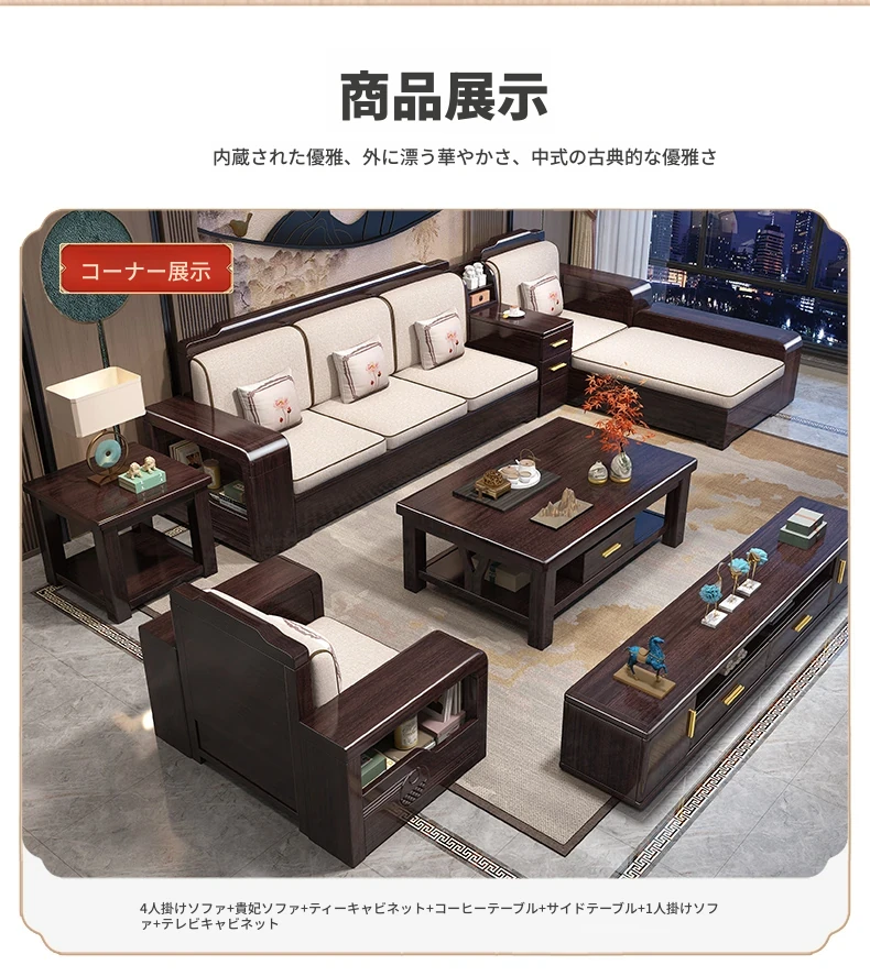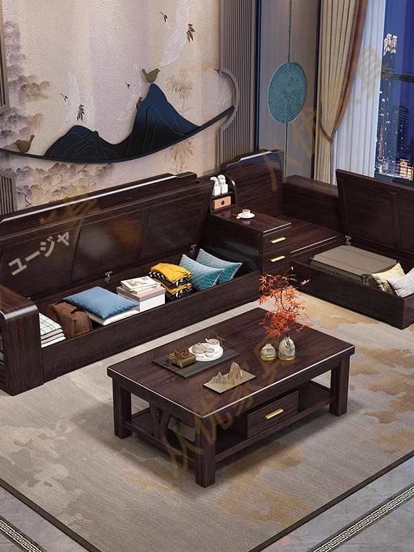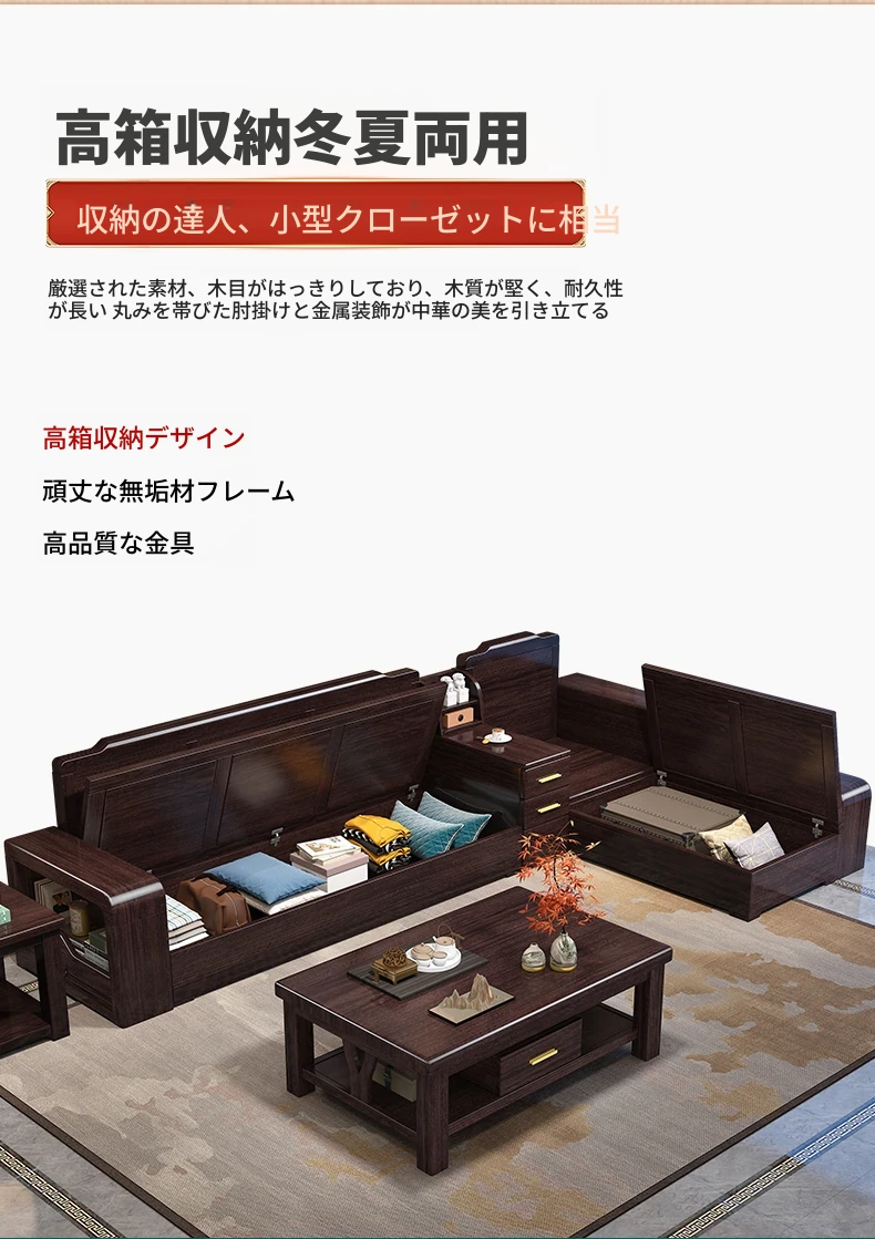 新中式紫金檀の無垢材使用!シンプルでモダンなデザインの収納付きリビングソファ。大小の部屋に最適なコーナー木製家具で、エレガントな空間を演出します!