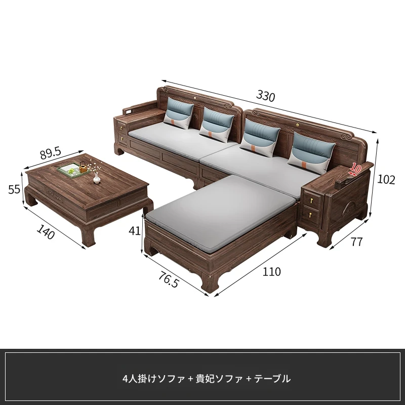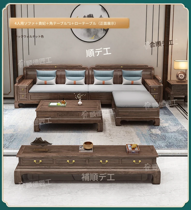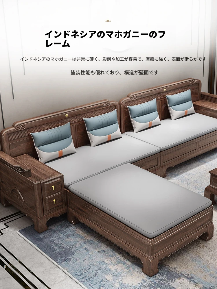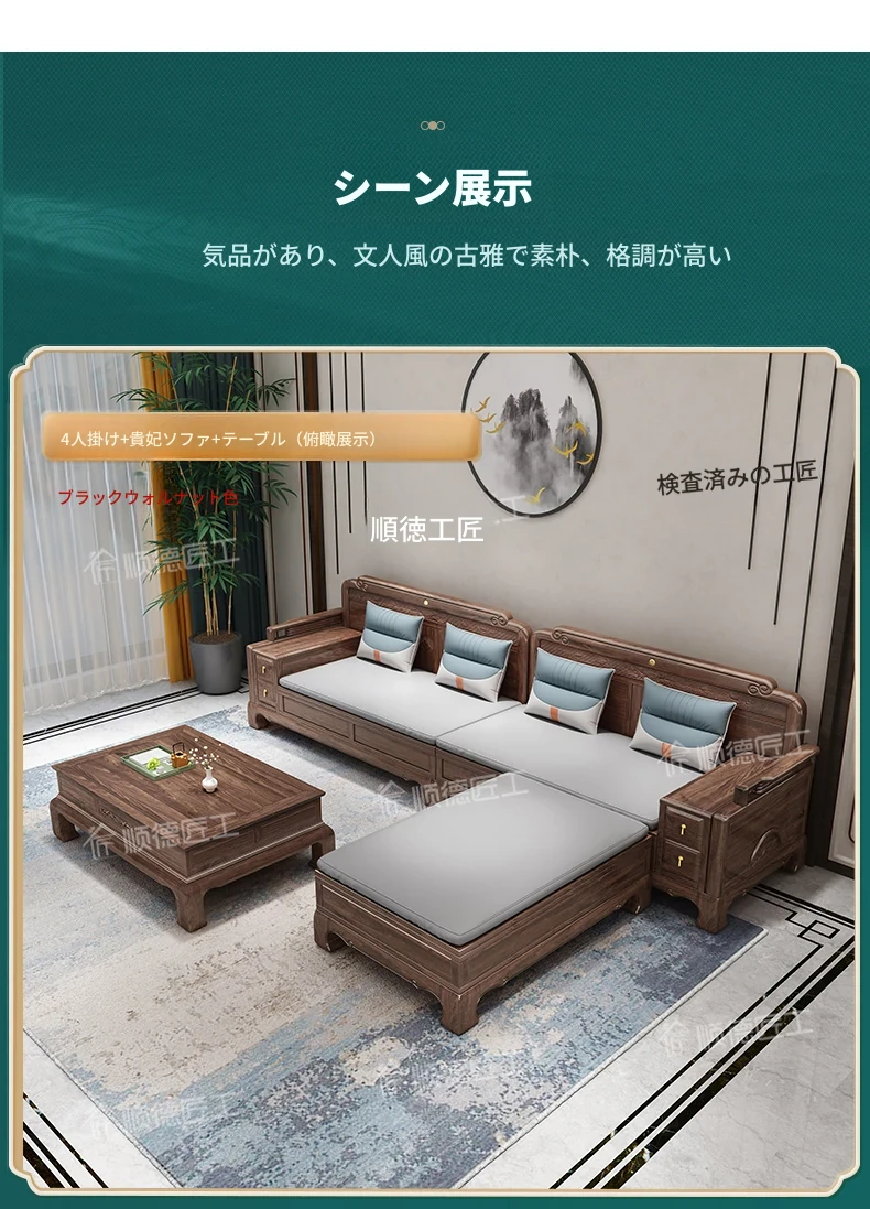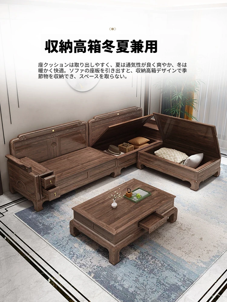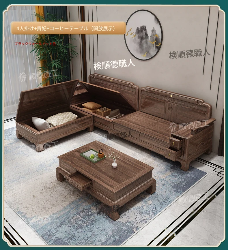 新中式全実木製ソファー ジンファー梨の木彫刻 冬夏兼用コーナー貴妃ソファー 収納付き紅木リビング家具で、優雅な空間を演出!おしゃれで機能的なデザインが魅力。
