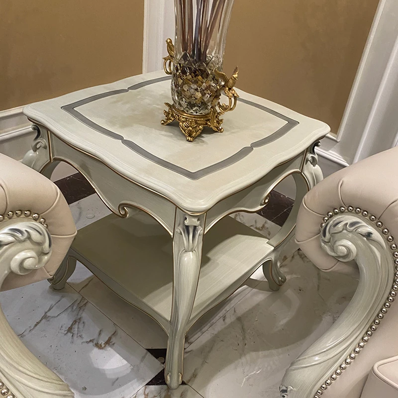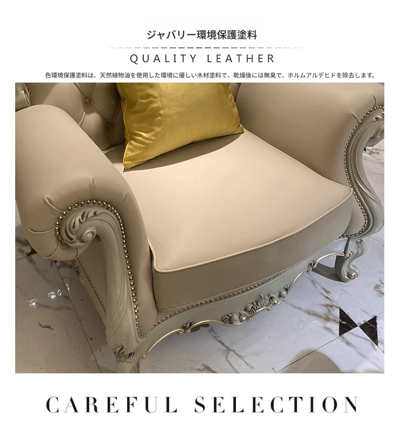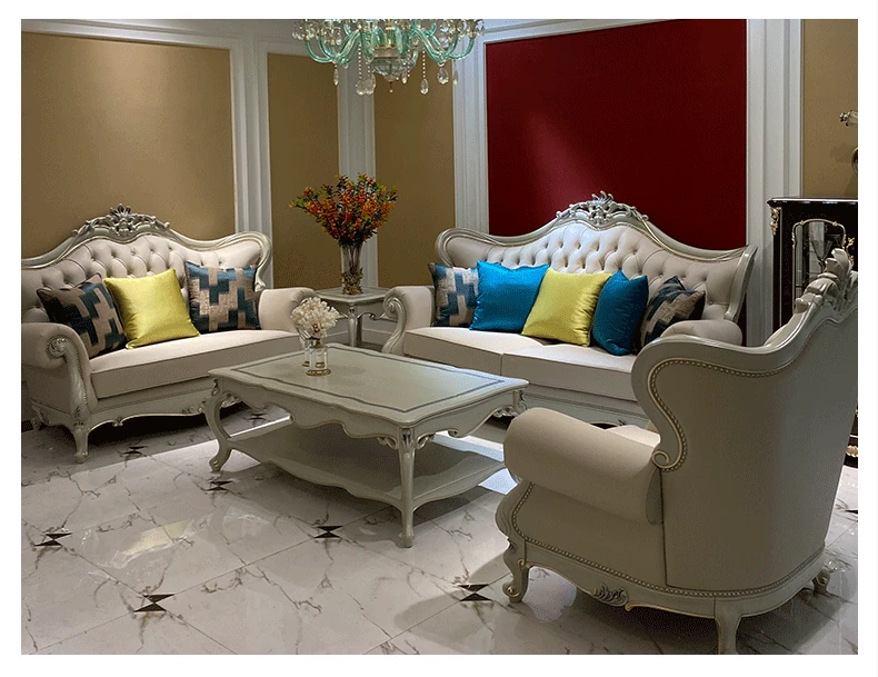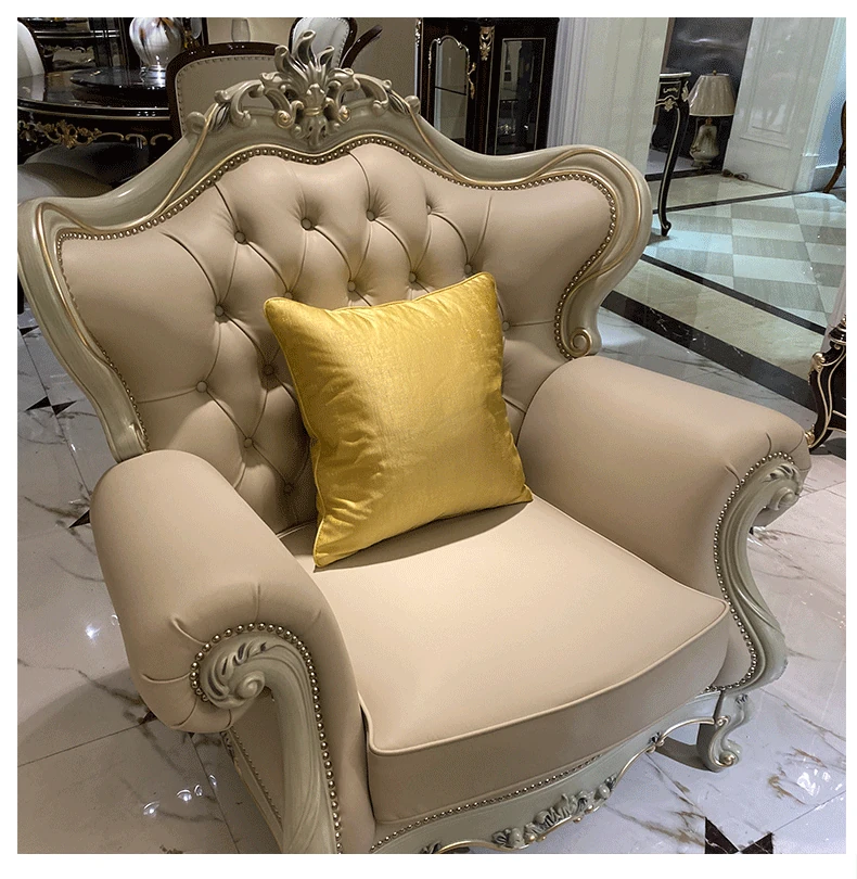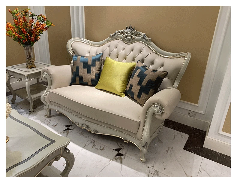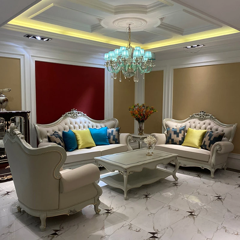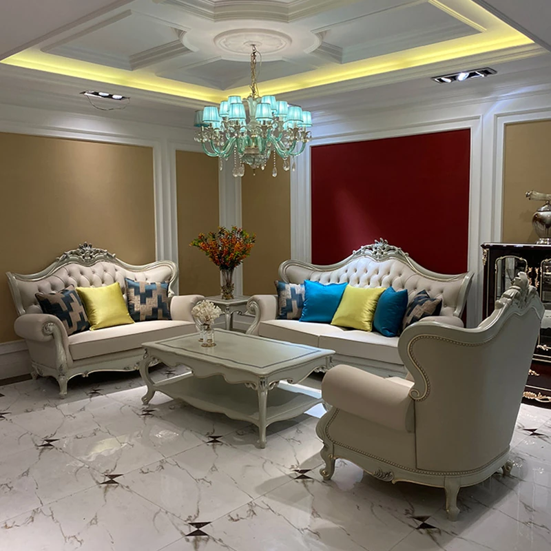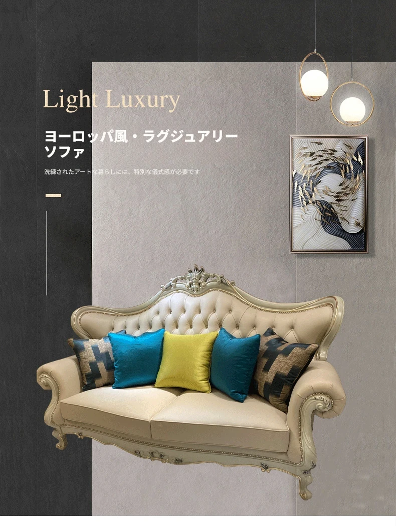 フランス製本革&無垢材の夢のようなブルーソファー!欧風デザインの小型高級ヴィラ向けリビングルームセット。洗練されたスタイルで、あなたの空間を華やかに彩ります。