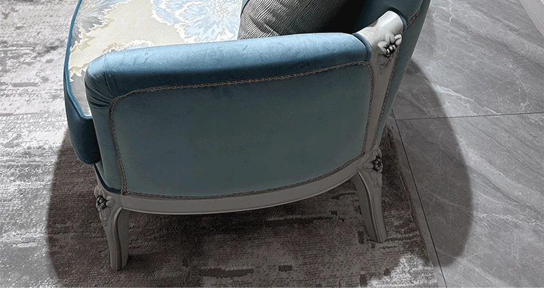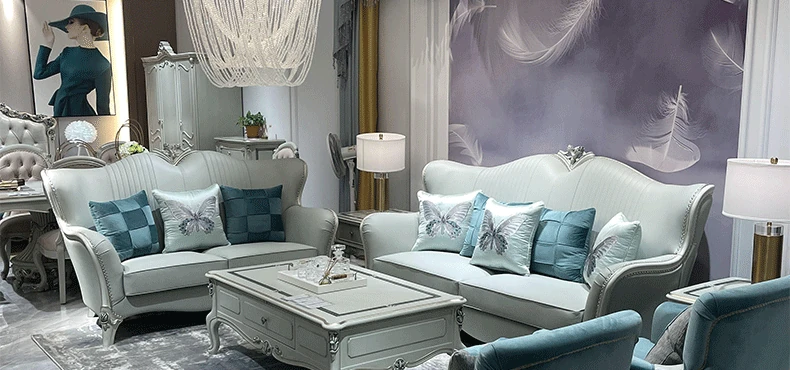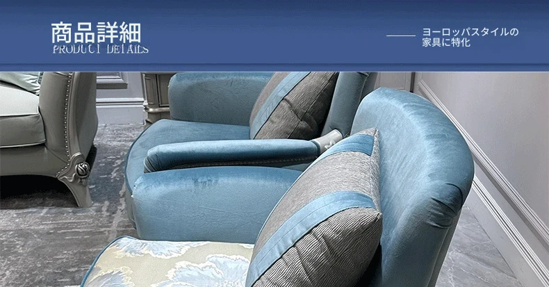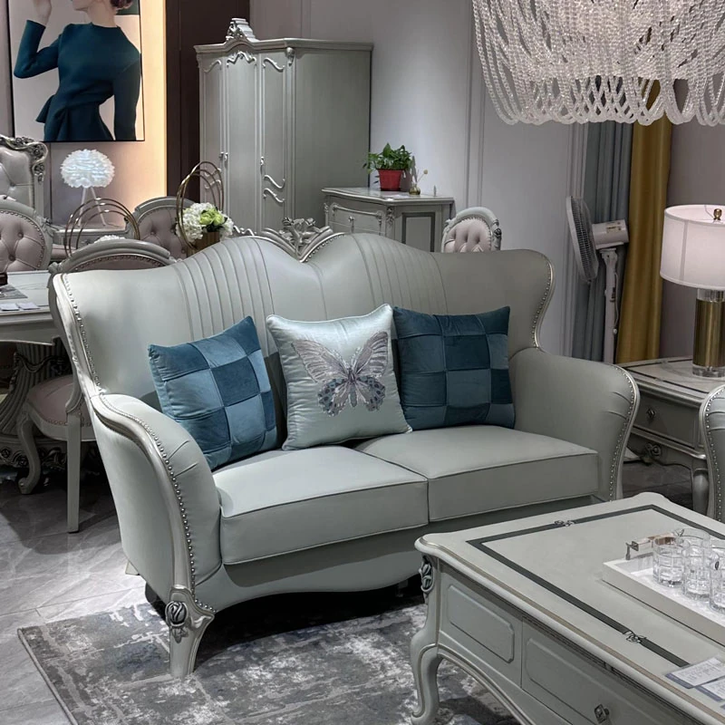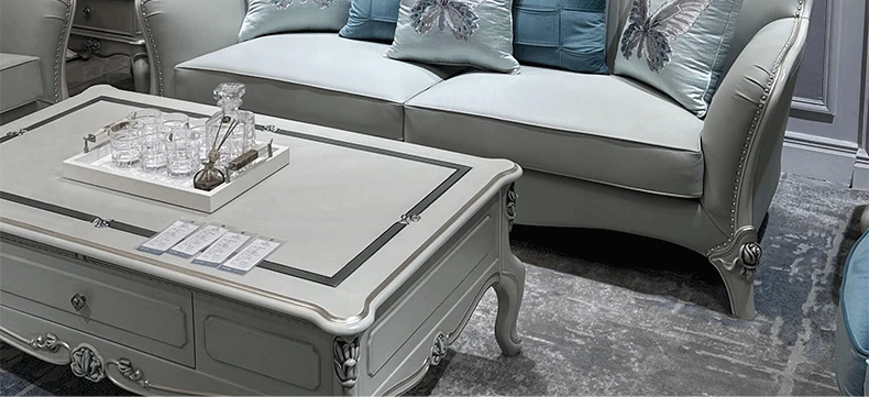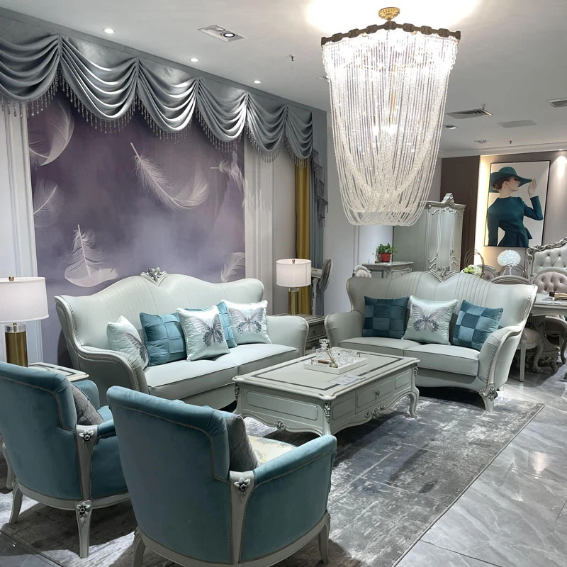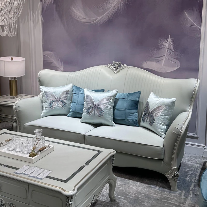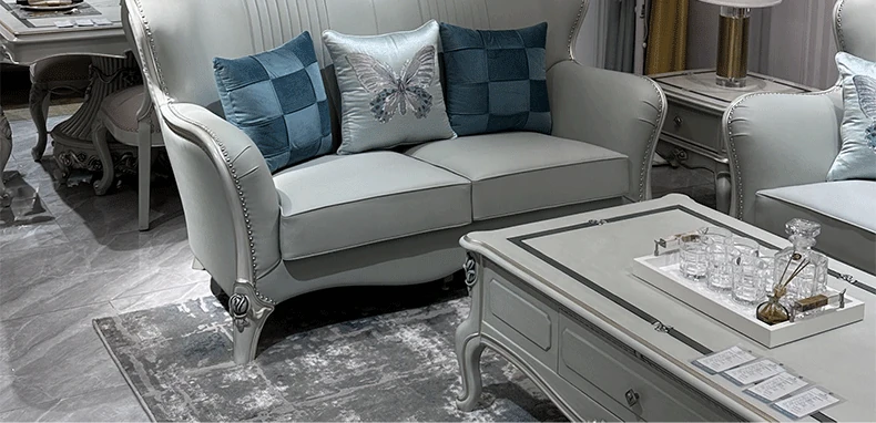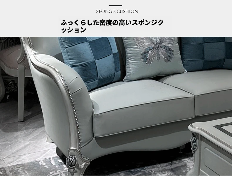 ティファニーブルーのフランス製本革&無垢材123ソファセット - ヴィラのリビングにぴったりな豪華な欧風家具!中小型住宅にも最適なスタイリッシュなデザインで、快適な空間を演出します。