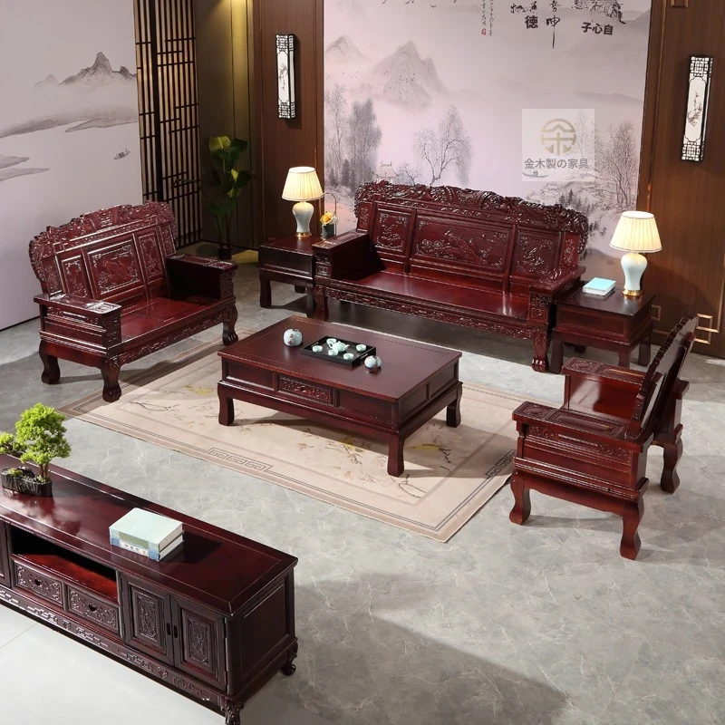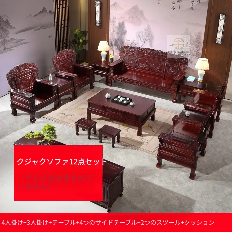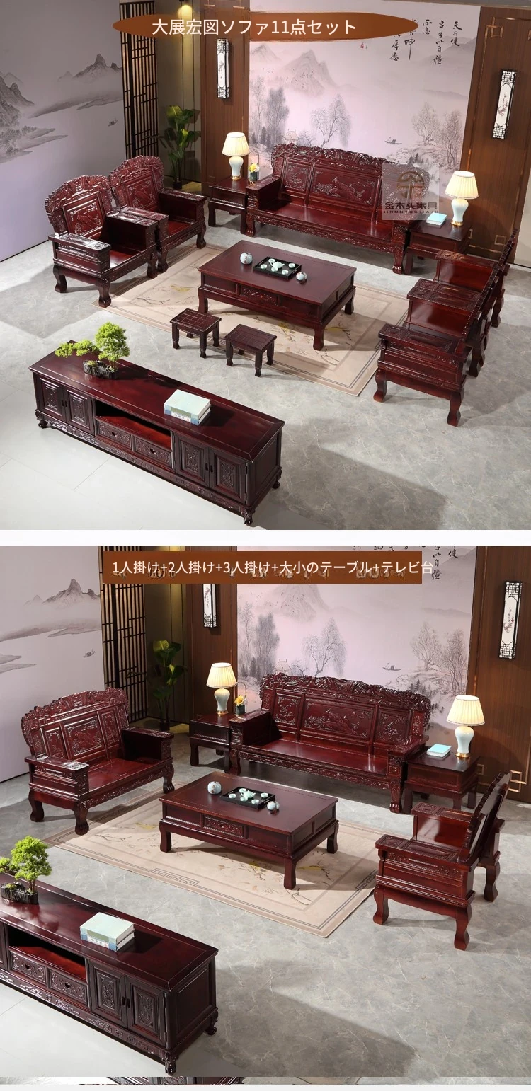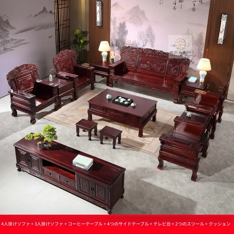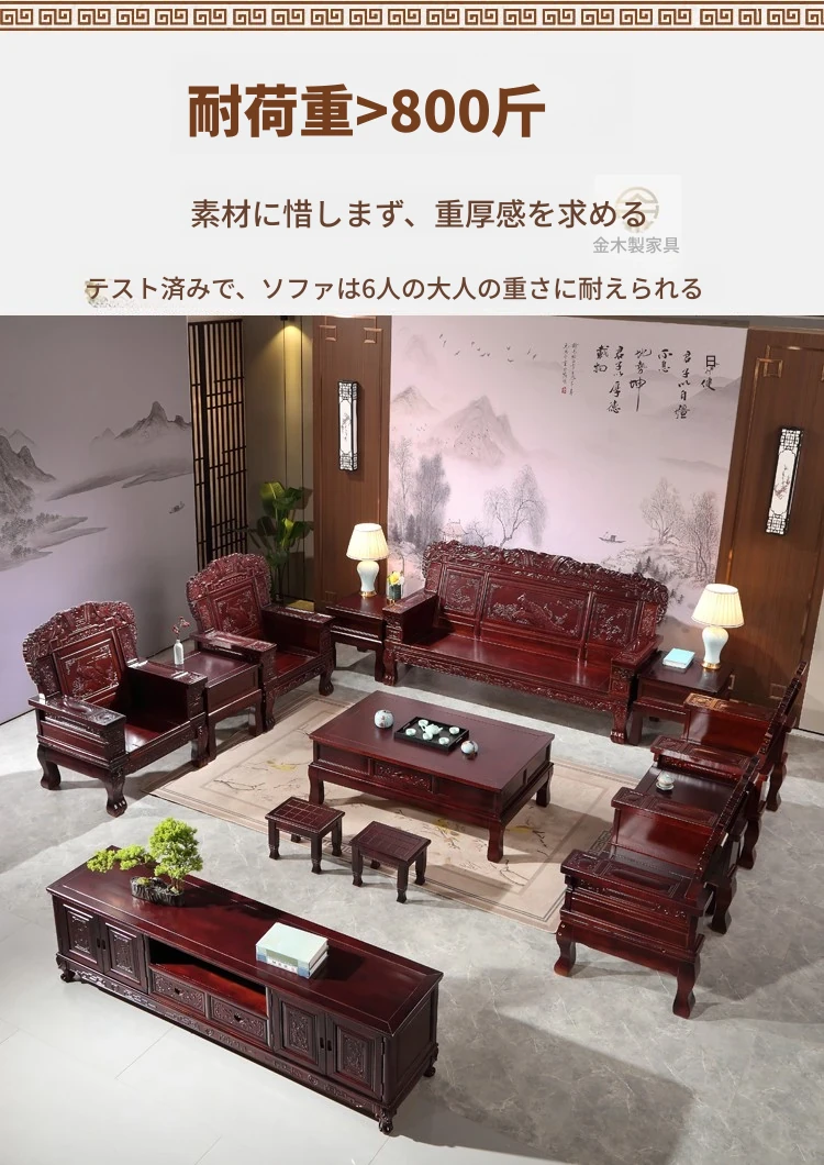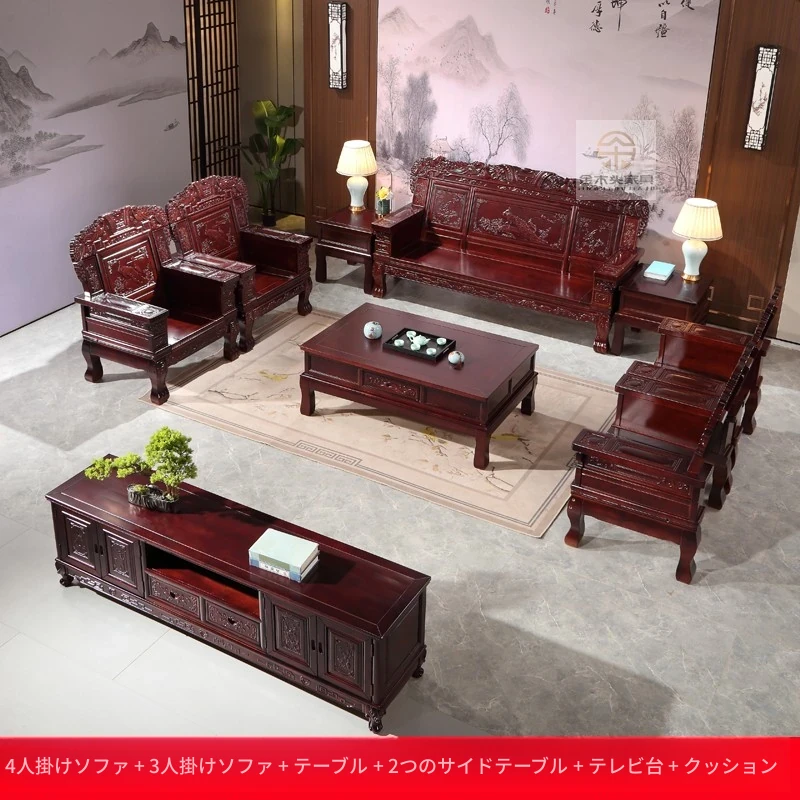 全実木製ソファ・テーブル・テレビキャビネットのフルセット!豪華な花梨風古典的デザインで、田舎の別荘にぴったりの彫刻入りソファ。あなたのリビングを優雅に演出します!