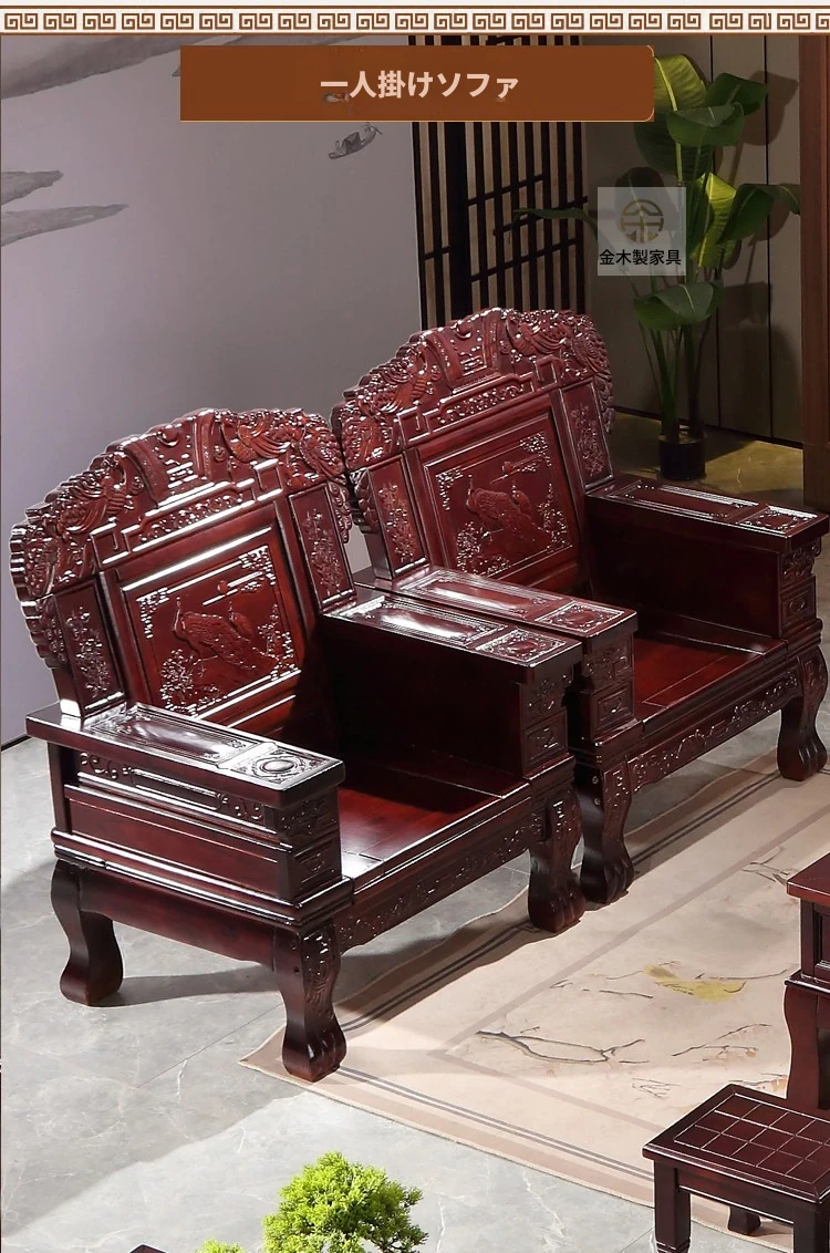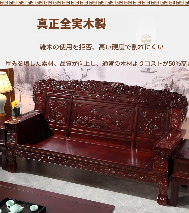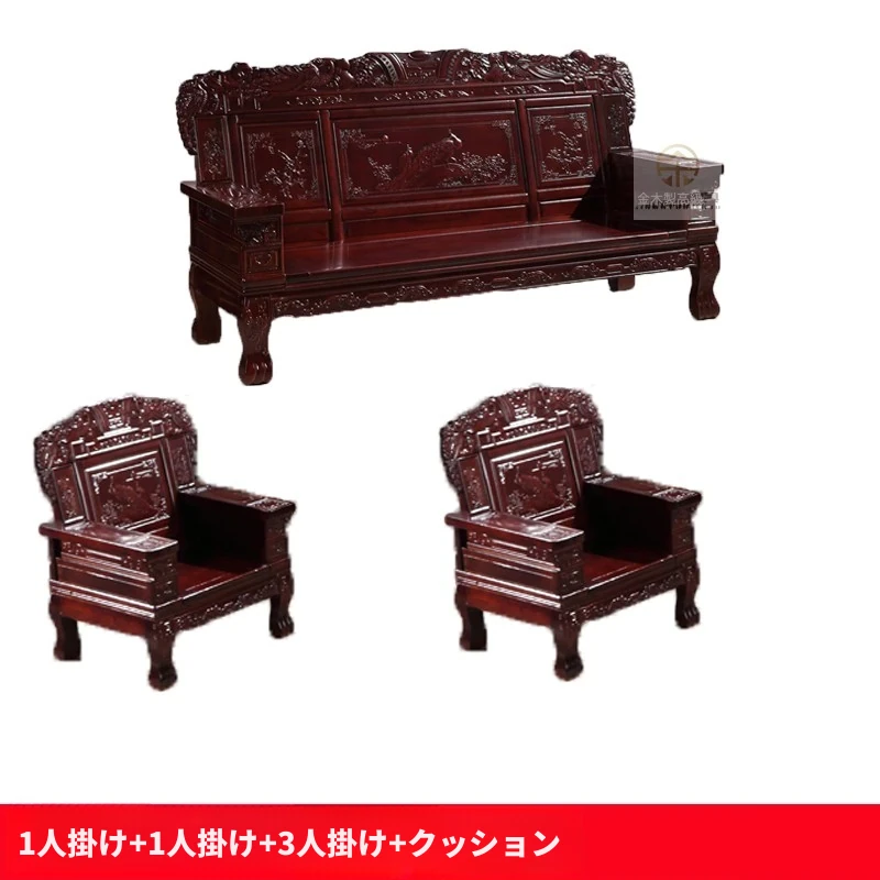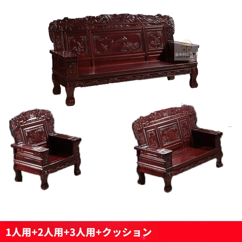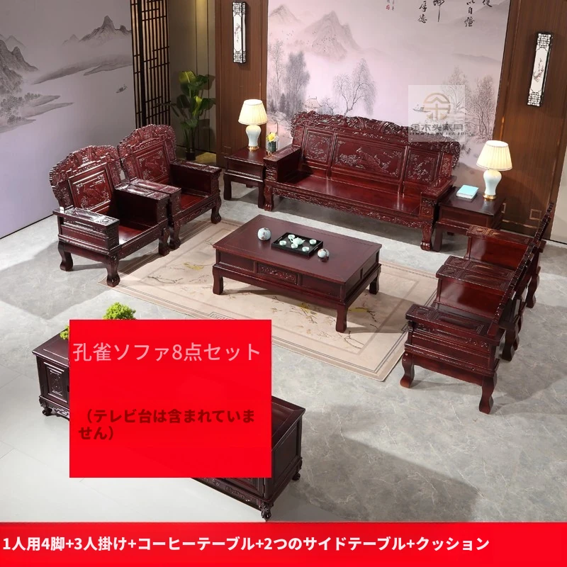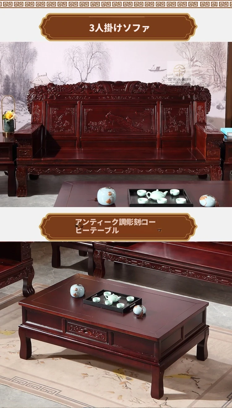 全実木製ソファ・テーブル・テレビキャビネットのフルセット!豪華な花梨風古典的デザインで、田舎の別荘にぴったりの彫刻入りソファ。あなたのリビングを優雅に演出します!