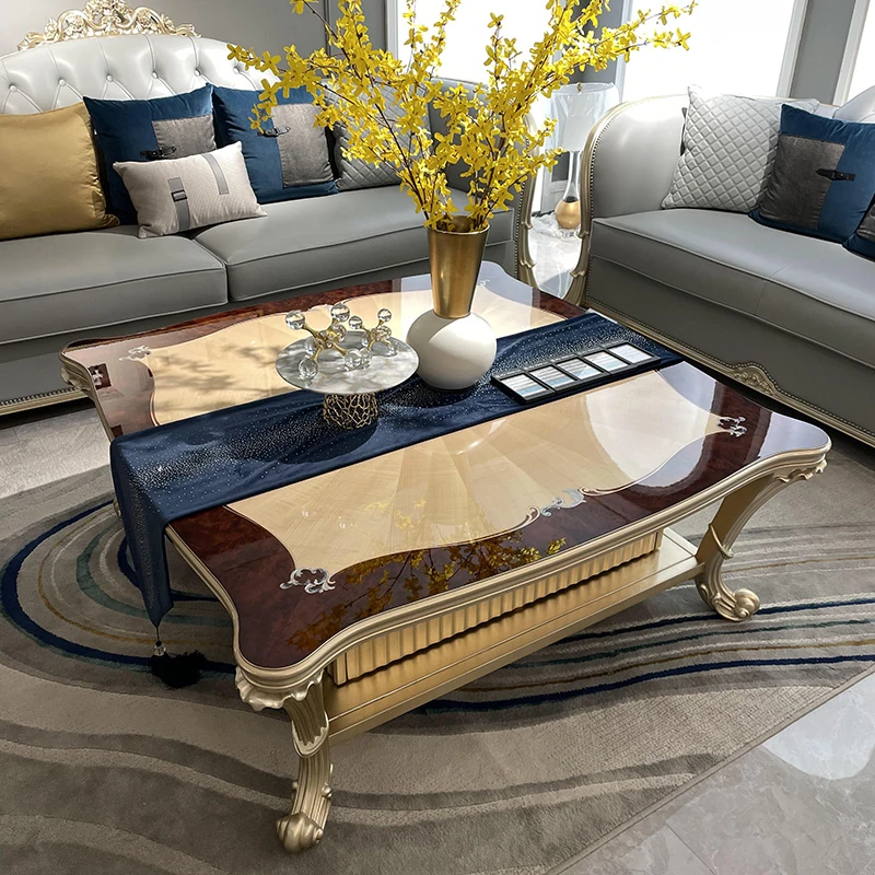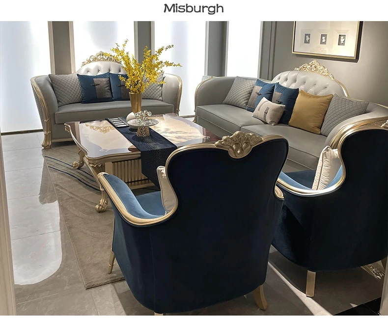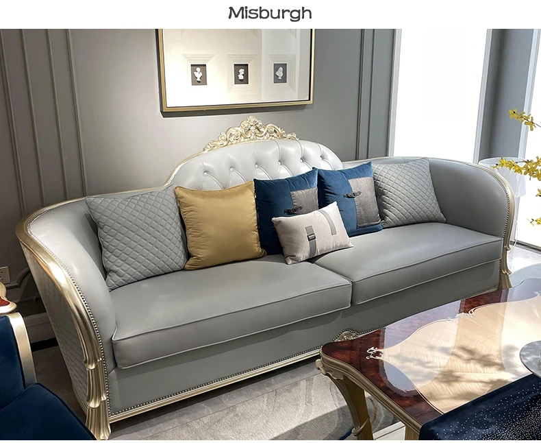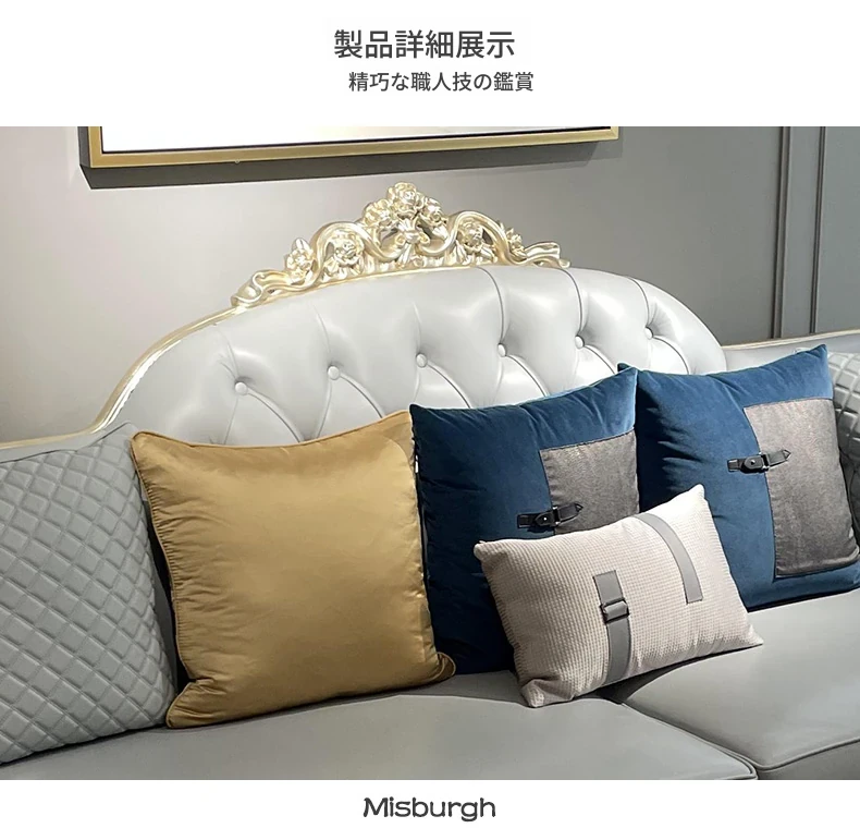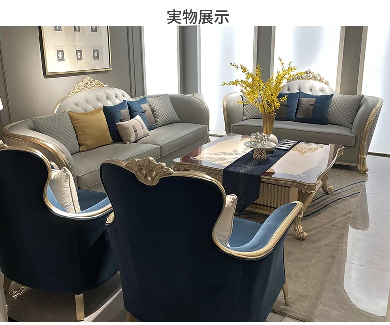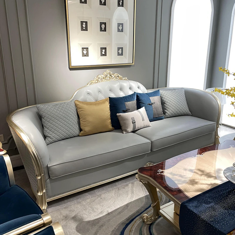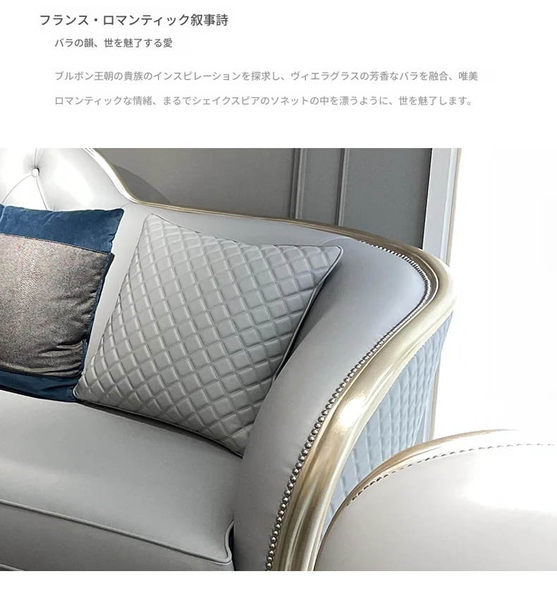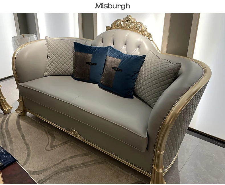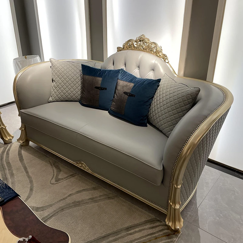 フランス製本革ソファー - 贅沢な無垢材のシャンパンゴールド、大型ヴィラに最適なリビングルーム用直置きソファー!エレガントな欧州家具で、上質なひとときをお楽しみください。