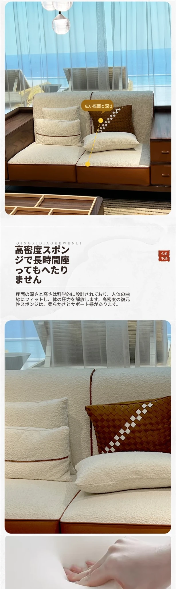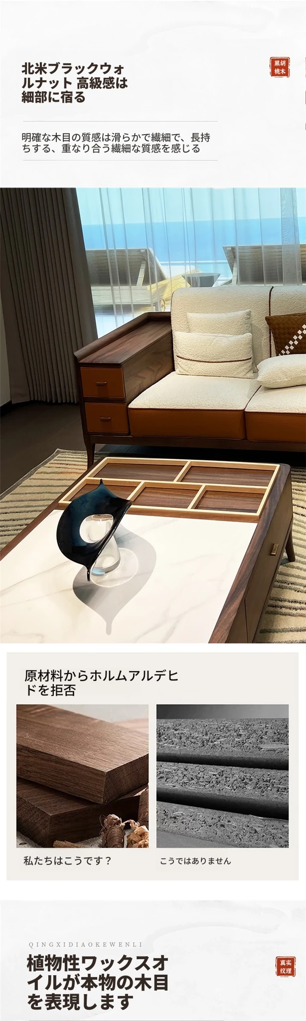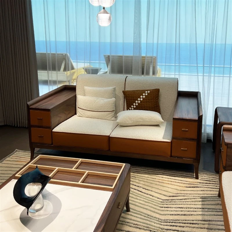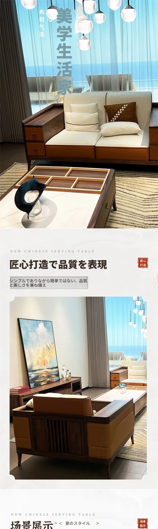 人気の新中式デザイン!北米産ブラックウォールナットを使用したモダンでシンプルなソファセット。高級感あふれる本革と無垢材の組み合わせで、リビングや別荘にぴったりの一品です。